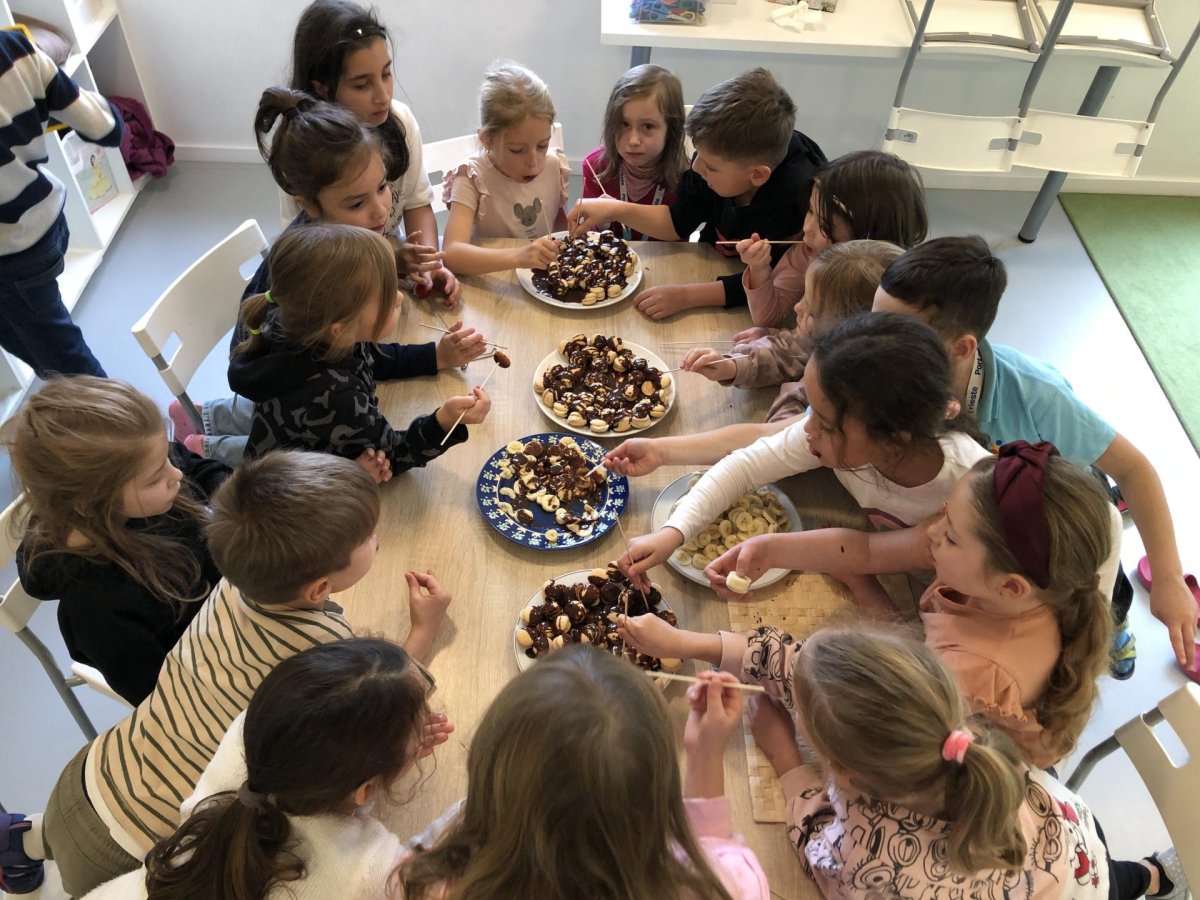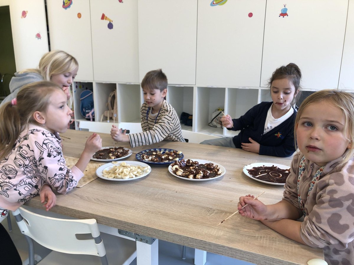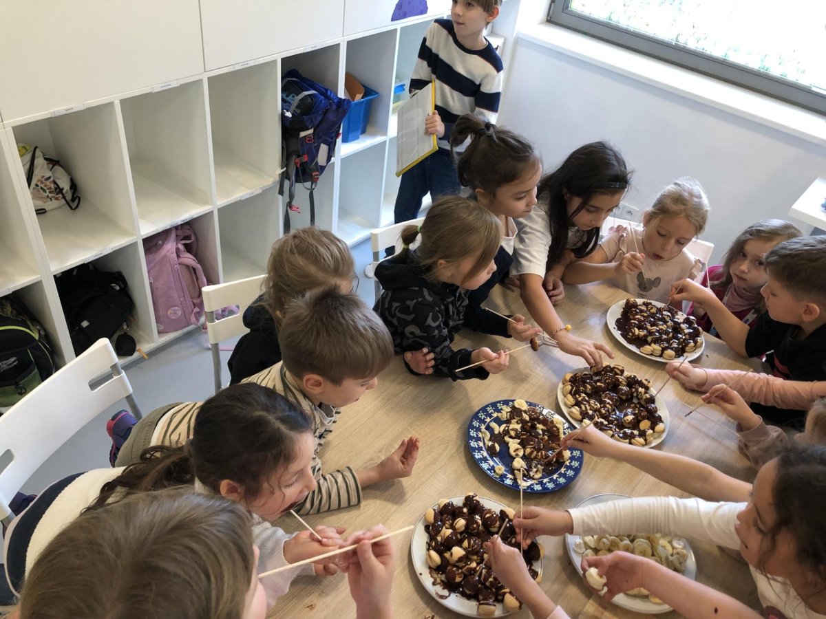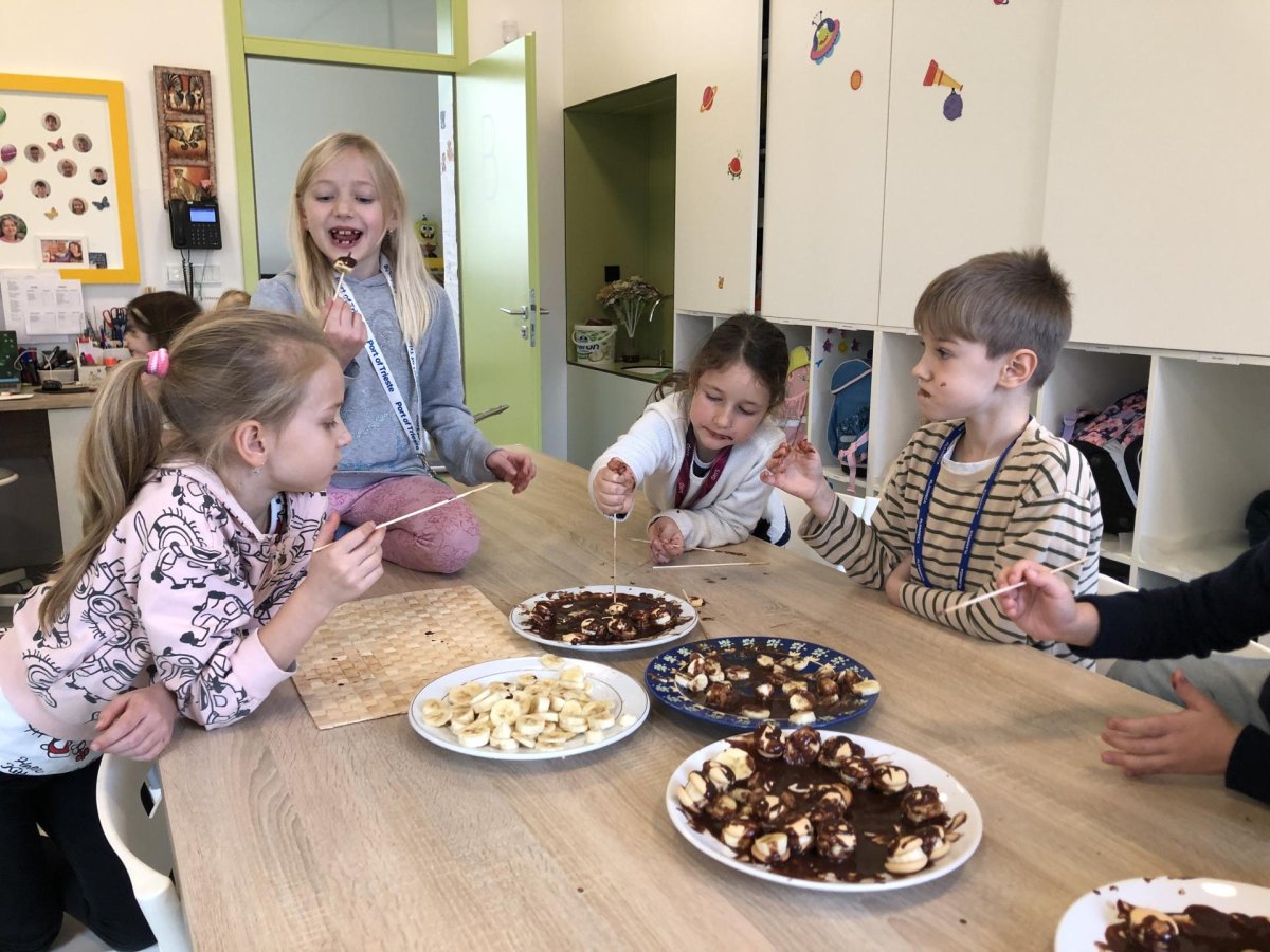 Nejprve si děti nakrájely banány, poté je spojily s piškotem a nakonec celé sladké dílko polily rozpuštěnou čokoládou. Práce je moc bavila, ale ještě víc je těšilo hotové dobroty ochutnávat.
