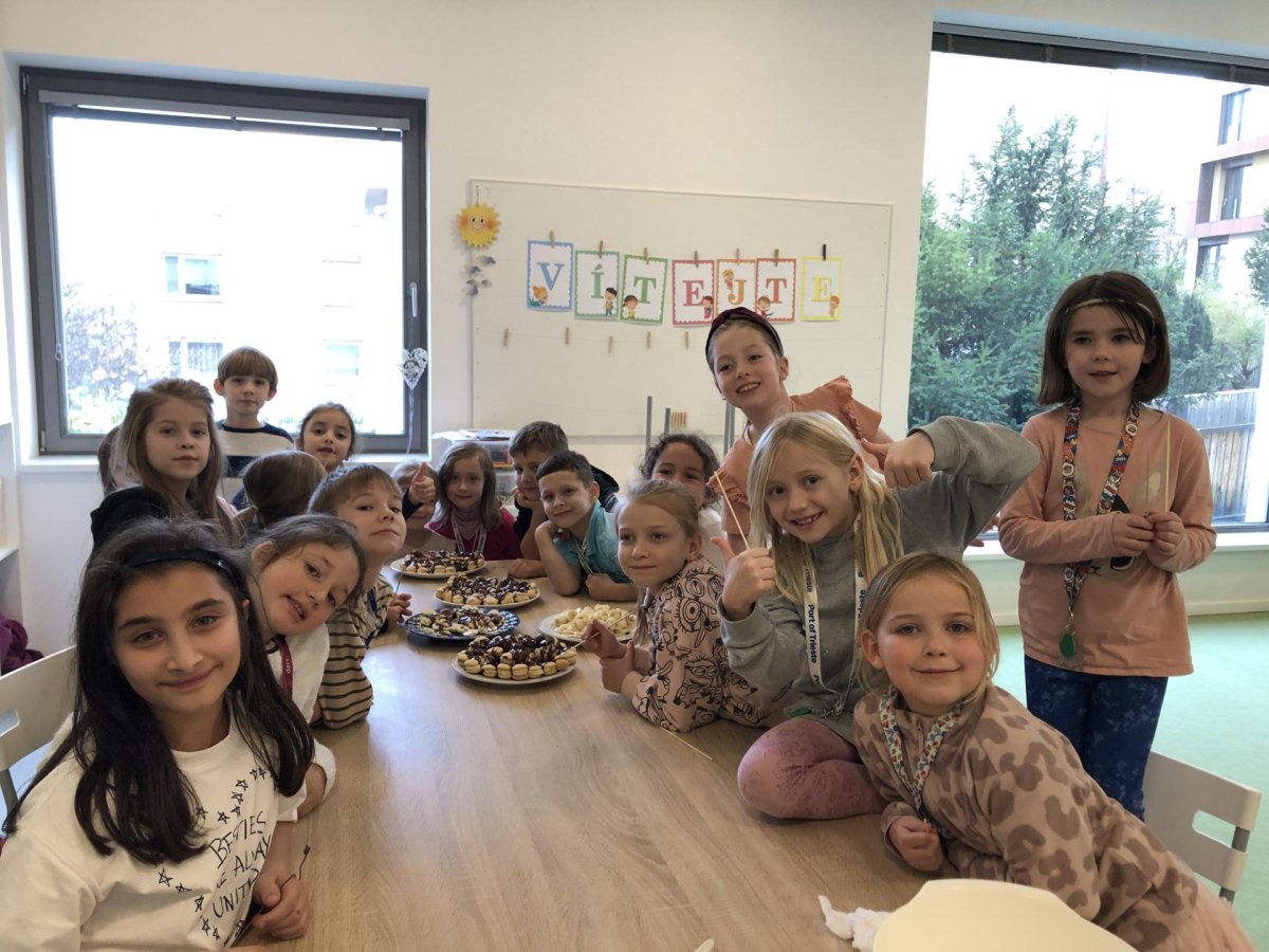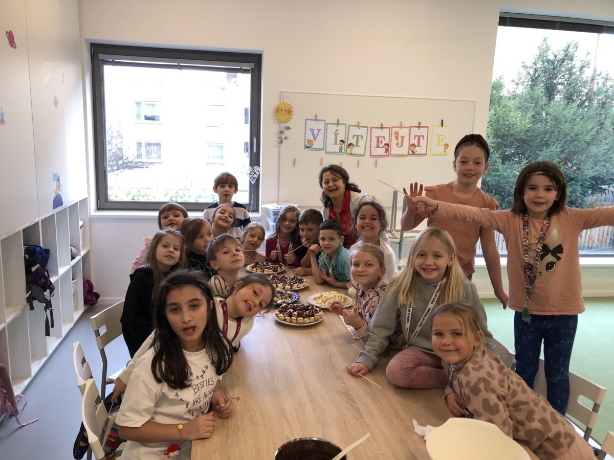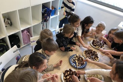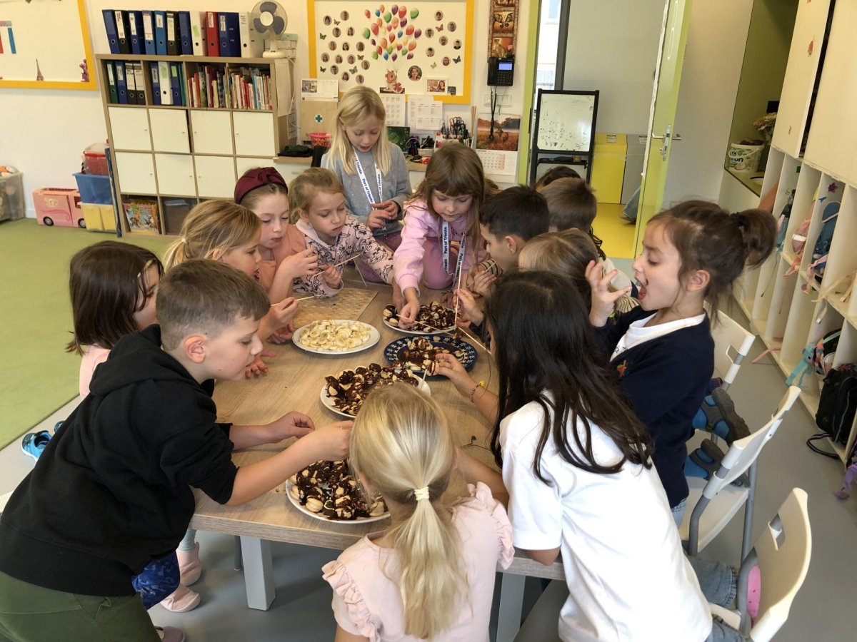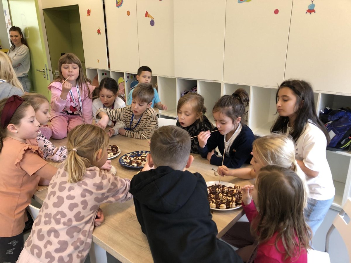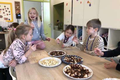 Nejprve si děti nakrájely banány, poté je spojily s piškotem a nakonec celé sladké dílko polily rozpuštěnou čokoládou. Práce je moc bavila, ale ještě víc je těšilo hotové dobroty ochutnávat.