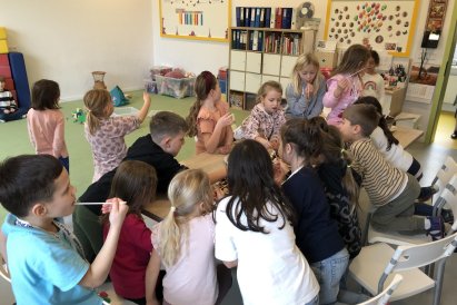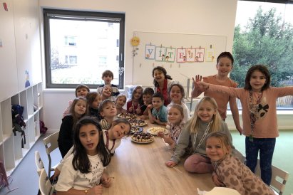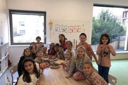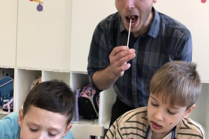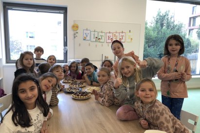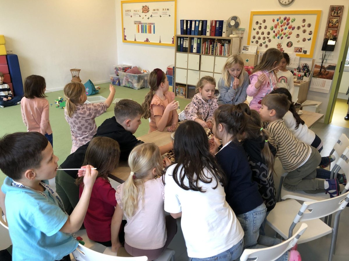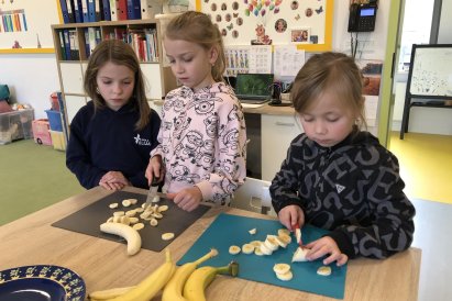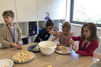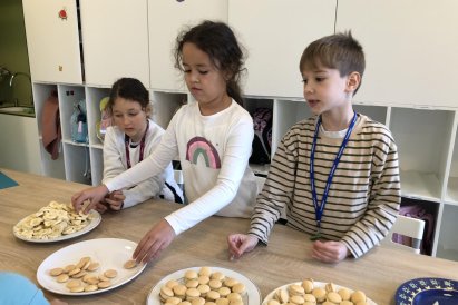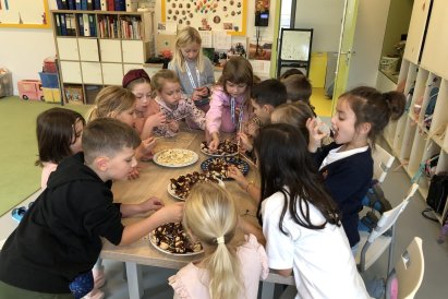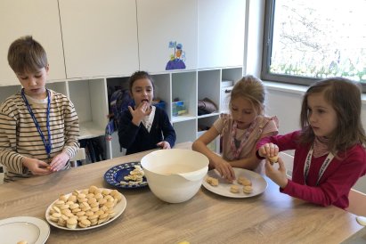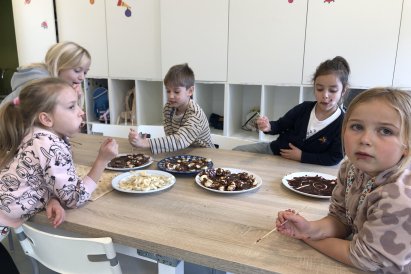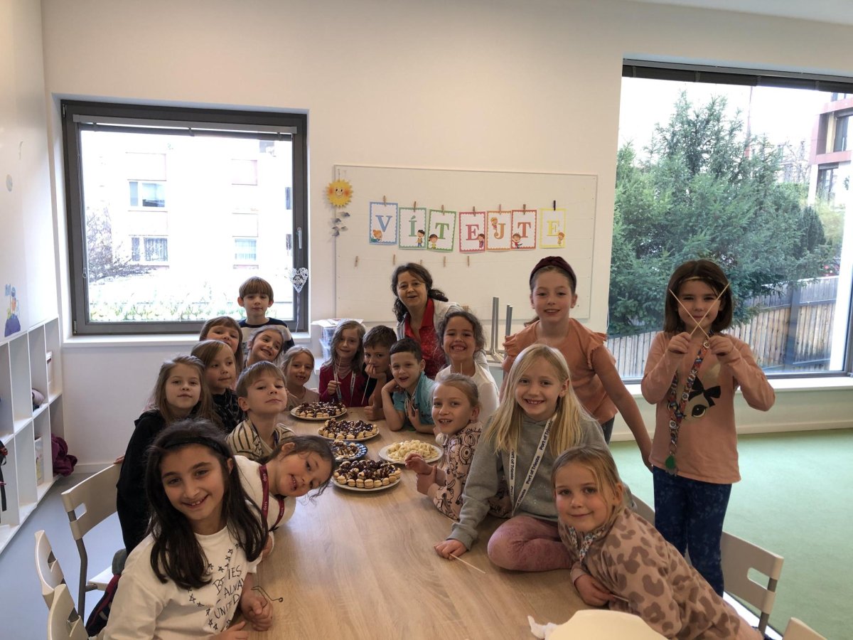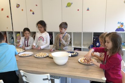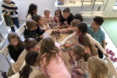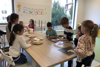 Nejprve si děti nakrájely banány, poté je spojily s piškotem a nakonec celé sladké dílko polily rozpuštěnou čokoládou. Práce je moc bavila, ale ještě víc je těšilo hotové dobroty ochutnávat.