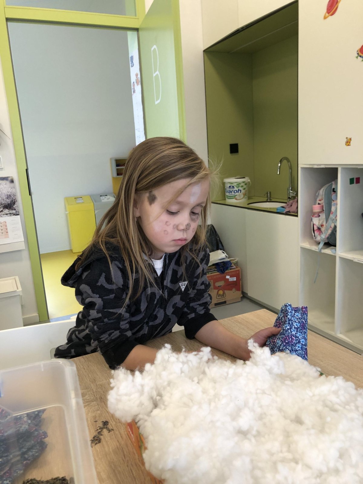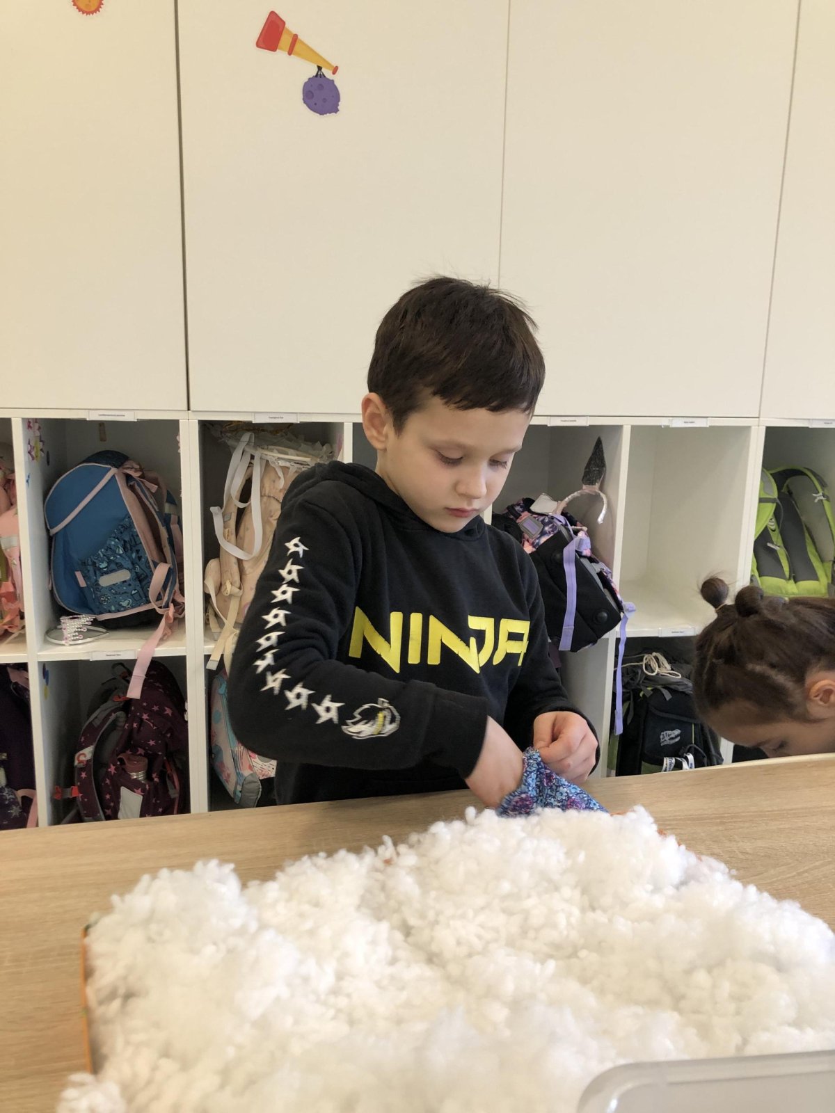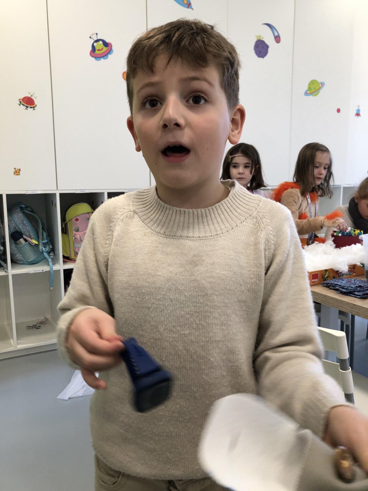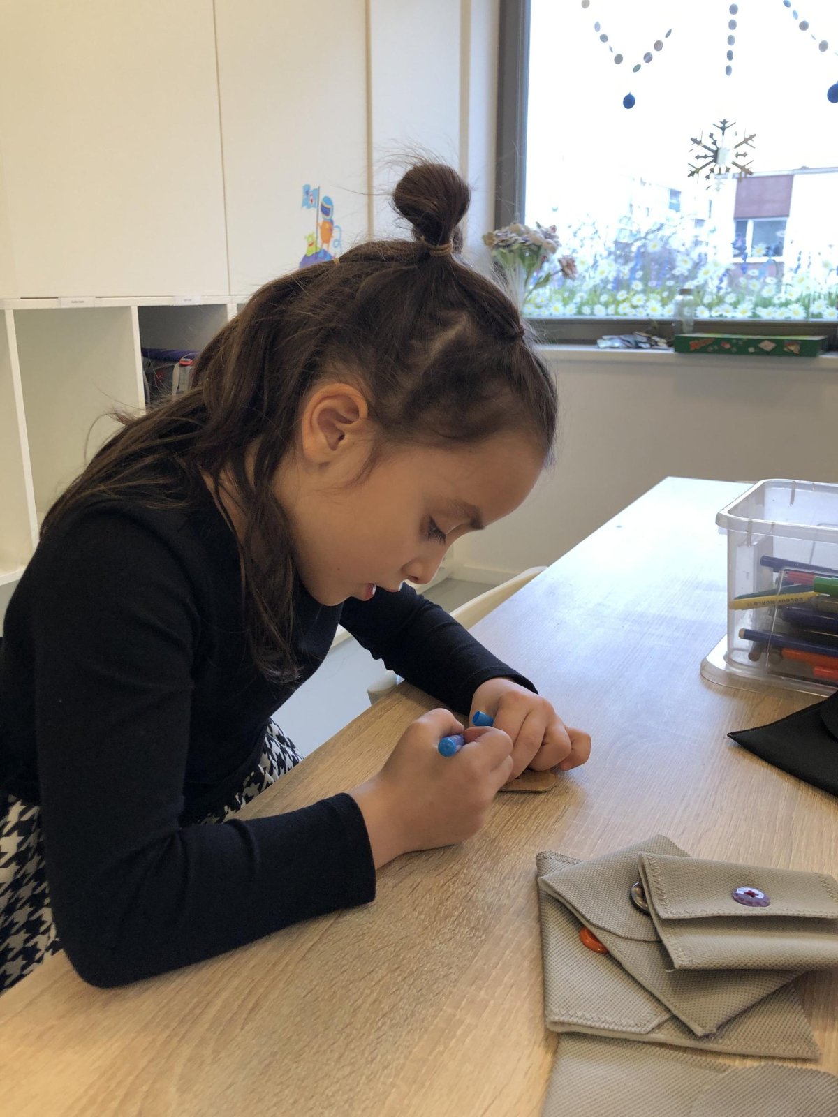 Dnes jsme měli tvořivý den. Zdobili jsme taštičky, které jsme si vzali s sebou domů, plnili jsme polštářky s levandulí na jarmark a barvili jsme kastaněty na jarmark. Práce bylo opravdu hodně, ale vše jsme s pomocí paní vychovatelky dobře zvládli. Po práci jsme si postavili domeček a hráli si až do konce družiny.
