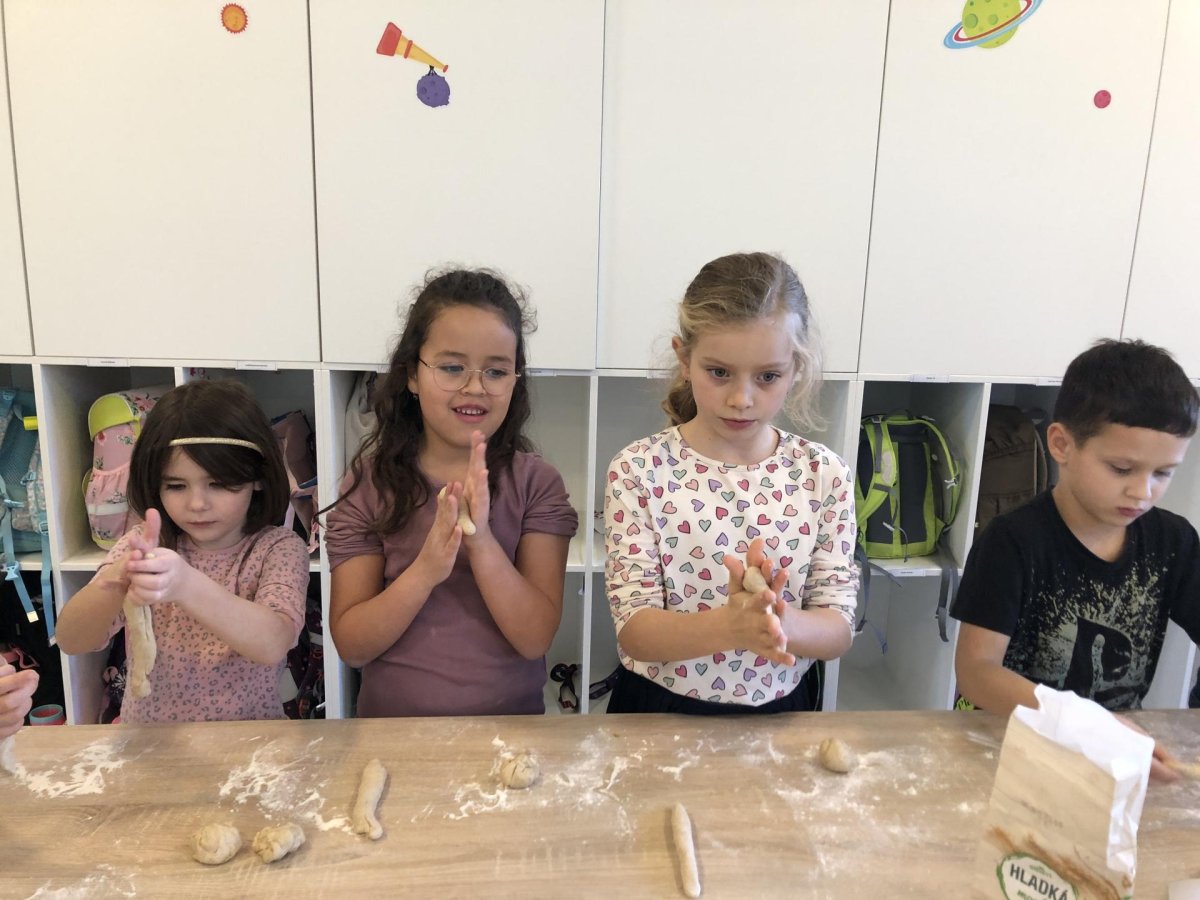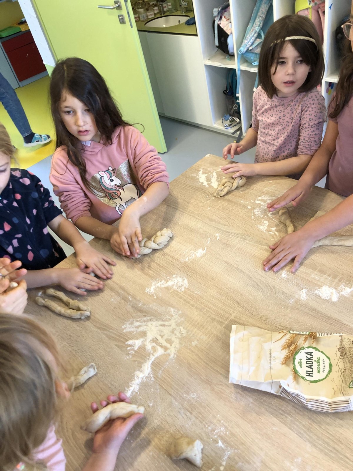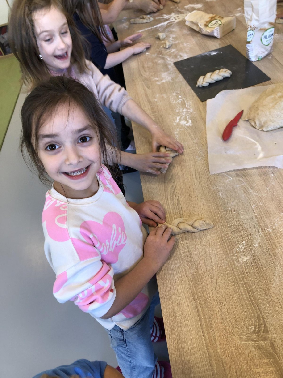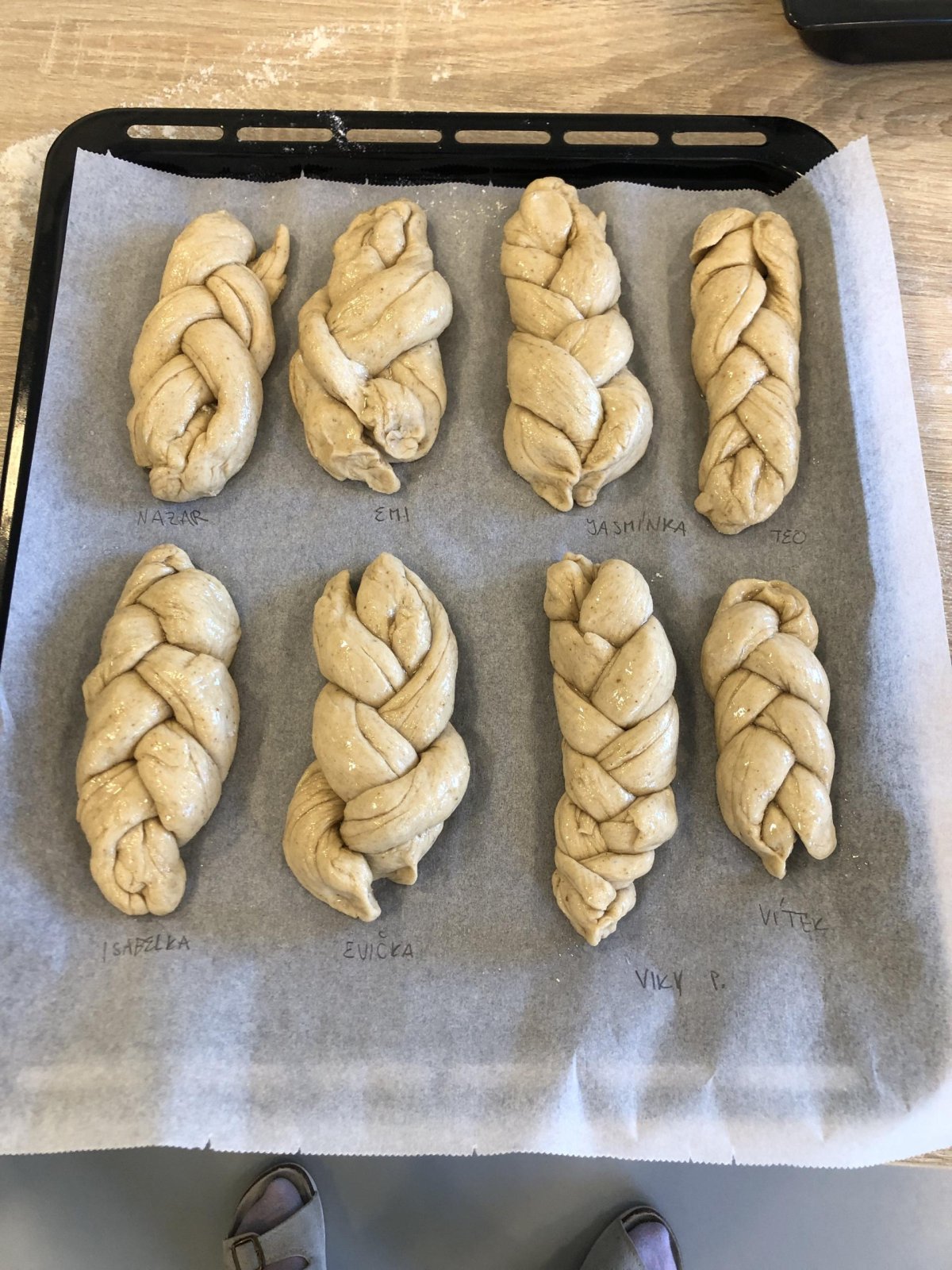 Když jsme se naobědvali, čekalo na nás překvapení — každý z nás dostal svůj vlastní kousek těsta. Pustili jsme se do pletení houstiček. Některé byly tenké a dlouhé, jiné baculaté a krátké, ale všechny jsme dělali s obrovským nadšením. Hotové housky jsme opatrně položili na plech a celý plech putoval do trouby.