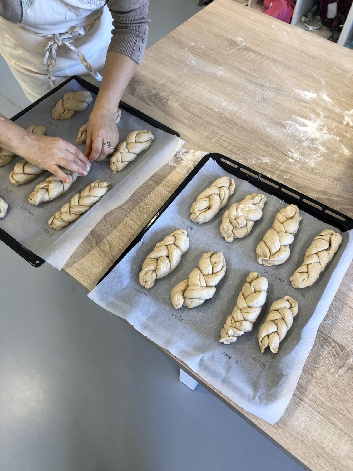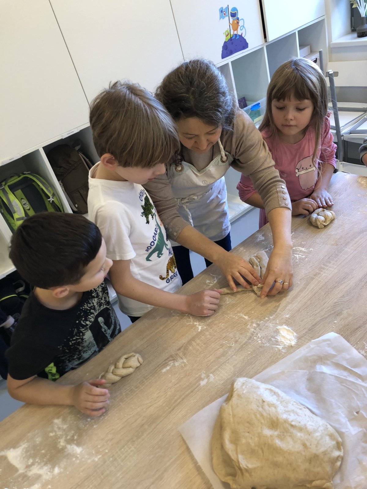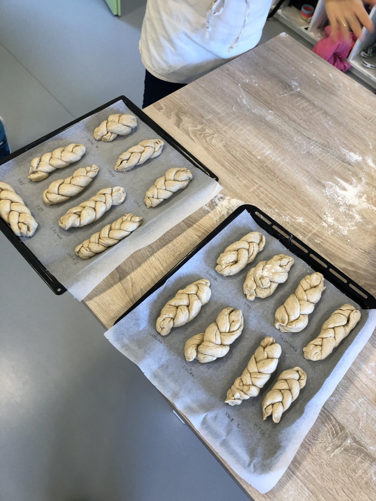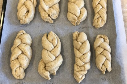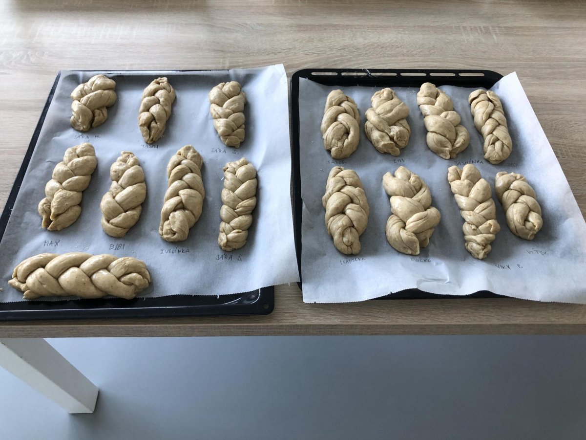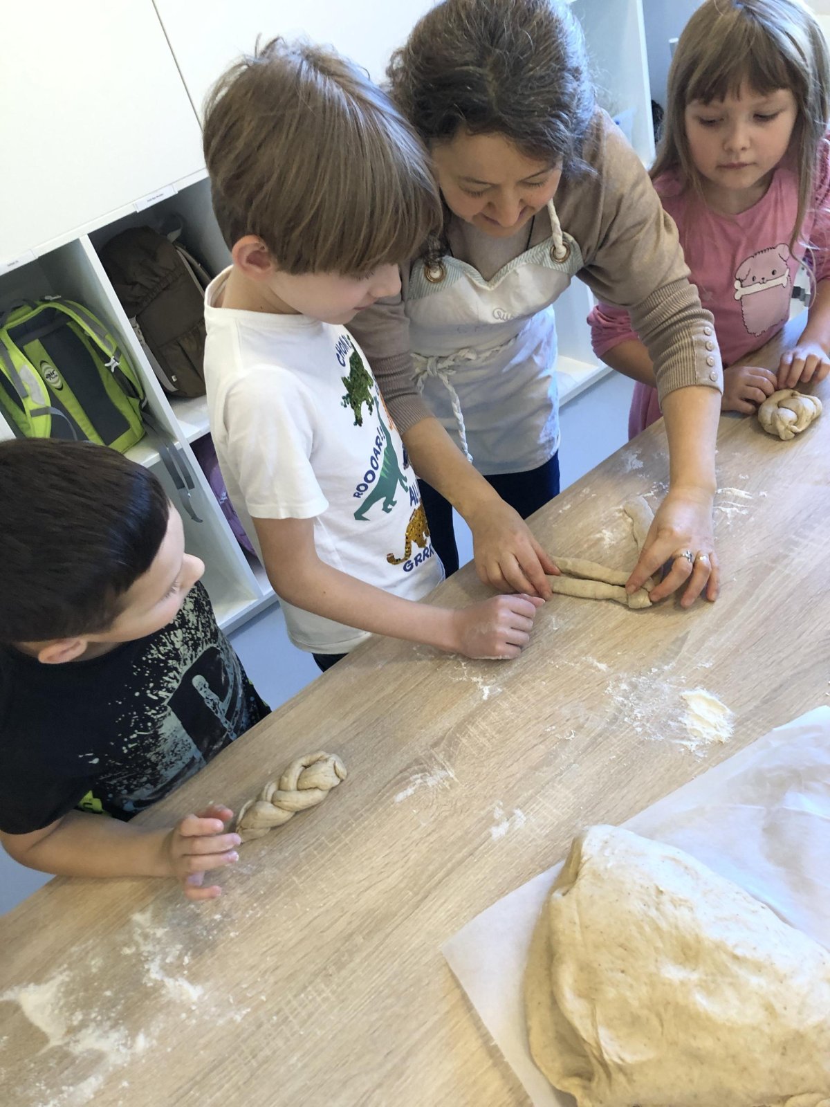 Když jsme se naobědvali, čekalo na nás překvapení — každý z nás dostal svůj vlastní kousek těsta. Pustili jsme se do pletení houstiček. Některé byly tenké a dlouhé, jiné baculaté a krátké, ale všechny jsme dělali s obrovským nadšením. Hotové housky jsme opatrně položili na plech a celý plech putoval do trouby.