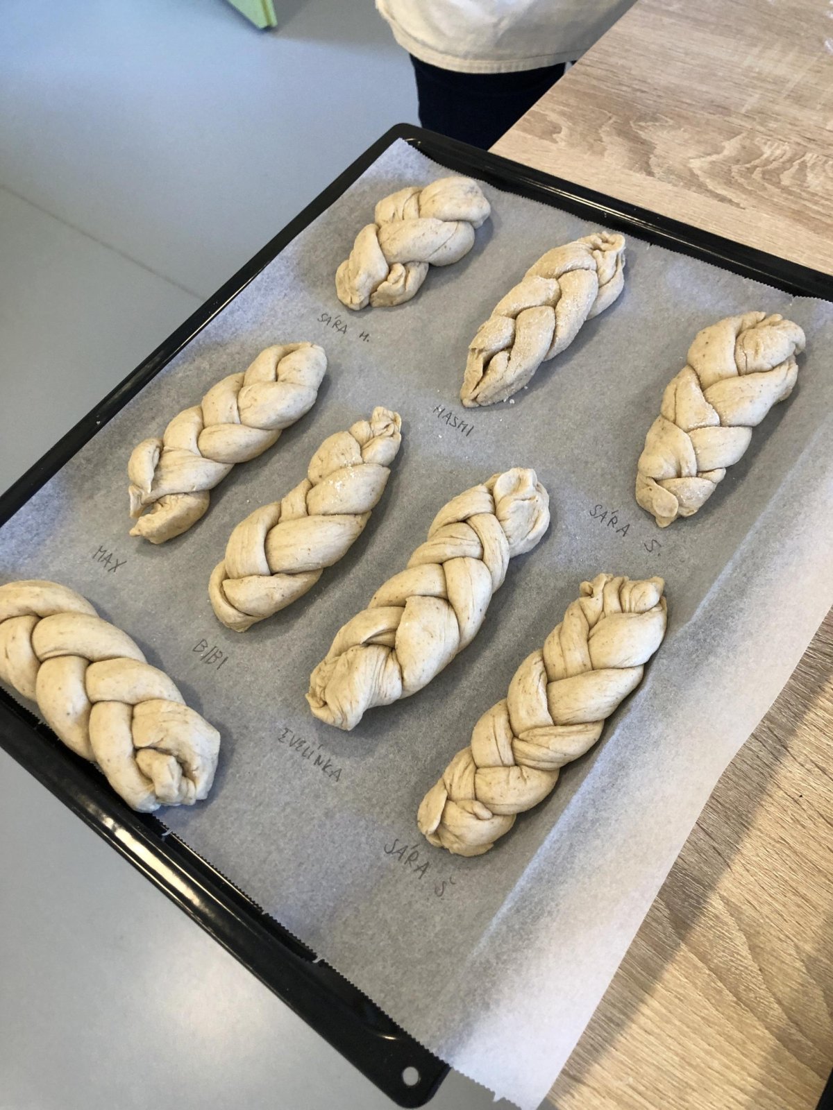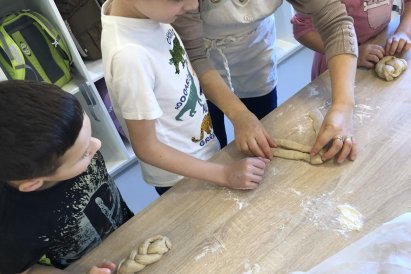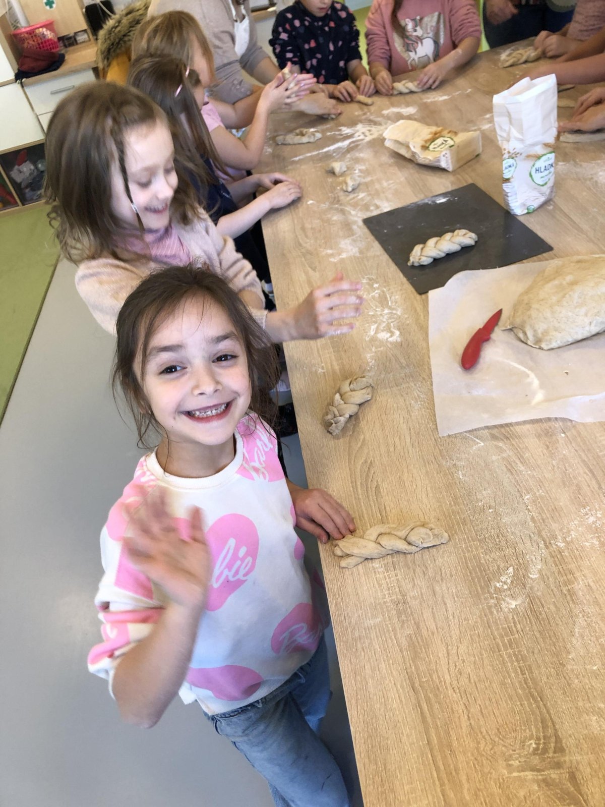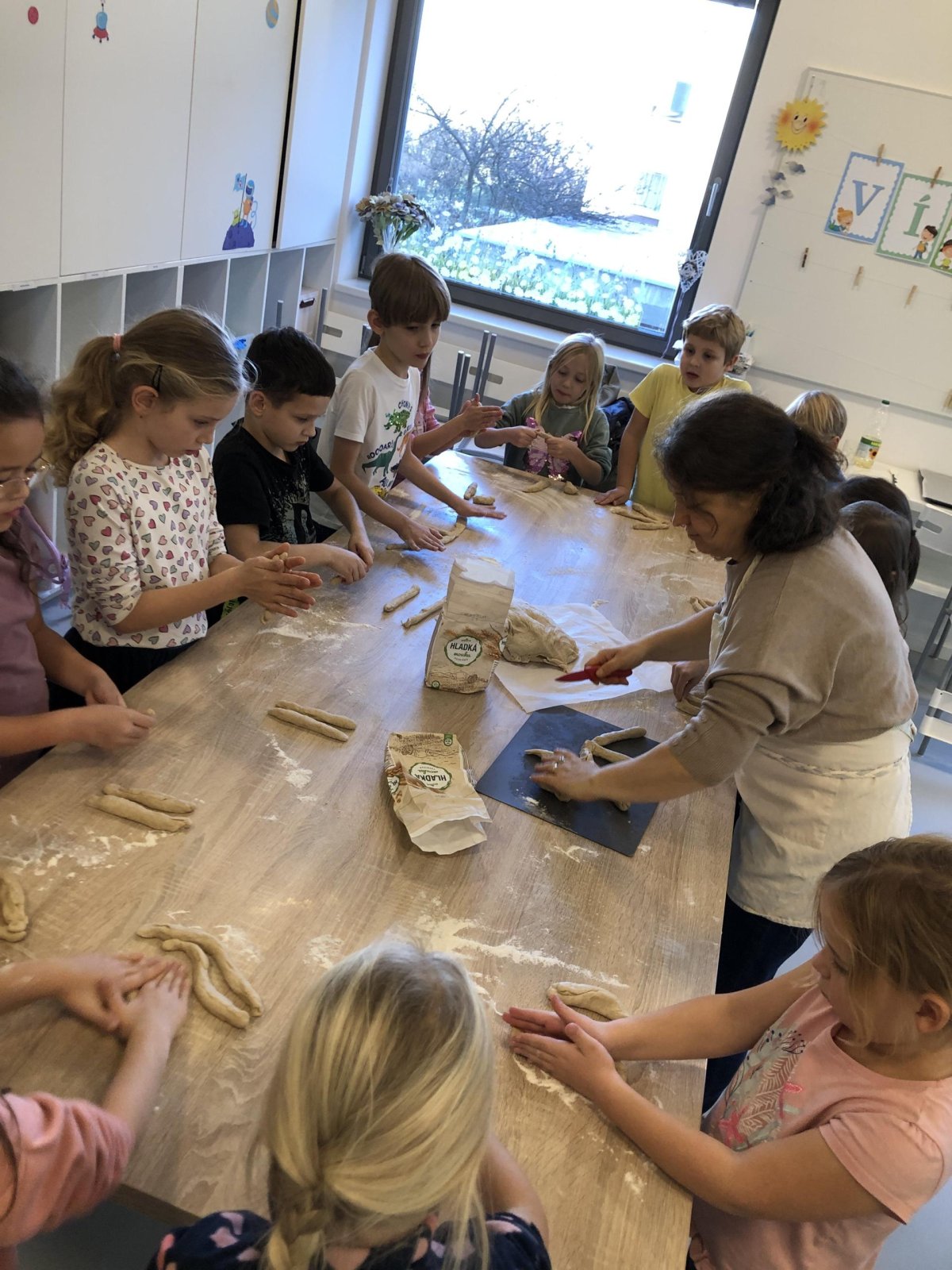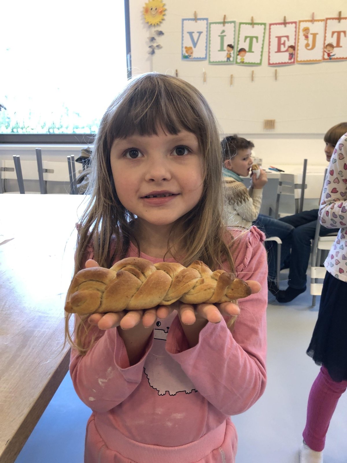 Když jsme se naobědvali, čekalo na nás překvapení — každý z nás dostal svůj vlastní kousek těsta. Pustili jsme se do pletení houstiček. Některé byly tenké a dlouhé, jiné baculaté a krátké, ale všechny jsme dělali s obrovským nadšením. Hotové housky jsme opatrně položili na plech a celý plech putoval do trouby.