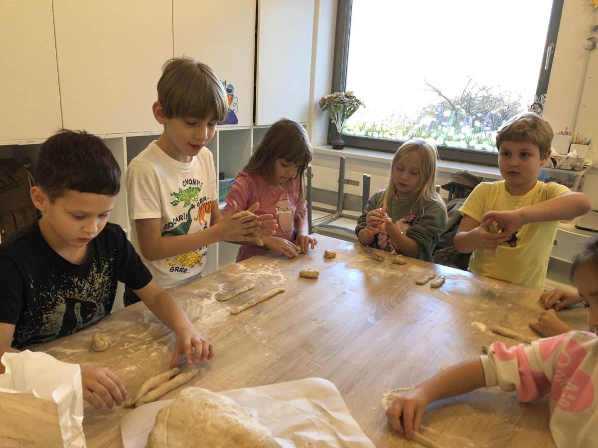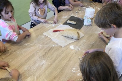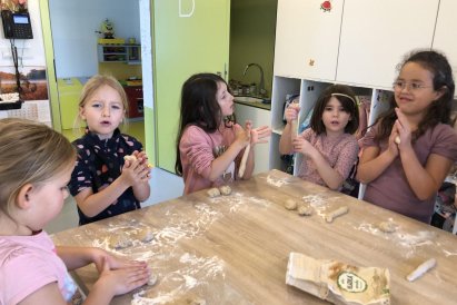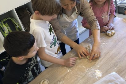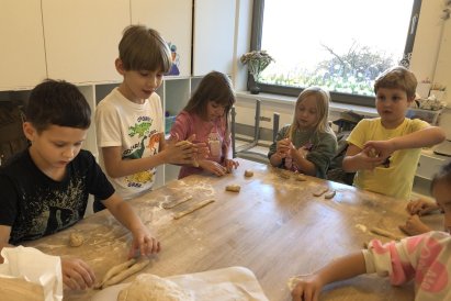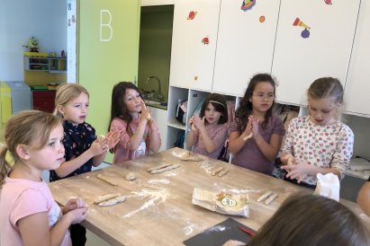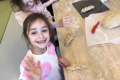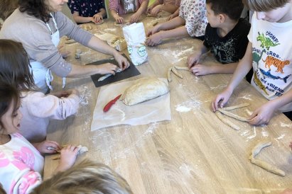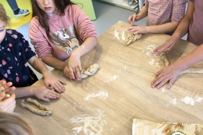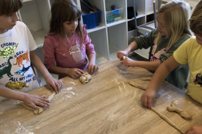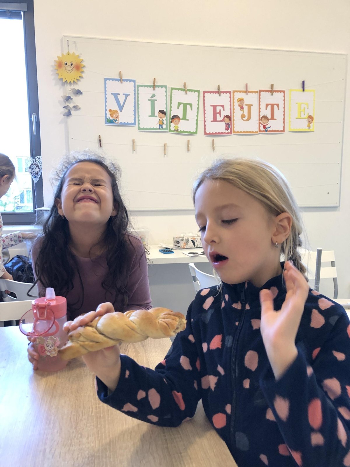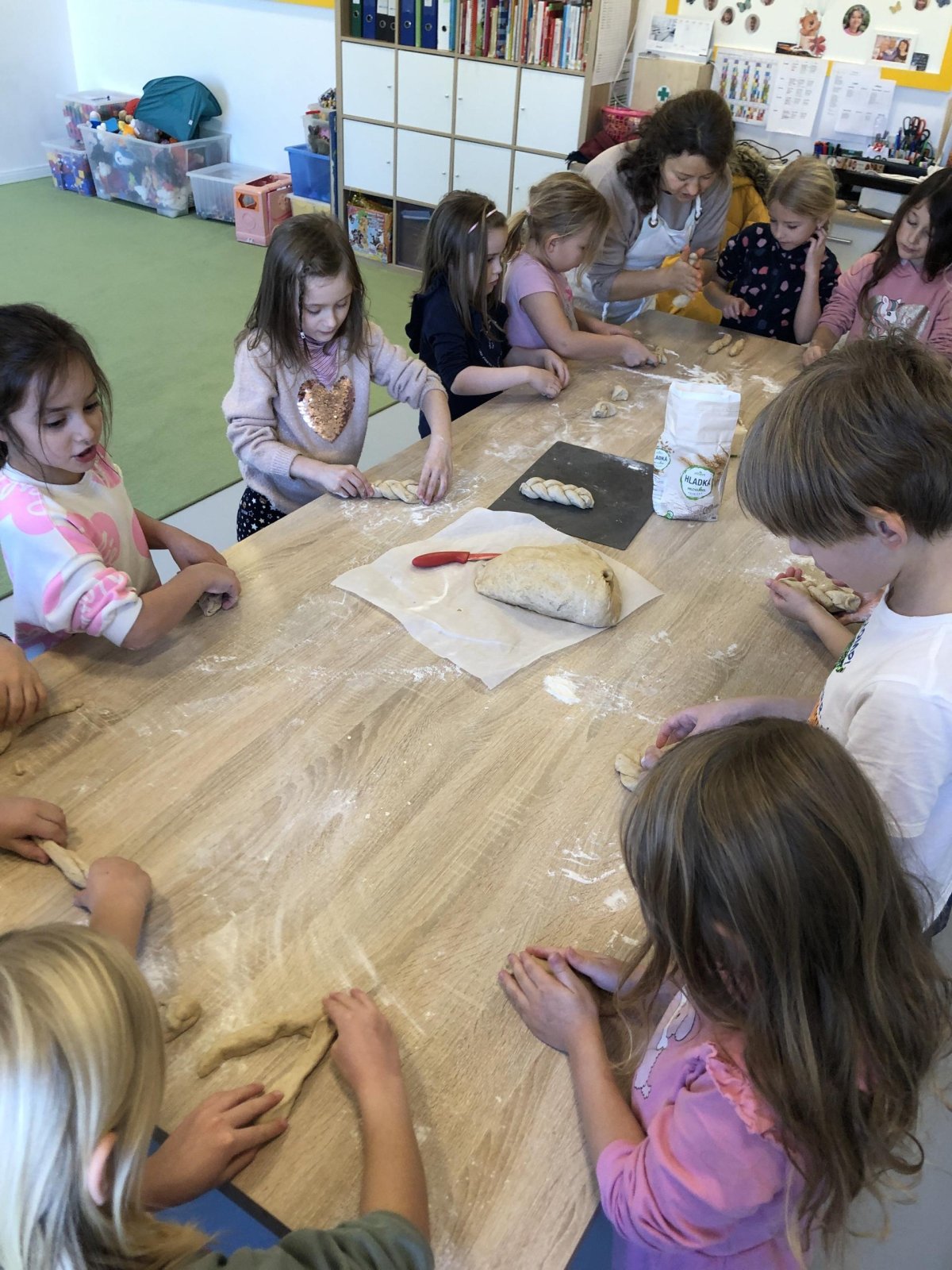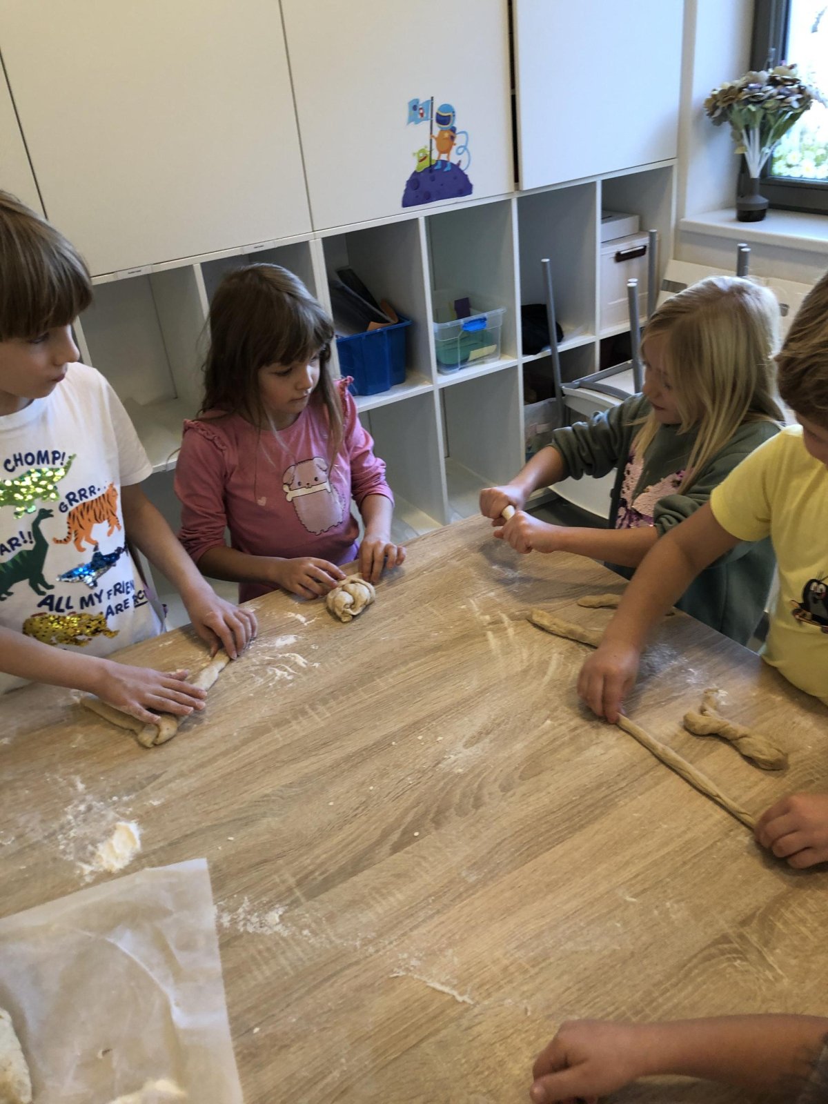 Když jsme se naobědvali, čekalo na nás překvapení — každý z nás dostal svůj vlastní kousek těsta. Pustili jsme se do pletení houstiček. Některé byly tenké a dlouhé, jiné baculaté a krátké, ale všechny jsme dělali s obrovským nadšením. Hotové housky jsme opatrně položili na plech a celý plech putoval do trouby.