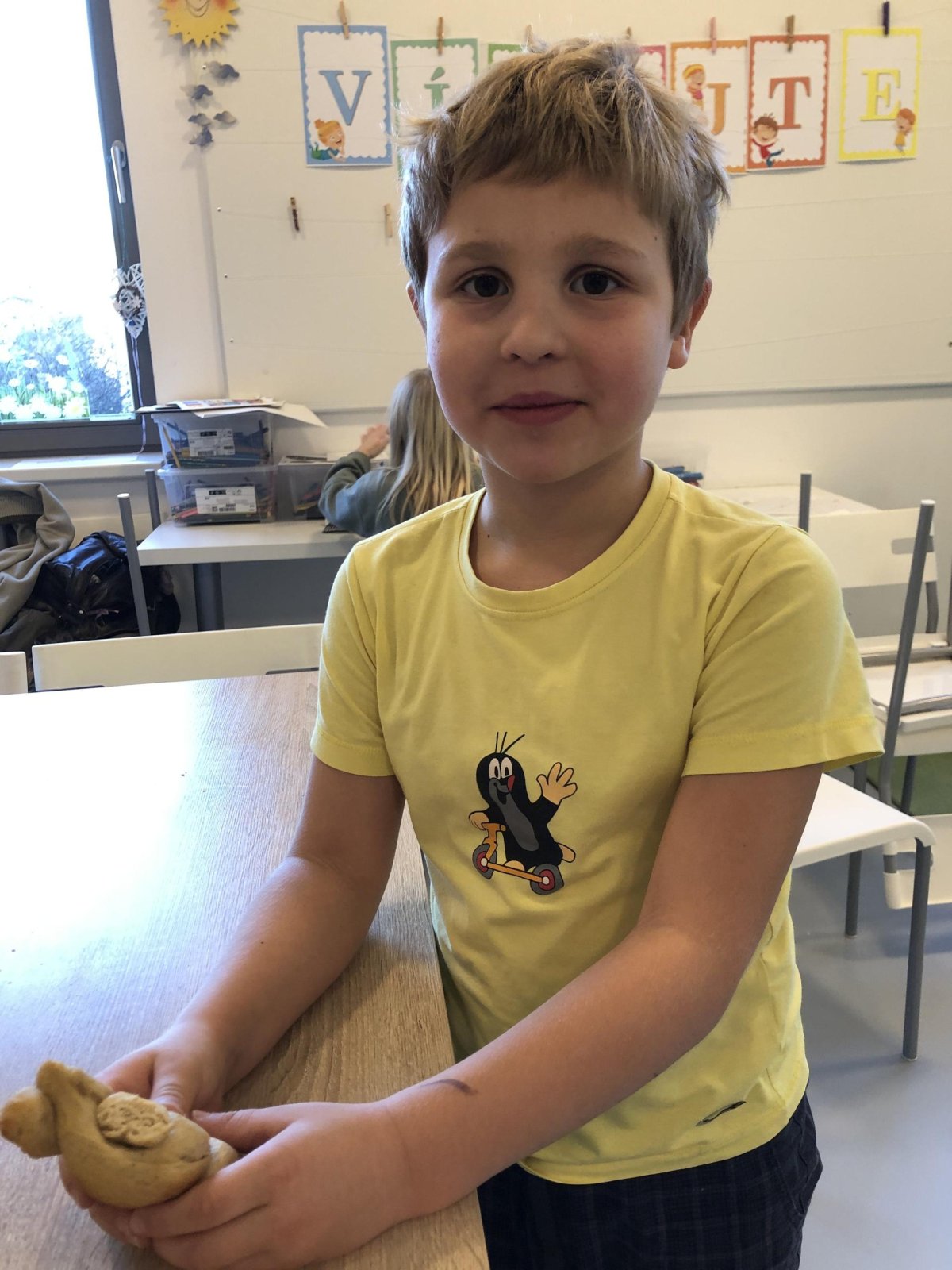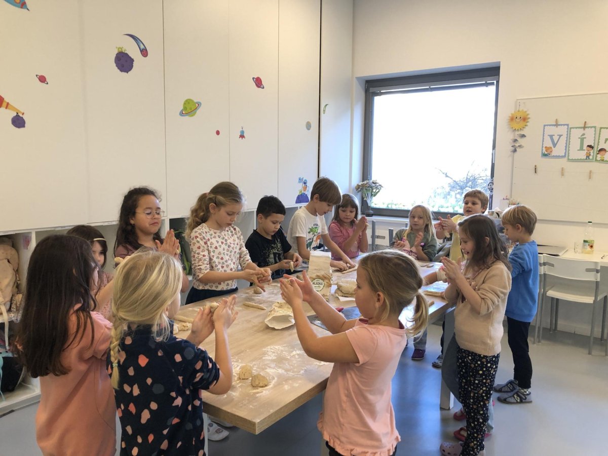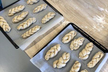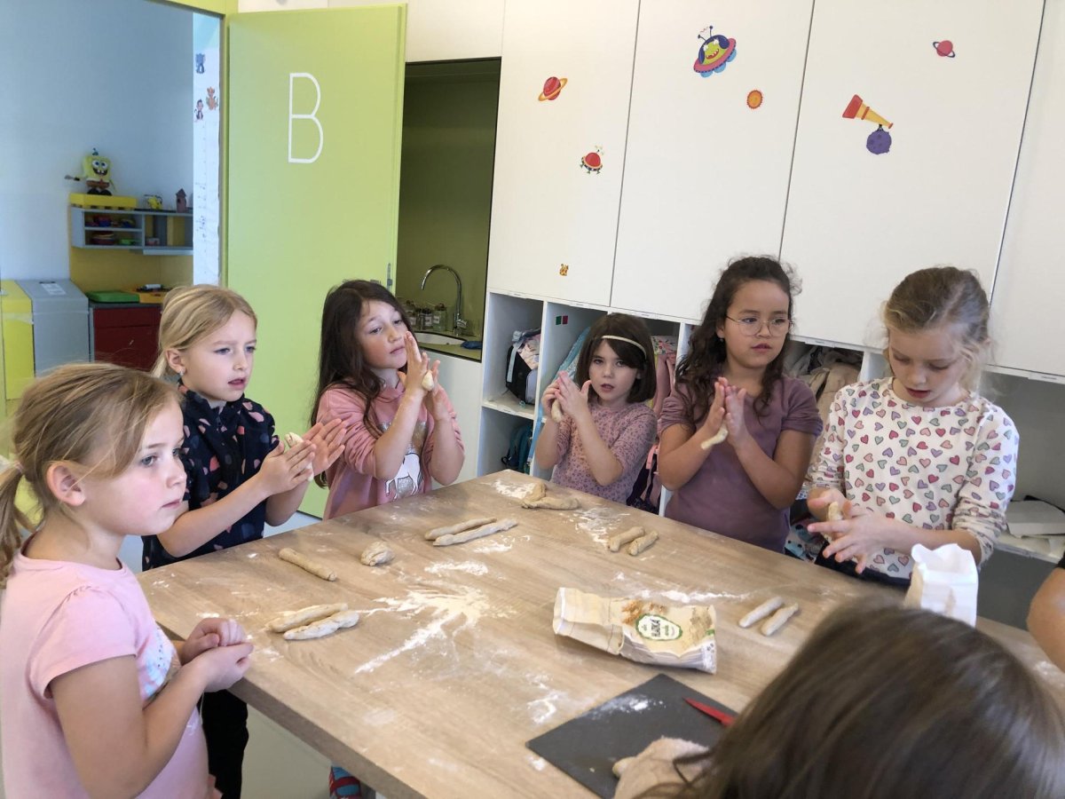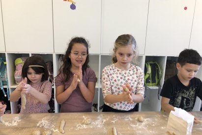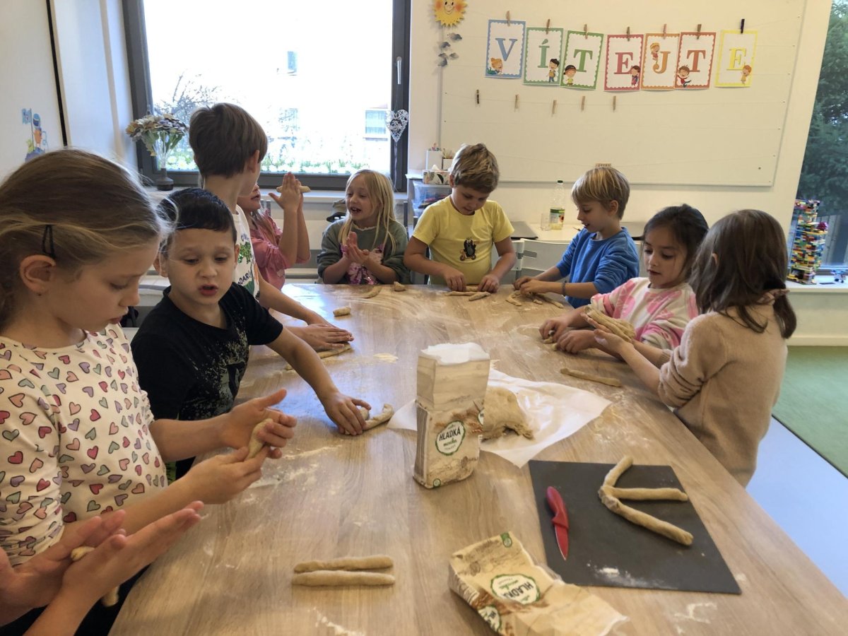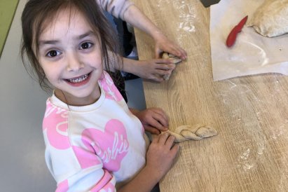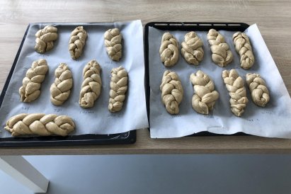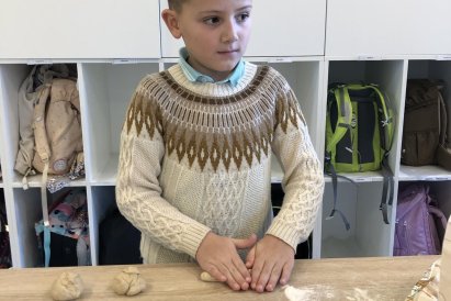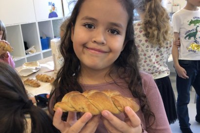Když jsme se naobědvali, čekalo na nás překvapení — každý z nás dostal svůj vlastní kousek těsta. Pustili jsme se do pletení houstiček. Některé byly tenké a dlouhé, jiné baculaté a krátké, ale všechny jsme dělali s obrovským nadšením. Hotové housky jsme opatrně položili na plech a celý plech putoval do trouby.