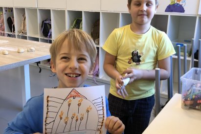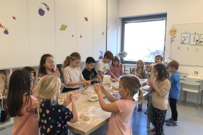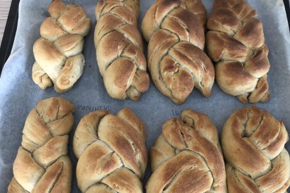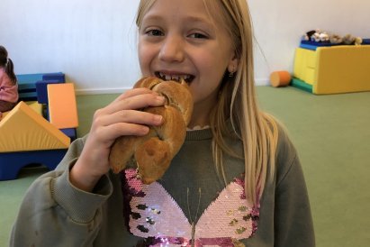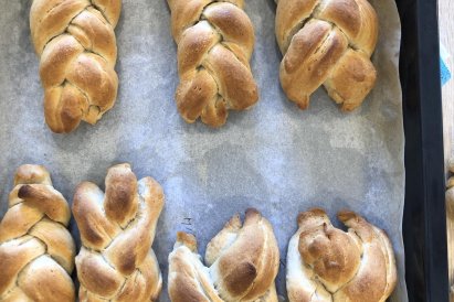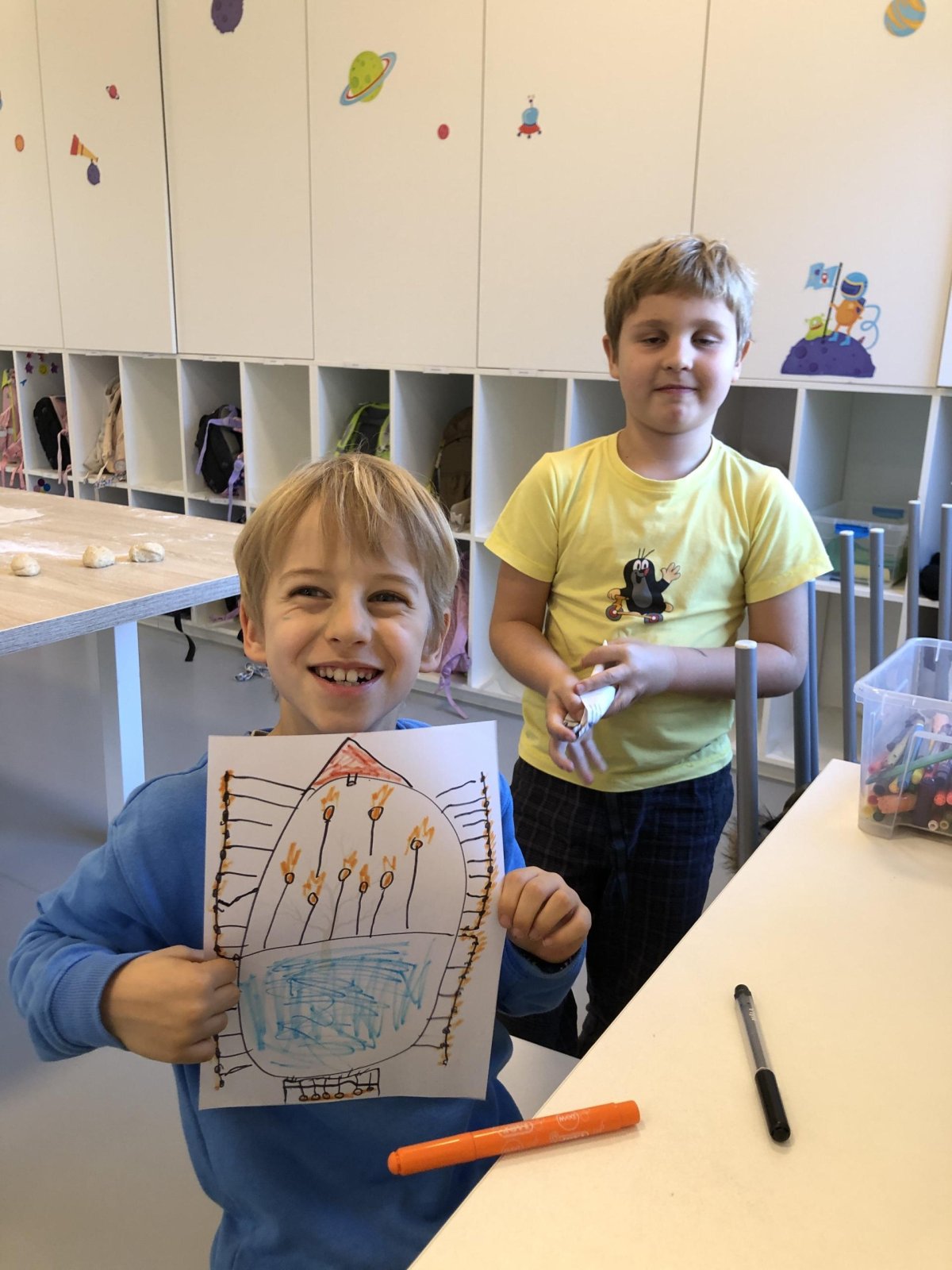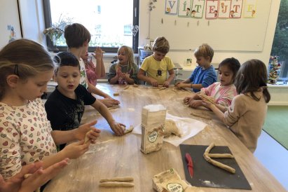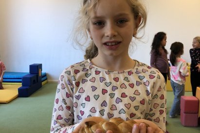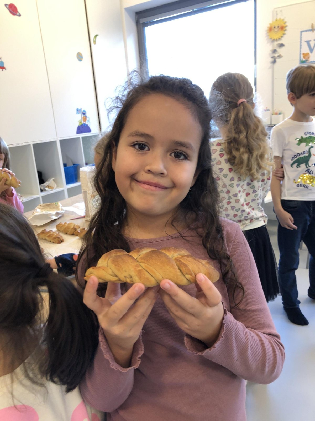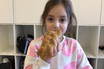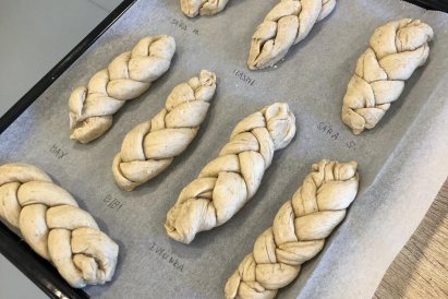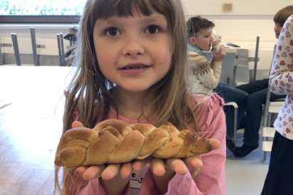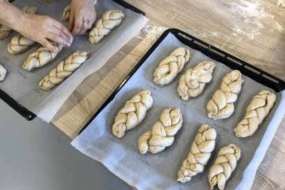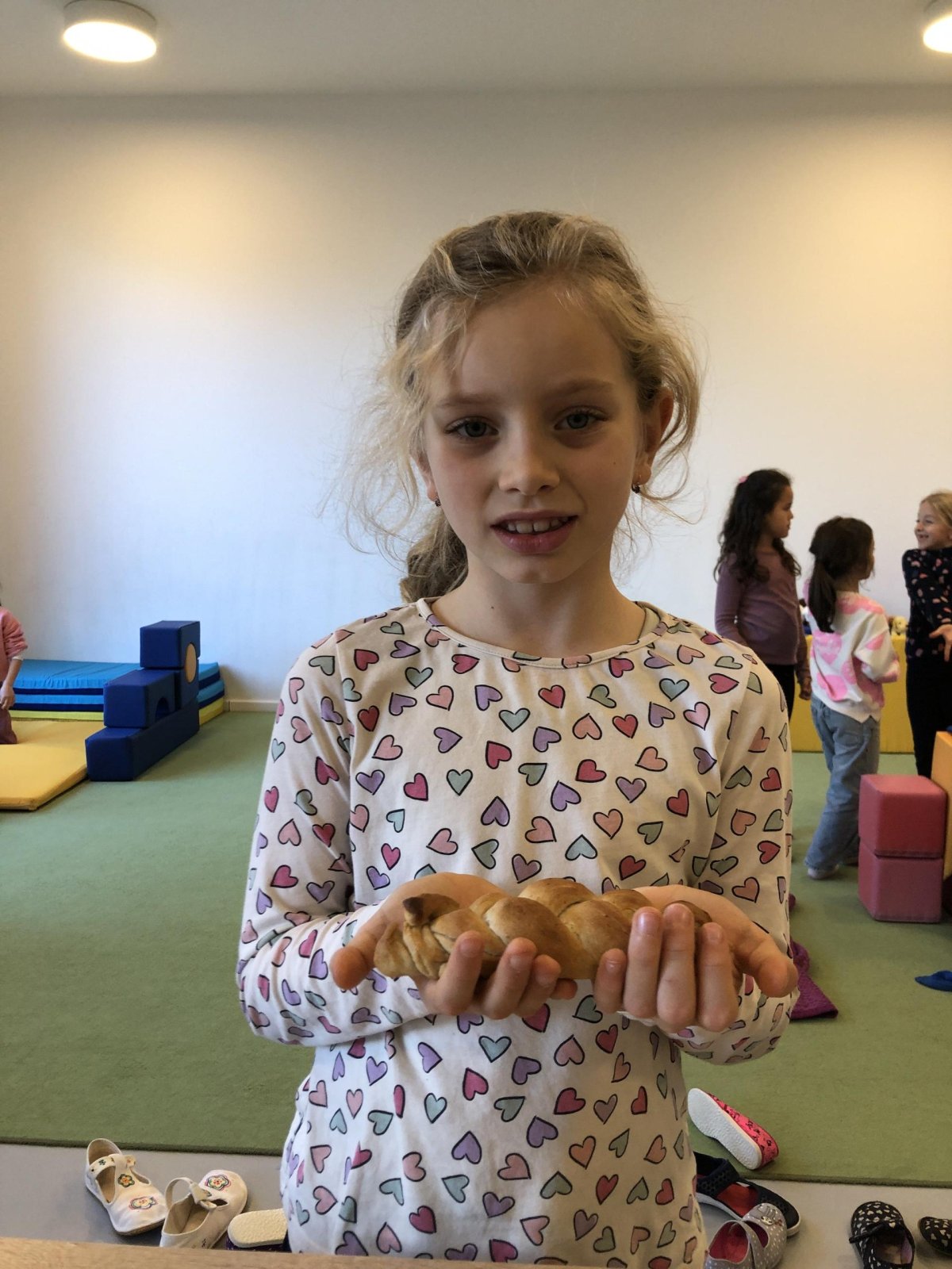 Když jsme se naobědvali, čekalo na nás překvapení — každý z nás dostal svůj vlastní kousek těsta. Pustili jsme se do pletení houstiček. Některé byly tenké a dlouhé, jiné baculaté a krátké, ale všechny jsme dělali s obrovským nadšením. Hotové housky jsme opatrně položili na plech a celý plech putoval do trouby.