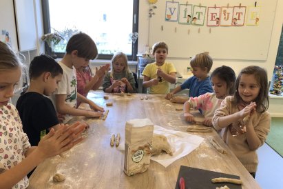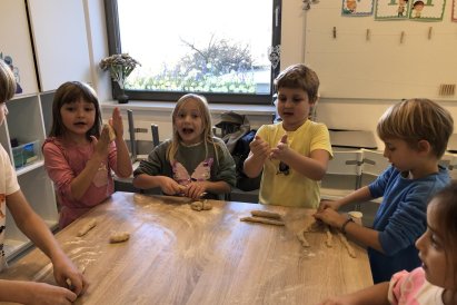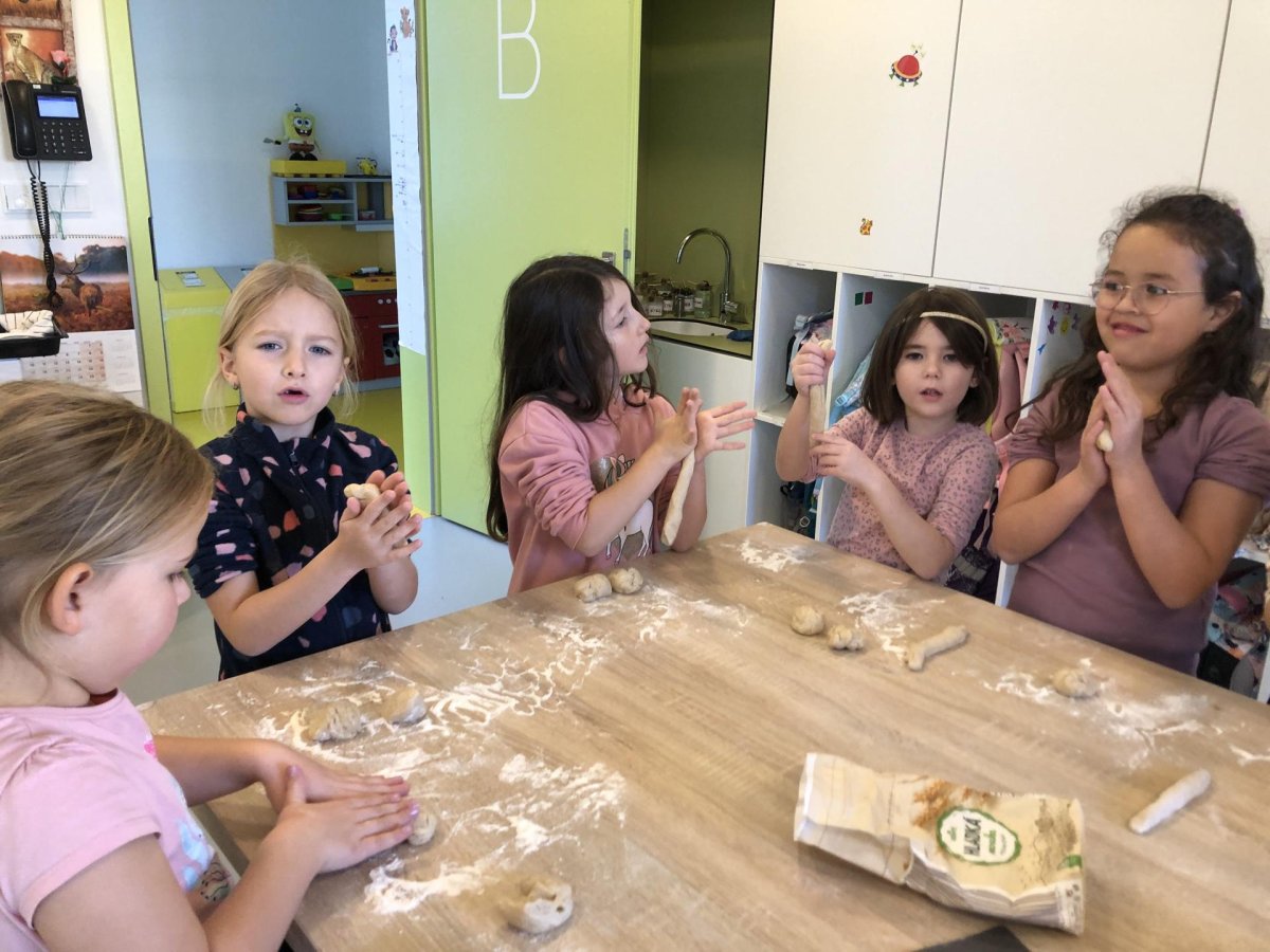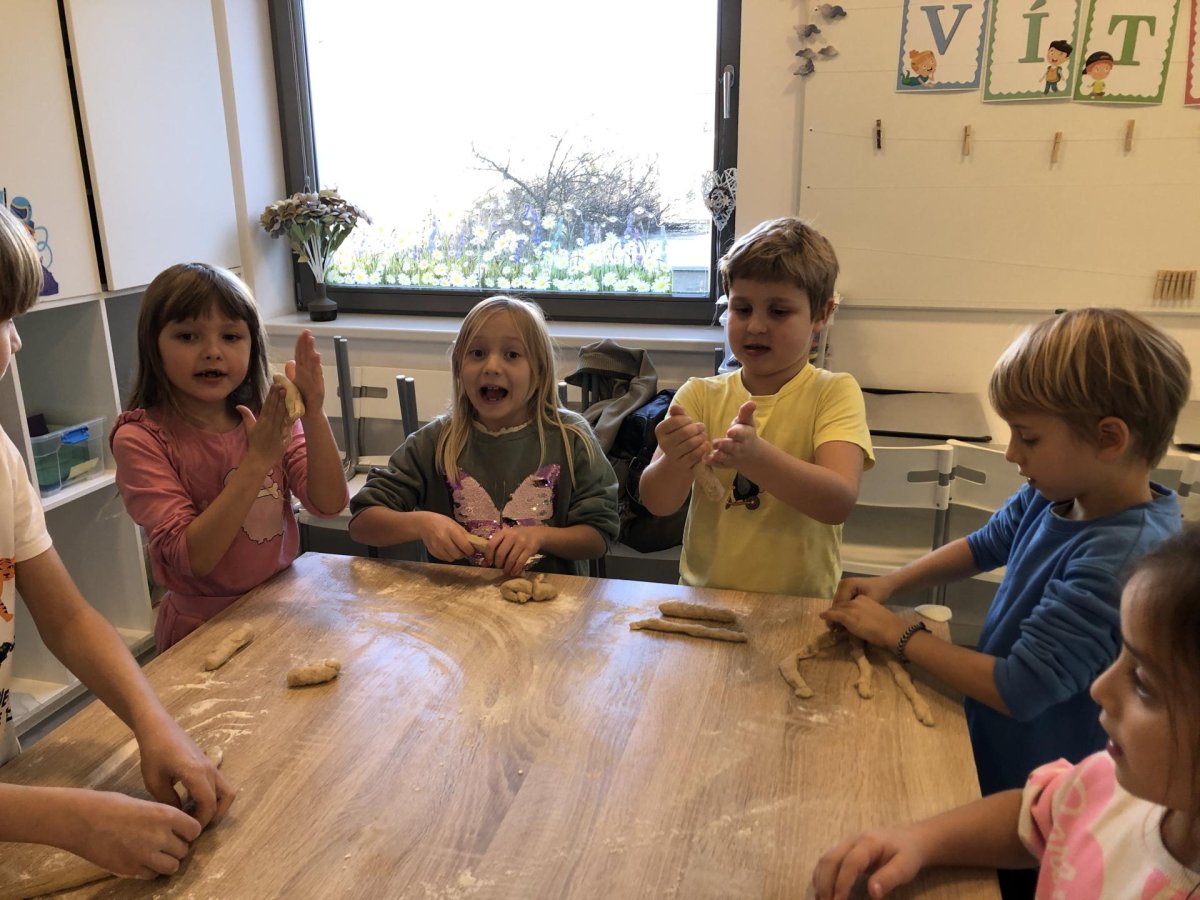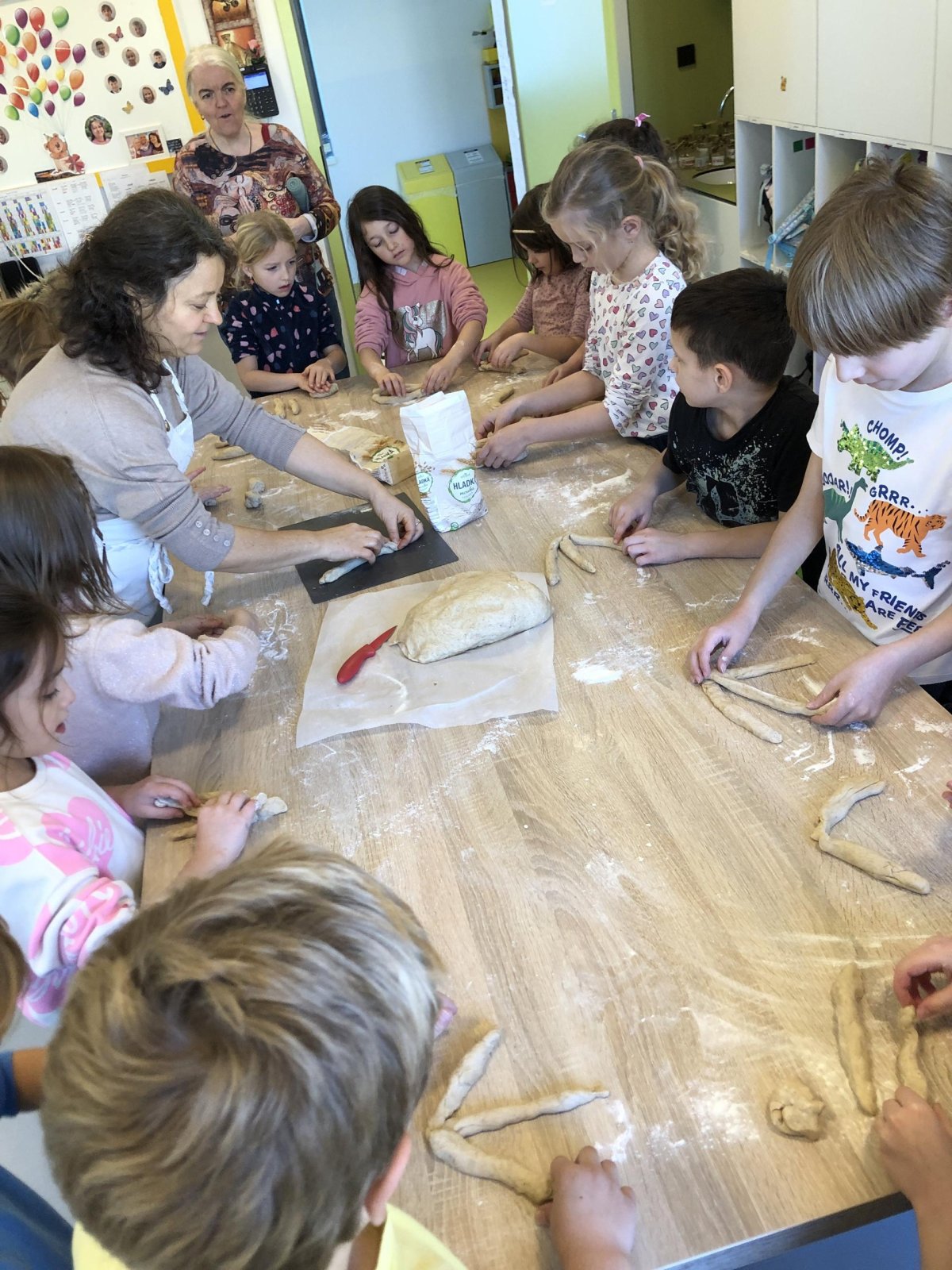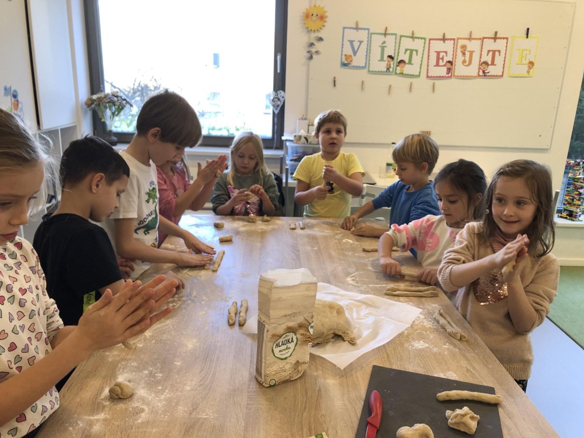 Dnešní den byl pro nás opravdu výjimečný — proměnili jsme se totiž v malé pekaře! Paní vychovatelka nám připravili těsto. tak, aby bylo hladké a hezky pružné. Poté ho nechala chvíli odpočívat a pozorovala, jak krásně nakynulo.