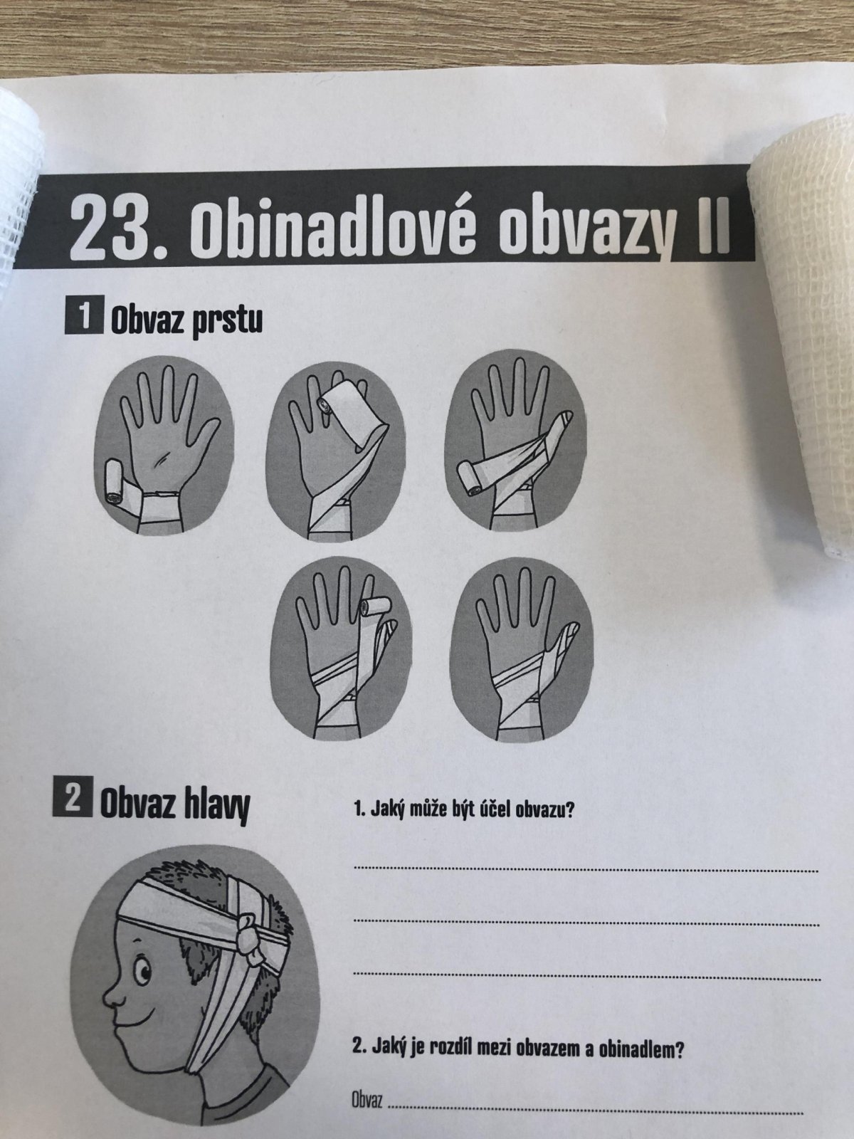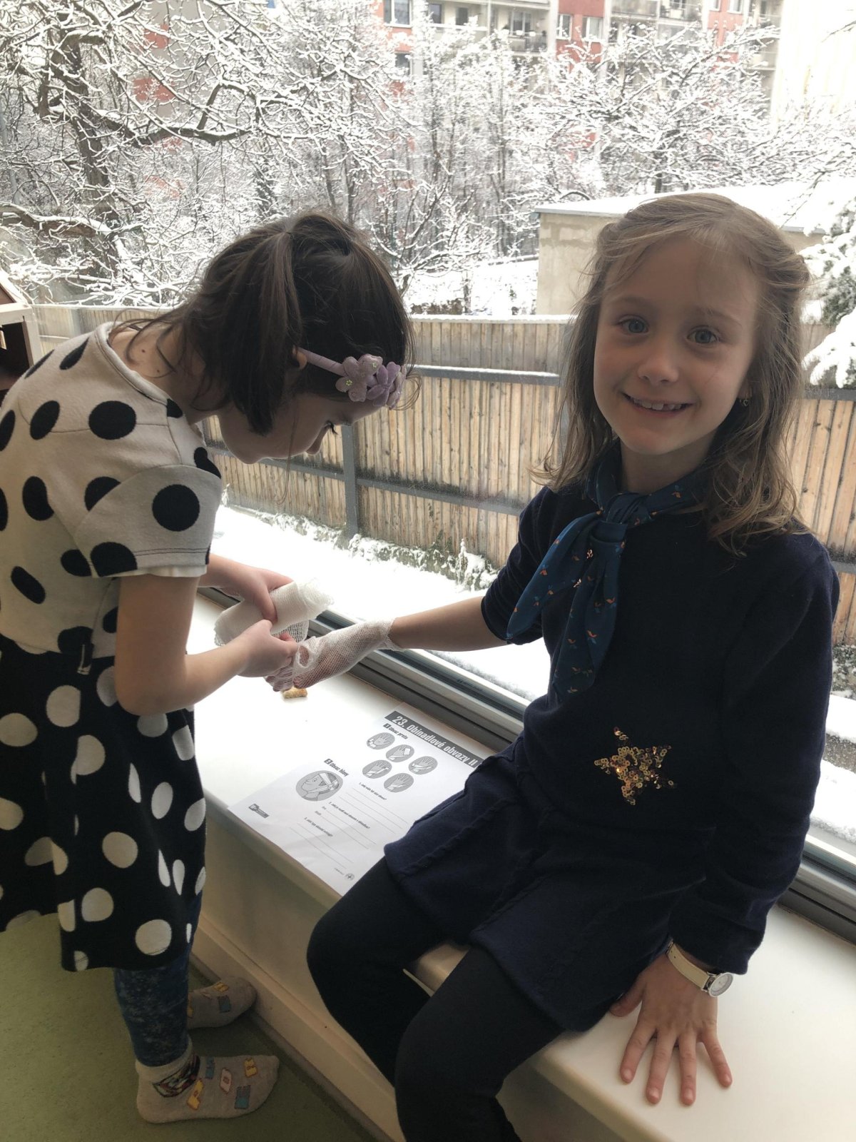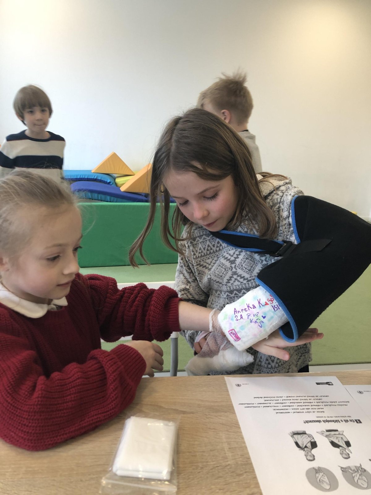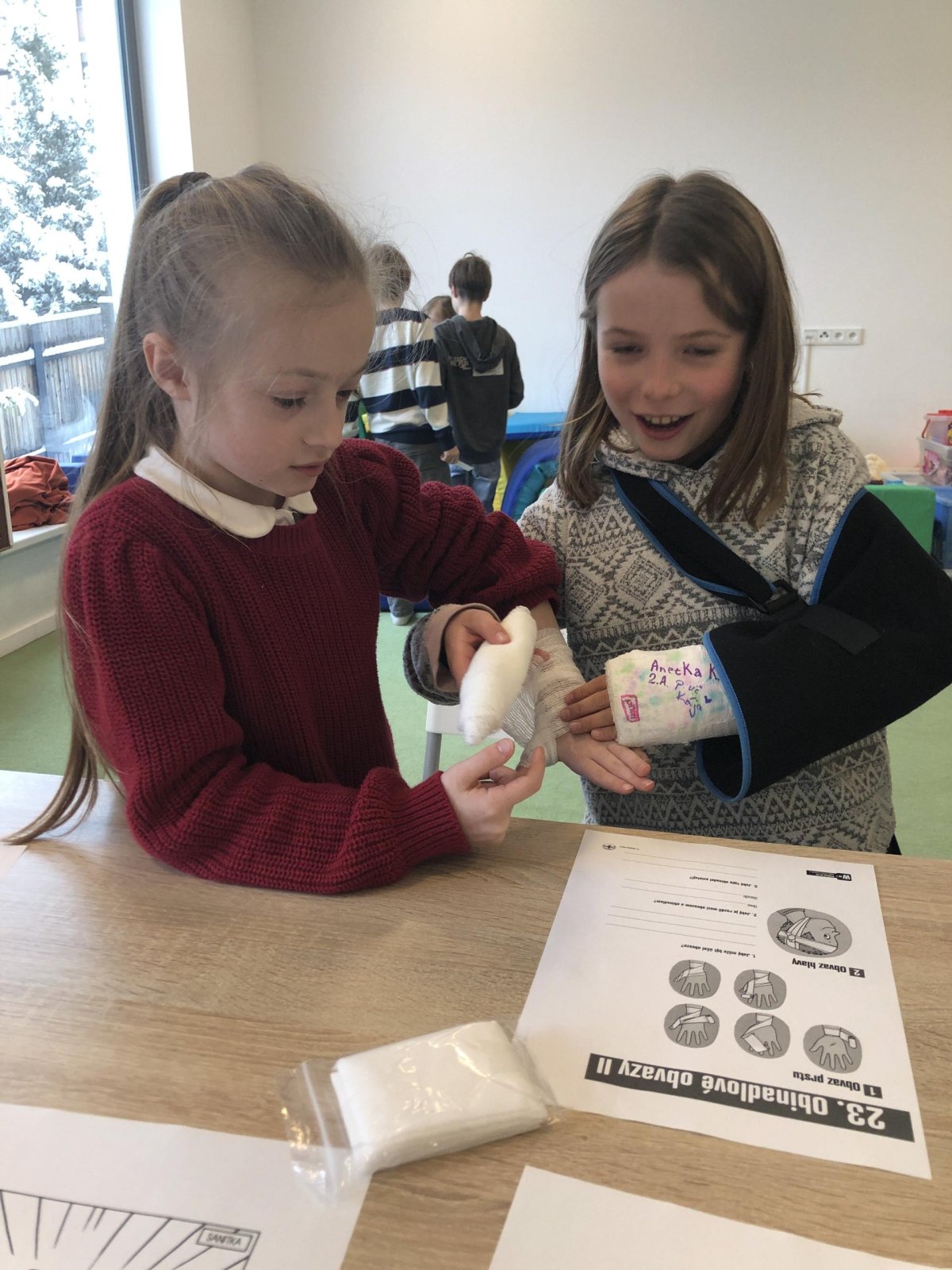 Dnes jsme si v družině hráli na první pomoc. Učili jsme se, jak správně zavázat ruku, nohu, hlavu, dlaň i jak postupovat při zlomenině. Děti si vše samy vyzkoušely a aktivita je moc bavila. Poté chodily po družině obvázané a s nadšením všechny „lekaly“ vyprávěním, co se jim přihodilo. Bylo to veselé, ale nikdo z nás by si nepřál, aby to byla skutečnost. Děti dnes dostaly vysvědčení, ze kterého měly velkou radost a ještě větší, že zítra mají prázdniny.