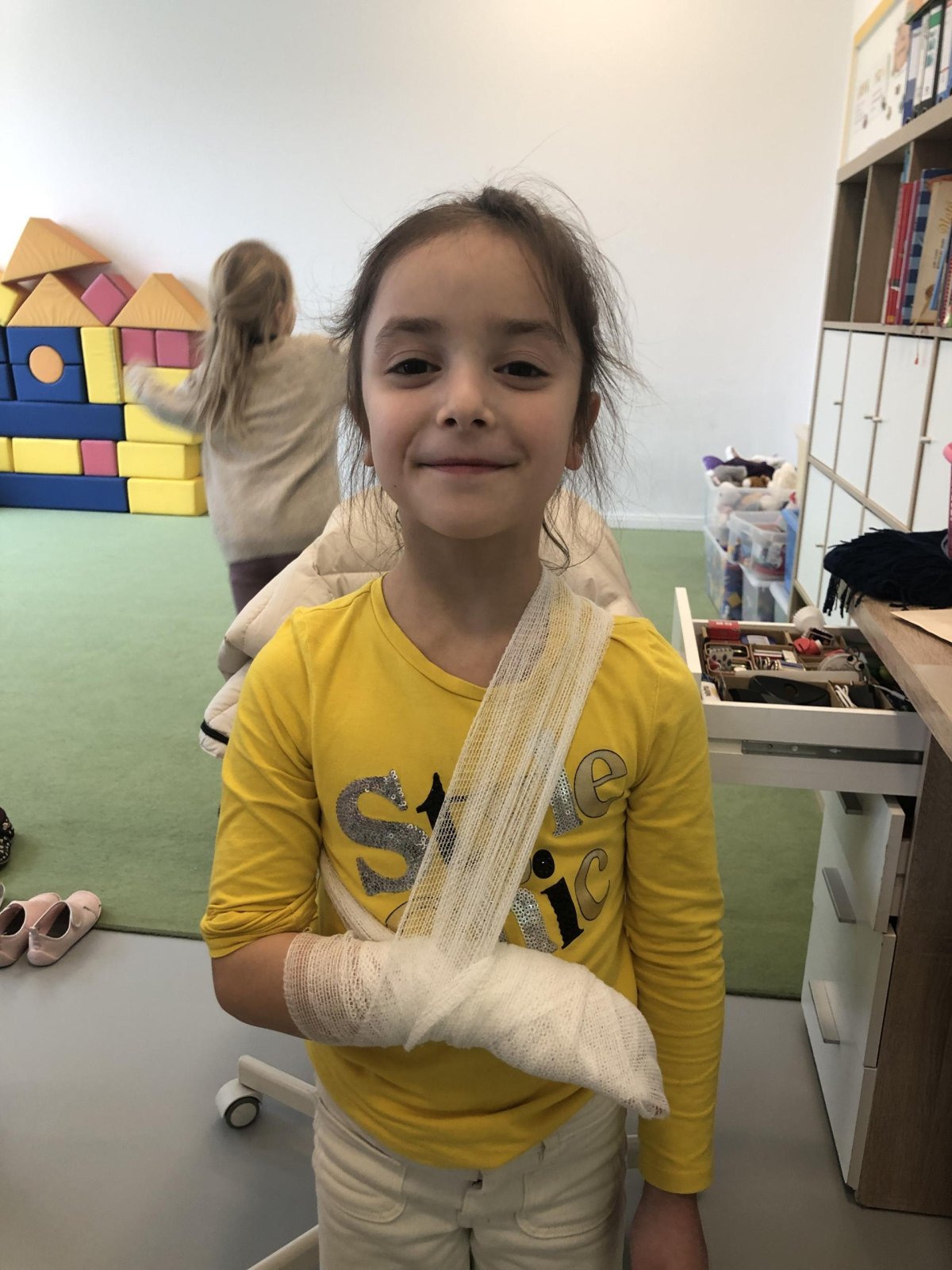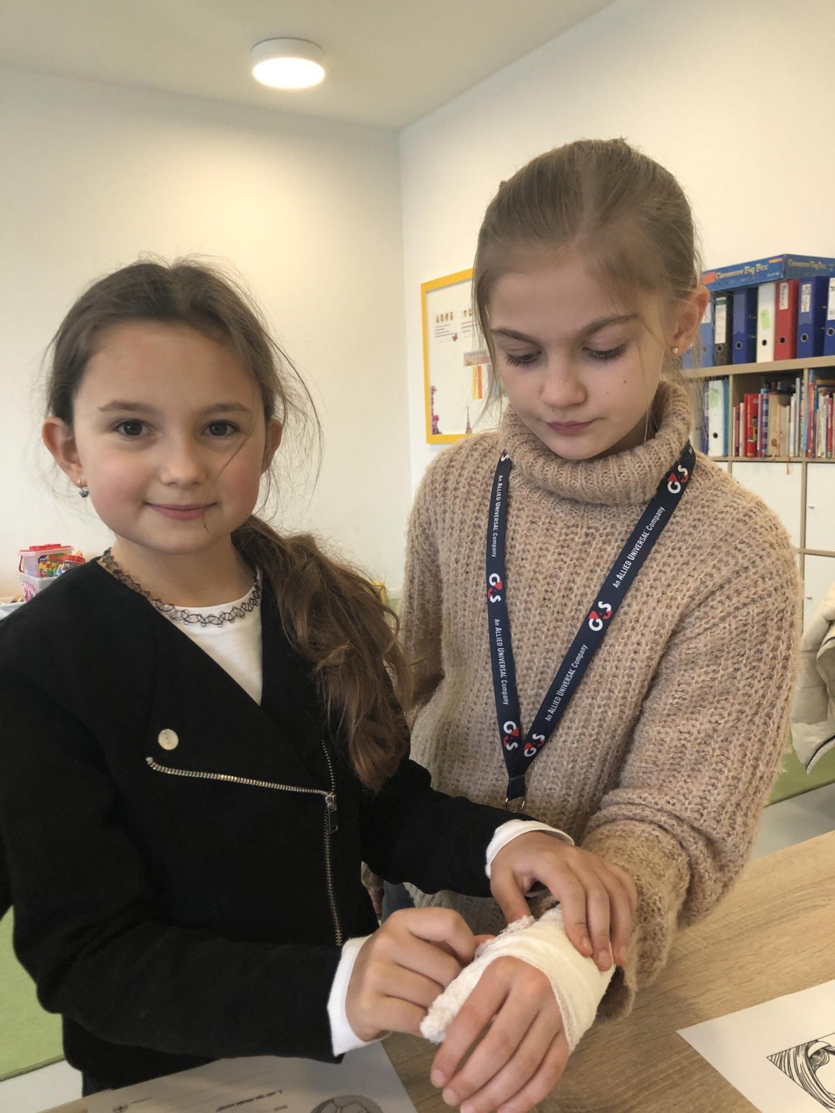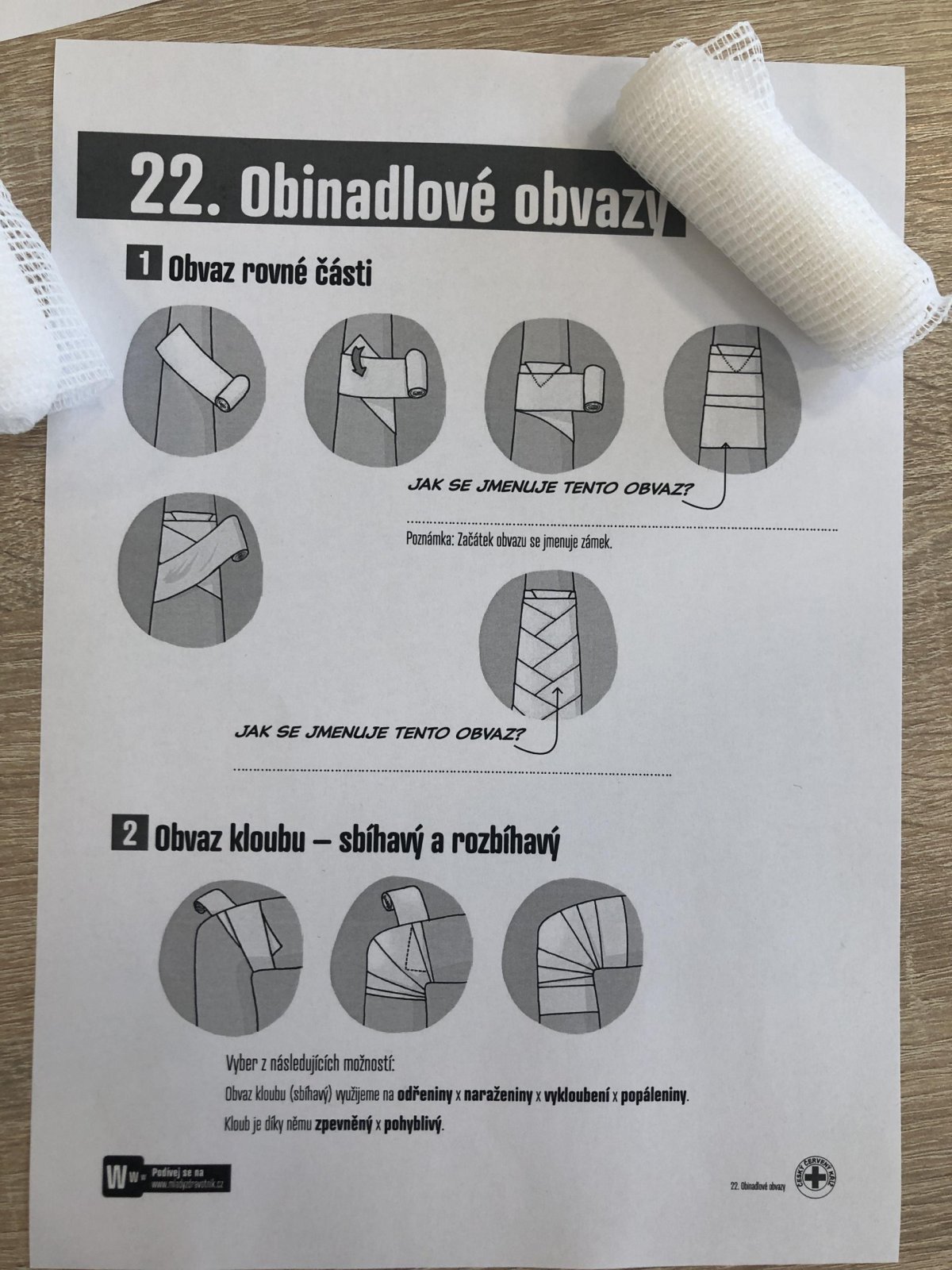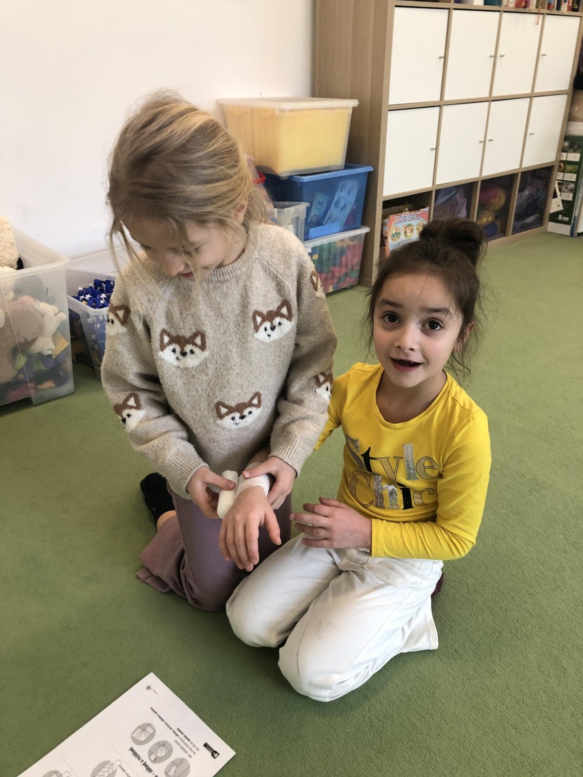 Dnes jsme si v družině hráli na první pomoc. Učili jsme se, jak správně zavázat ruku, nohu, hlavu, dlaň i jak postupovat při zlomenině. Děti si vše samy vyzkoušely a aktivita je moc bavila. Poté chodily po družině obvázané a s nadšením všechny „lekaly“ vyprávěním, co se jim přihodilo. Bylo to veselé, ale nikdo z nás by si nepřál, aby to byla skutečnost. Děti dnes dostaly vysvědčení, ze kterého měly velkou radost a ještě větší, že zítra mají prázdniny.