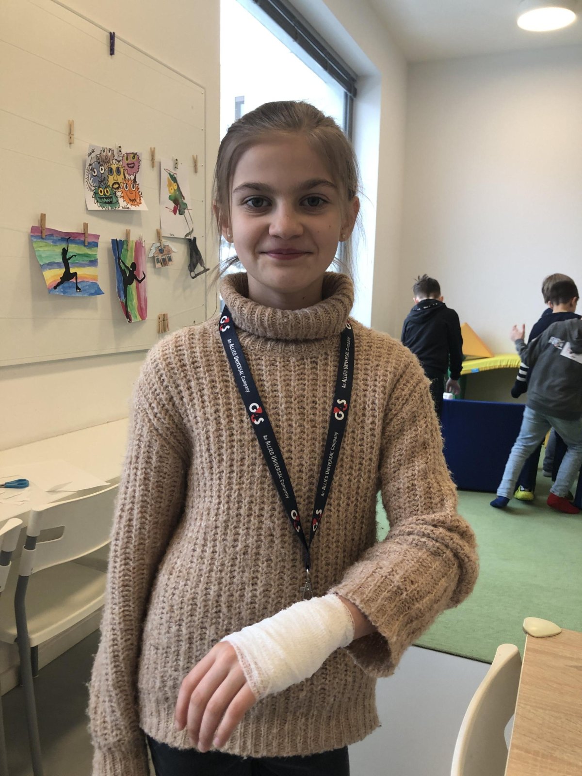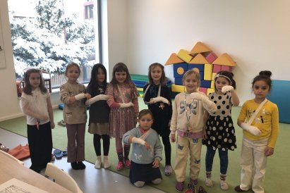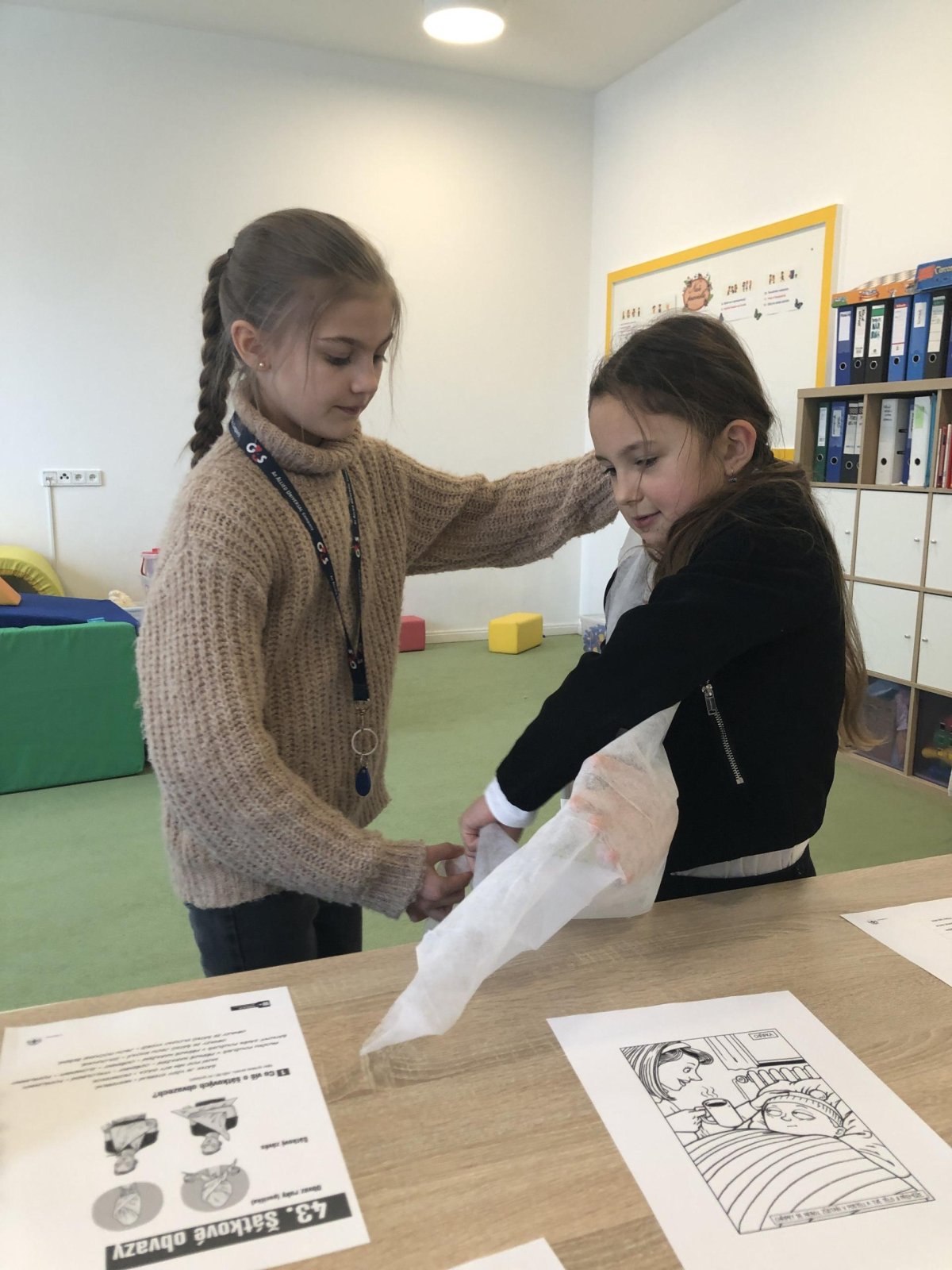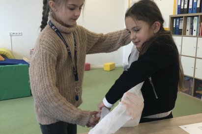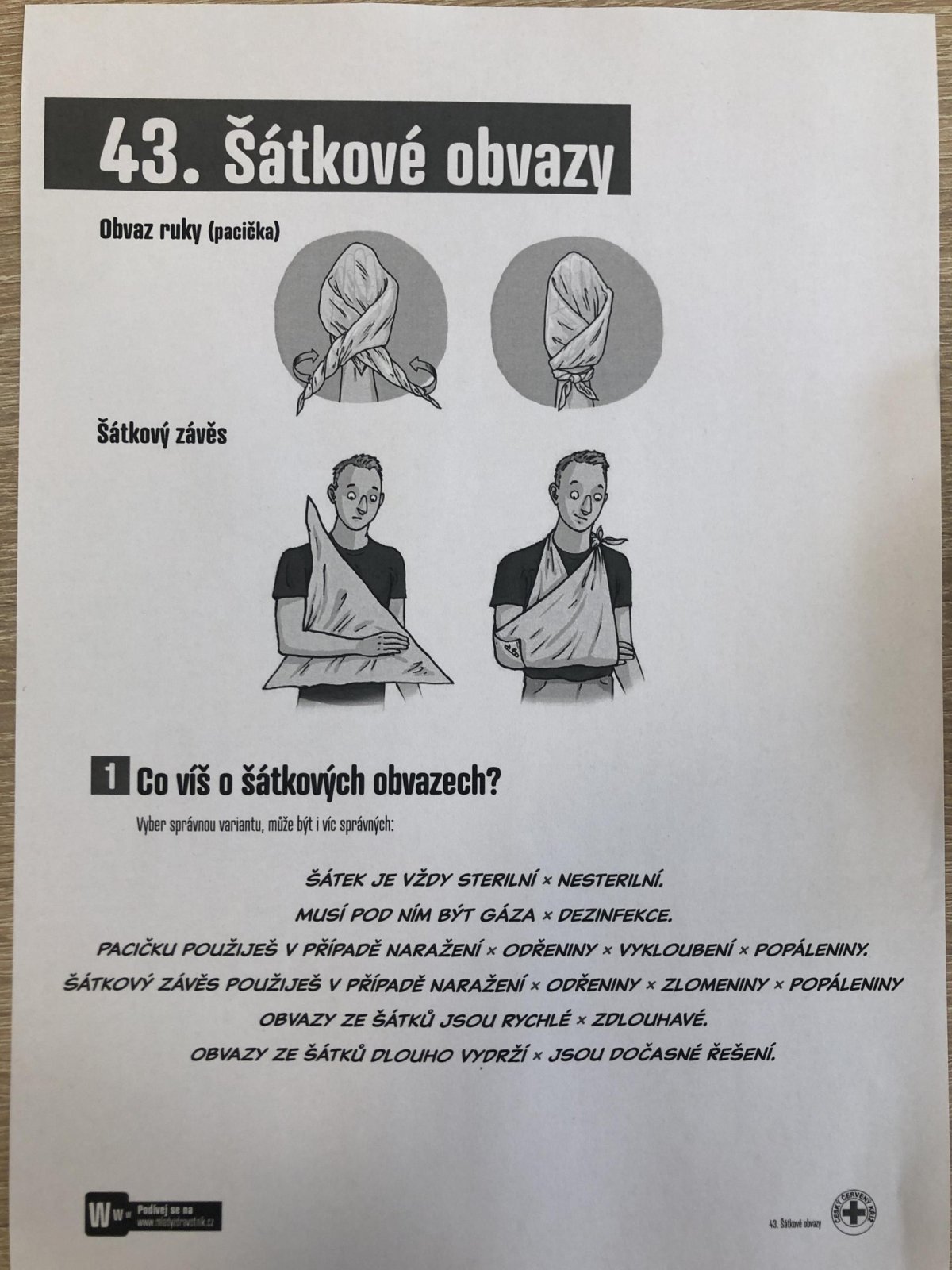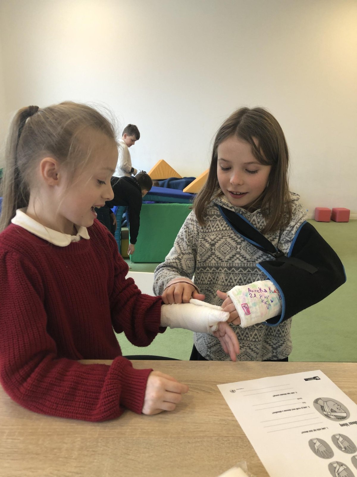 Dnes jsme si v družině hráli na první pomoc. Učili jsme se, jak správně zavázat ruku, nohu, hlavu, dlaň i jak postupovat při zlomenině. Děti si vše samy vyzkoušely a aktivita je moc bavila. Poté chodily po družině obvázané a s nadšením všechny „lekaly“ vyprávěním, co se jim přihodilo. Bylo to veselé, ale nikdo z nás by si nepřál, aby to byla skutečnost. Děti dnes dostaly vysvědčení, ze kterého měly velkou radost a ještě větší, že zítra mají prázdniny.