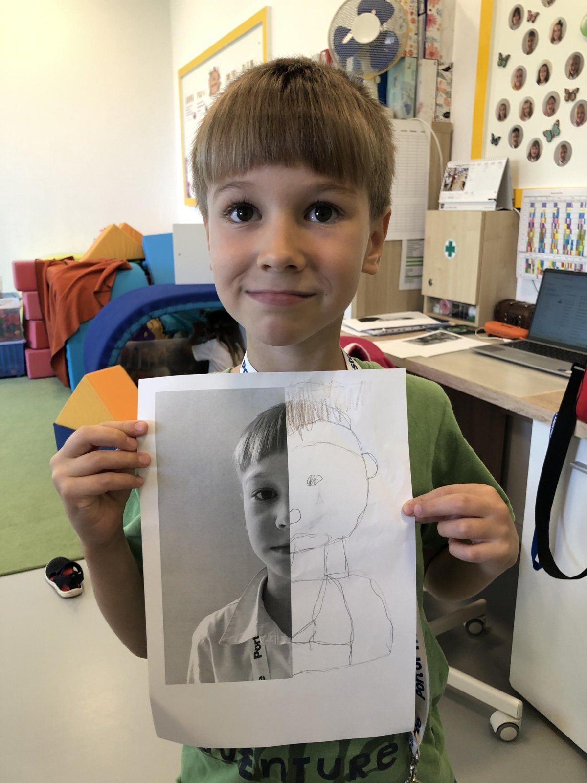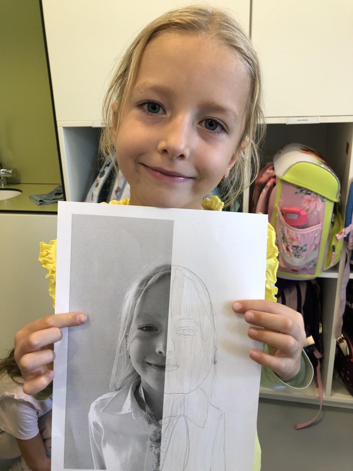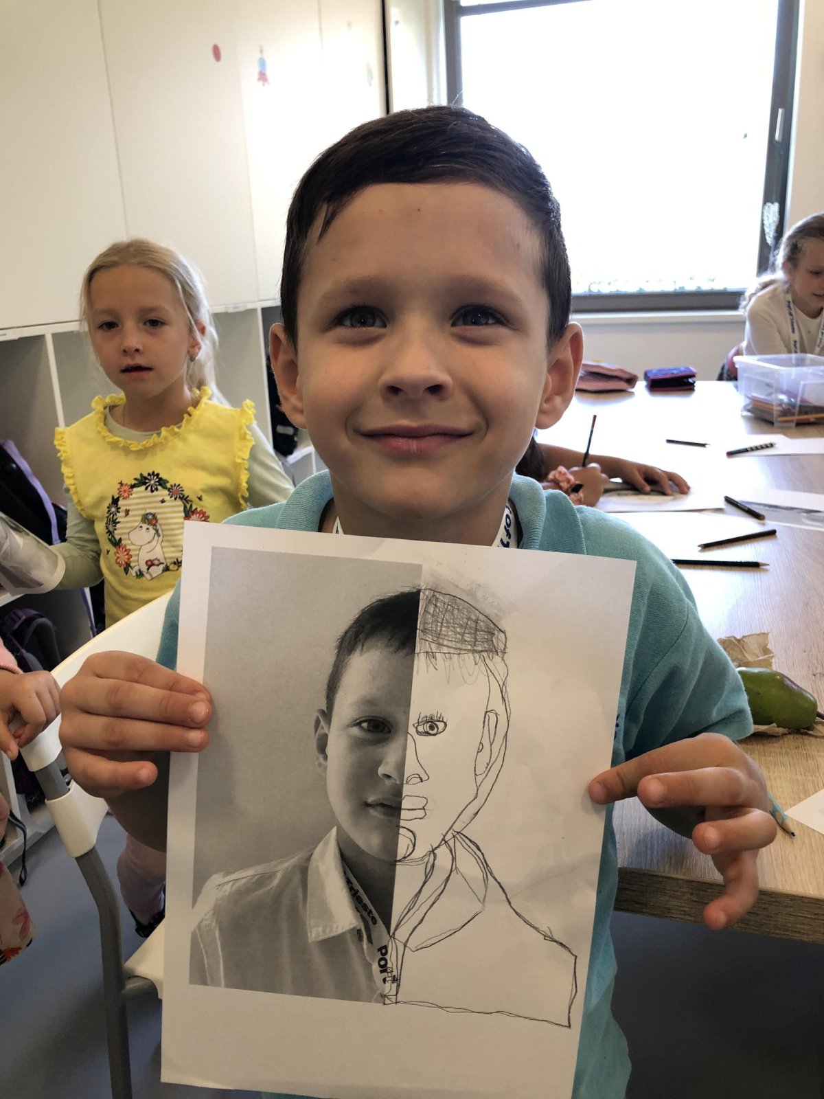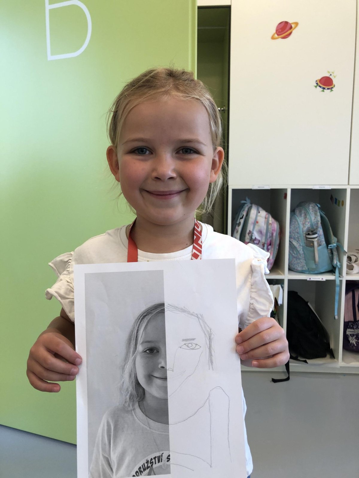 Dnes jsme pokračovali v kreslení půlportrétu s prvňáčky. Děti se krásně zapojily a výsledek? Podívejte se sami. Zvládli to, ne?