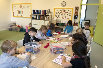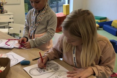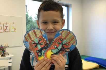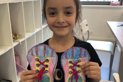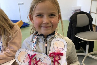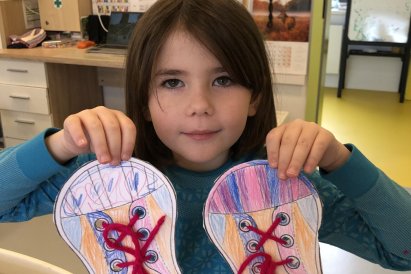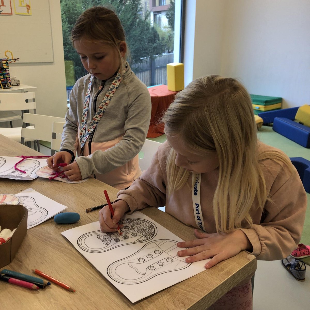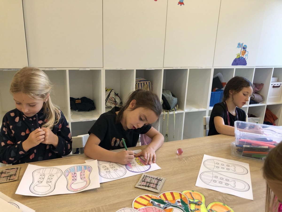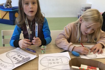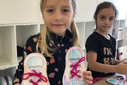 Dnešní odpoledne jsme si ve družině vyzkoušeli, jaké to je být opravdovým ševcem. Každý z nás si vybarvil papírovou botu, do které jsme pak udělali dírky na tkaničky. Zpívali jsme si u toho písničky a práce s pastelkami nám šla od ruky. Nejtěžší část ale teprve přišla – navléknout tkaničky a potom je správně zavázat!