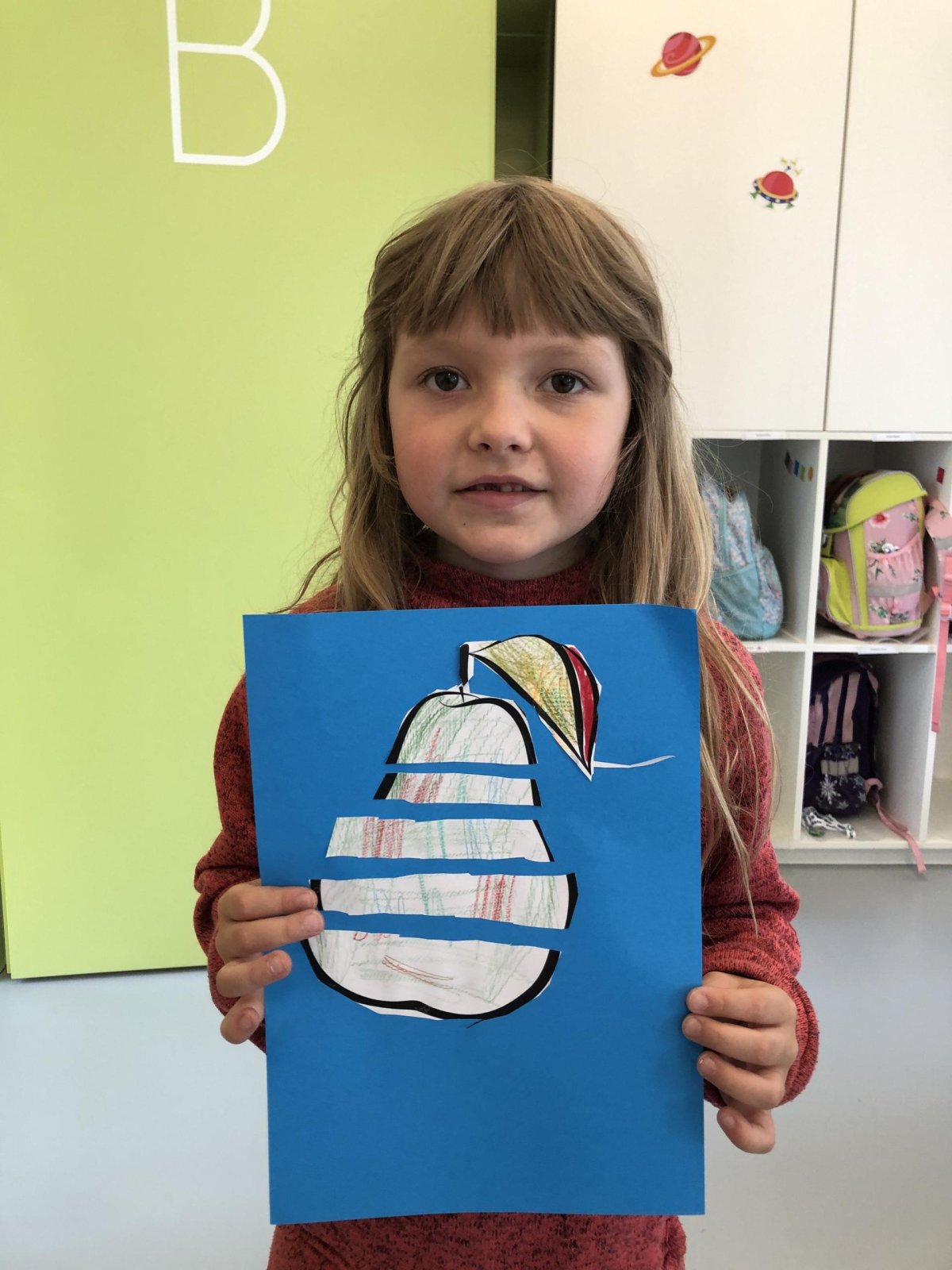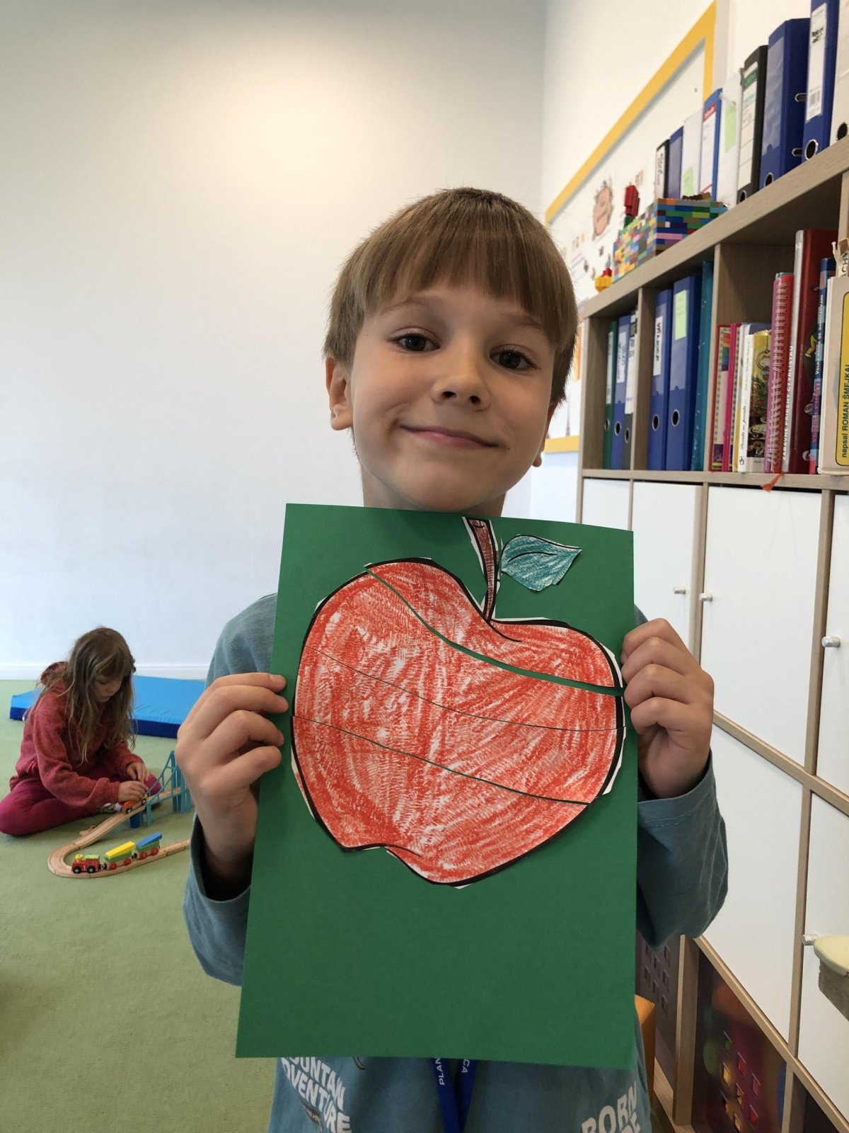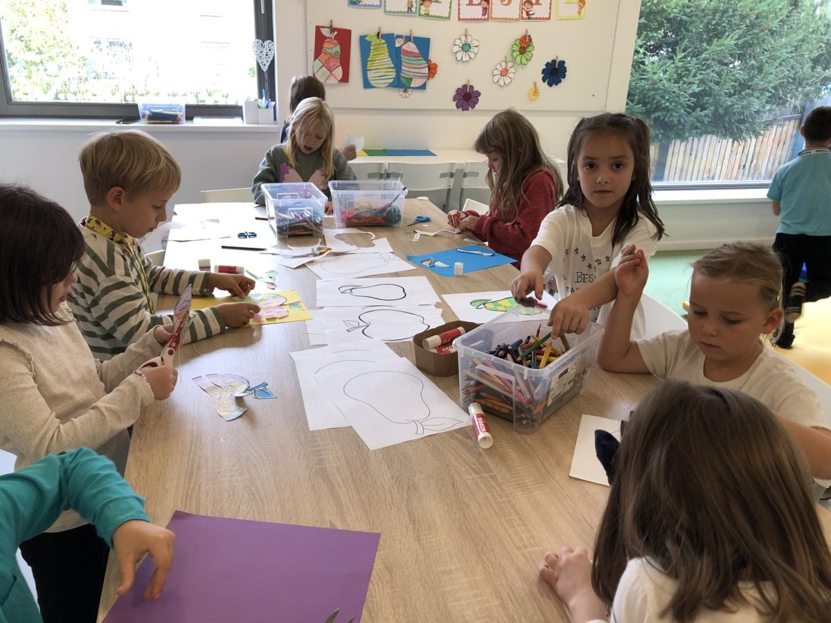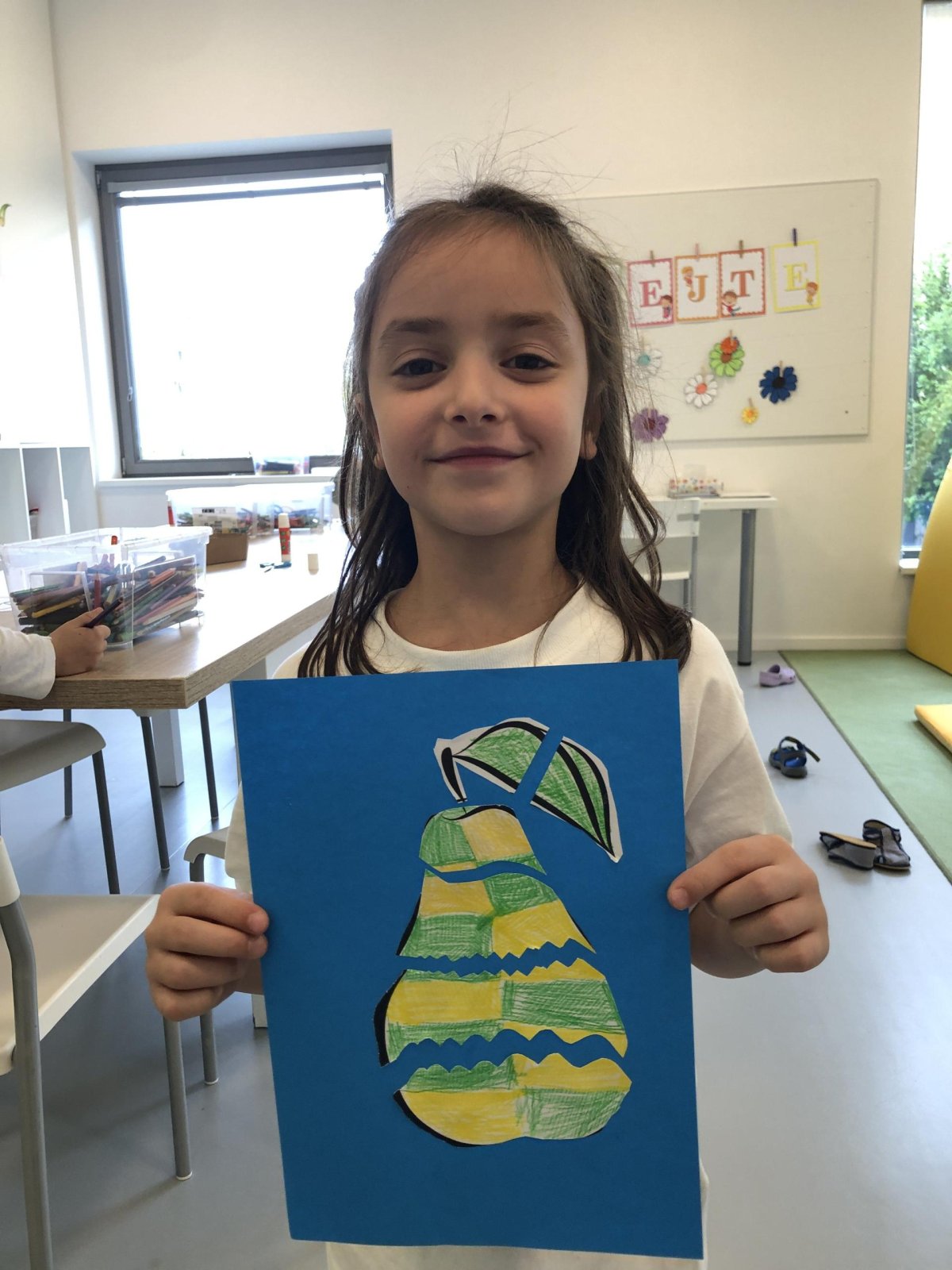Dnes jsme v rámci družiny vyráběli tento veselý skládaný obrázek hrušky, nebo jablka. Děti si procvičily stříhání, lepení a tvořivou představivost, když jednotlivé proužky spojovaly zpět do tvaru ovoce.