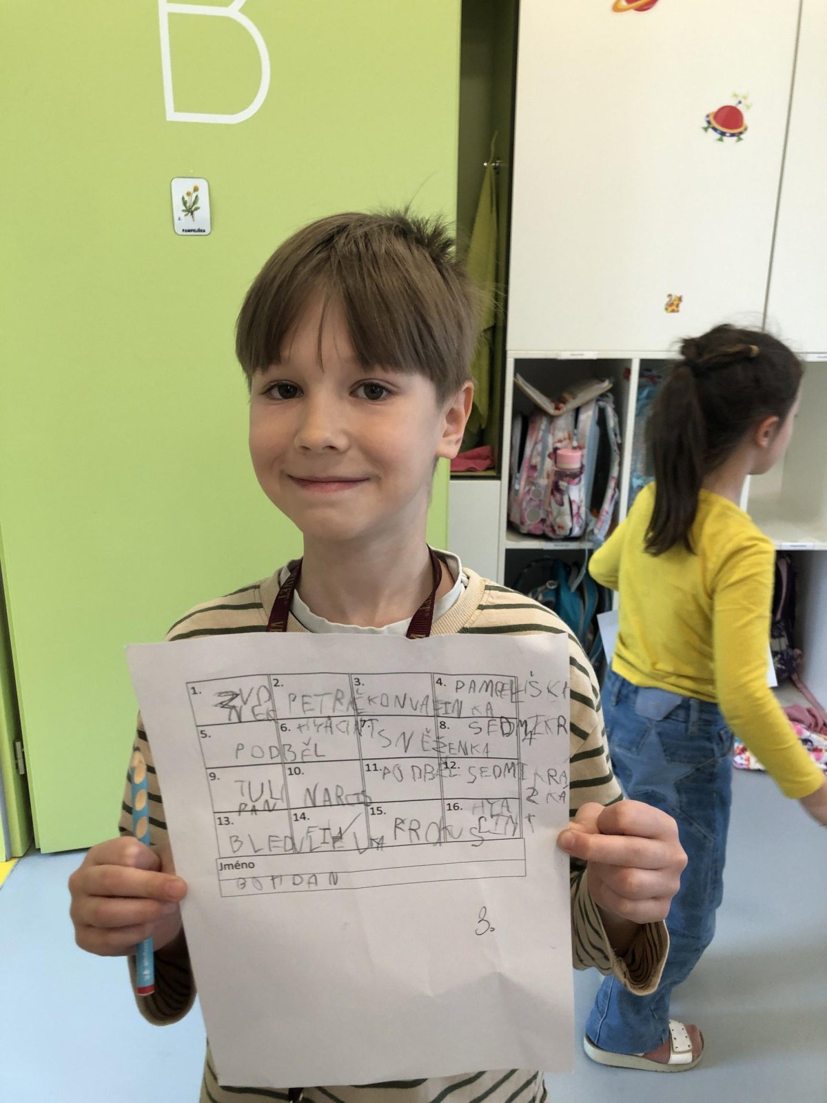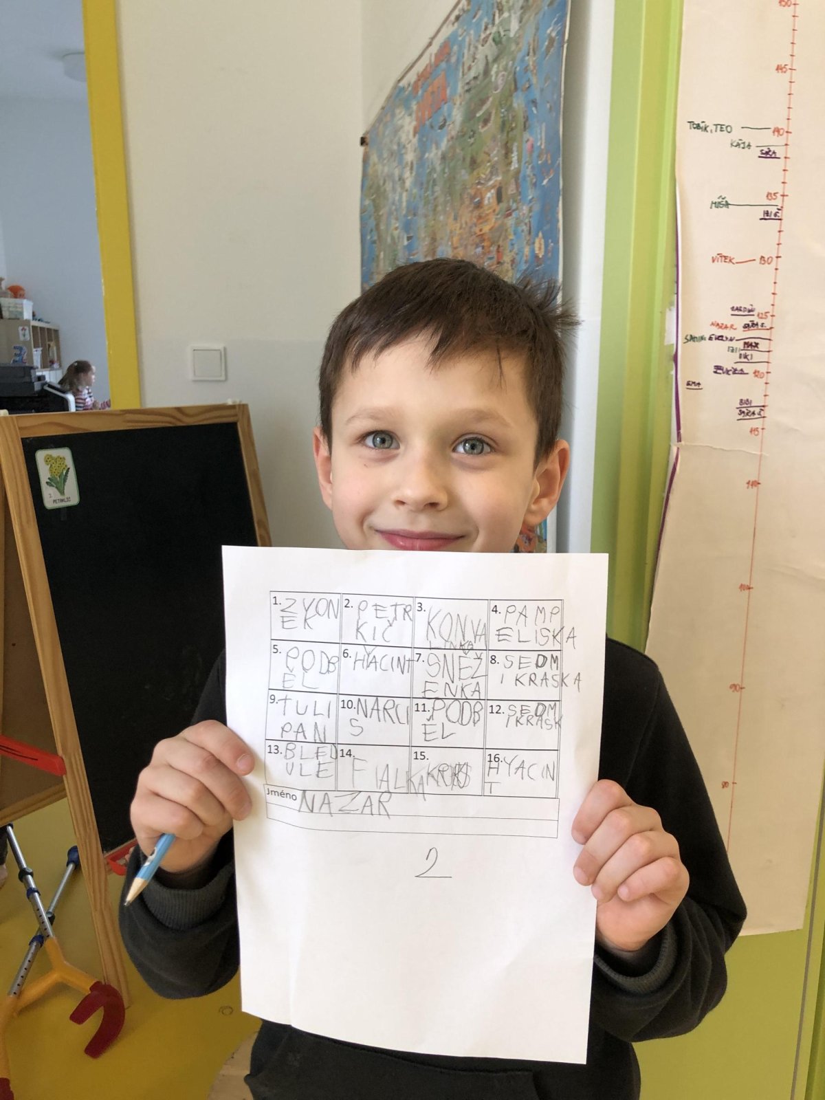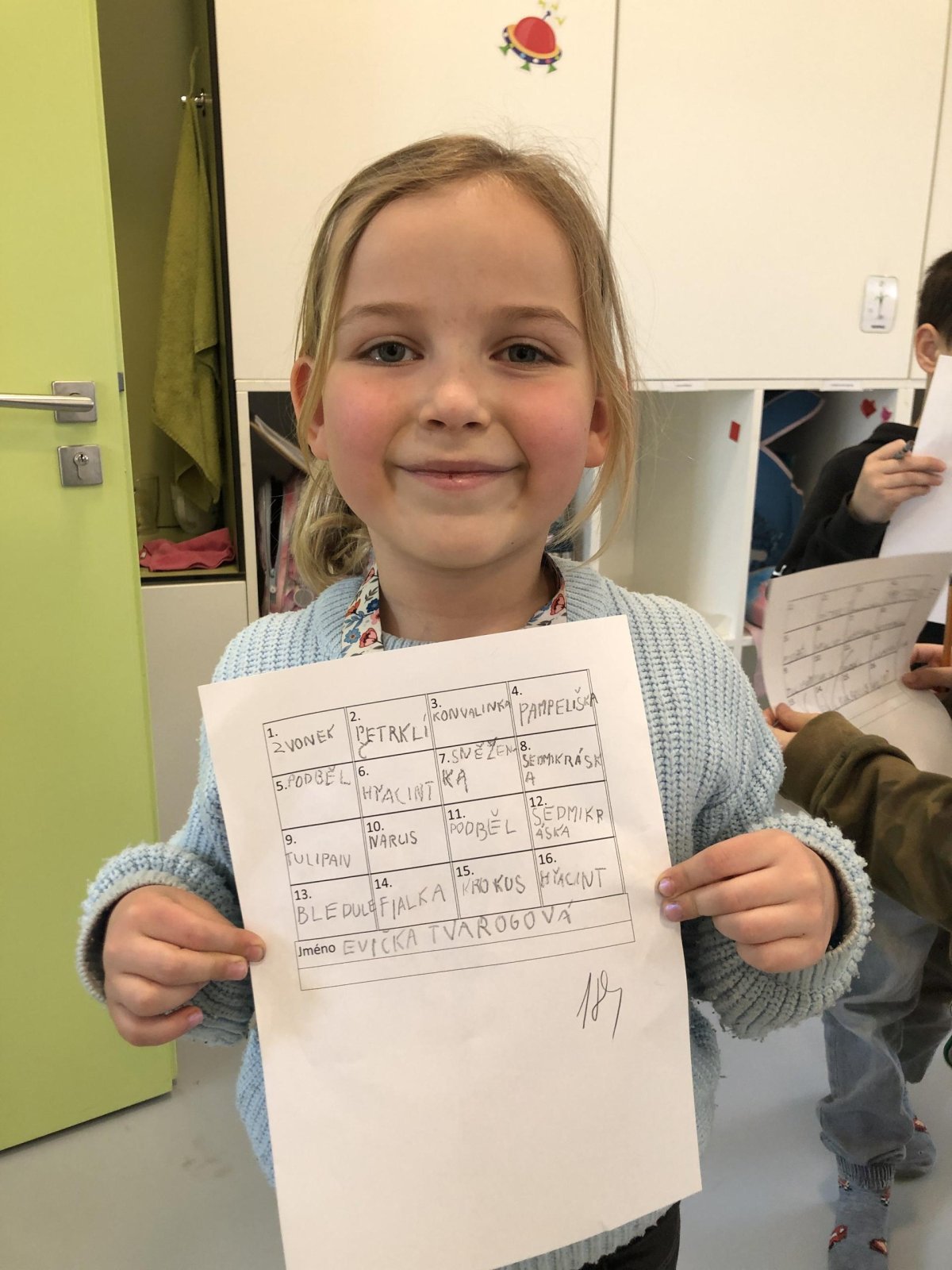 Dnes jsme si povídali o jarních kytičkách a o tom, jak poznáme, že je jaro. Vyrobili jsme si sněženku a poté jsme si zahráli hru Bingo, při které děti po celé družině hledaly jarní kytičky. Výsledky zapisovaly do připravených papírů. Děti si hru moc užily a s chutí hledaly jednotlivé karty.