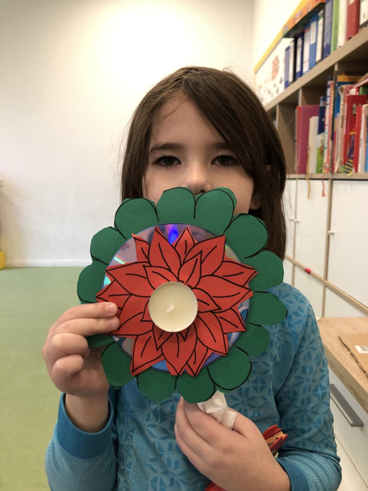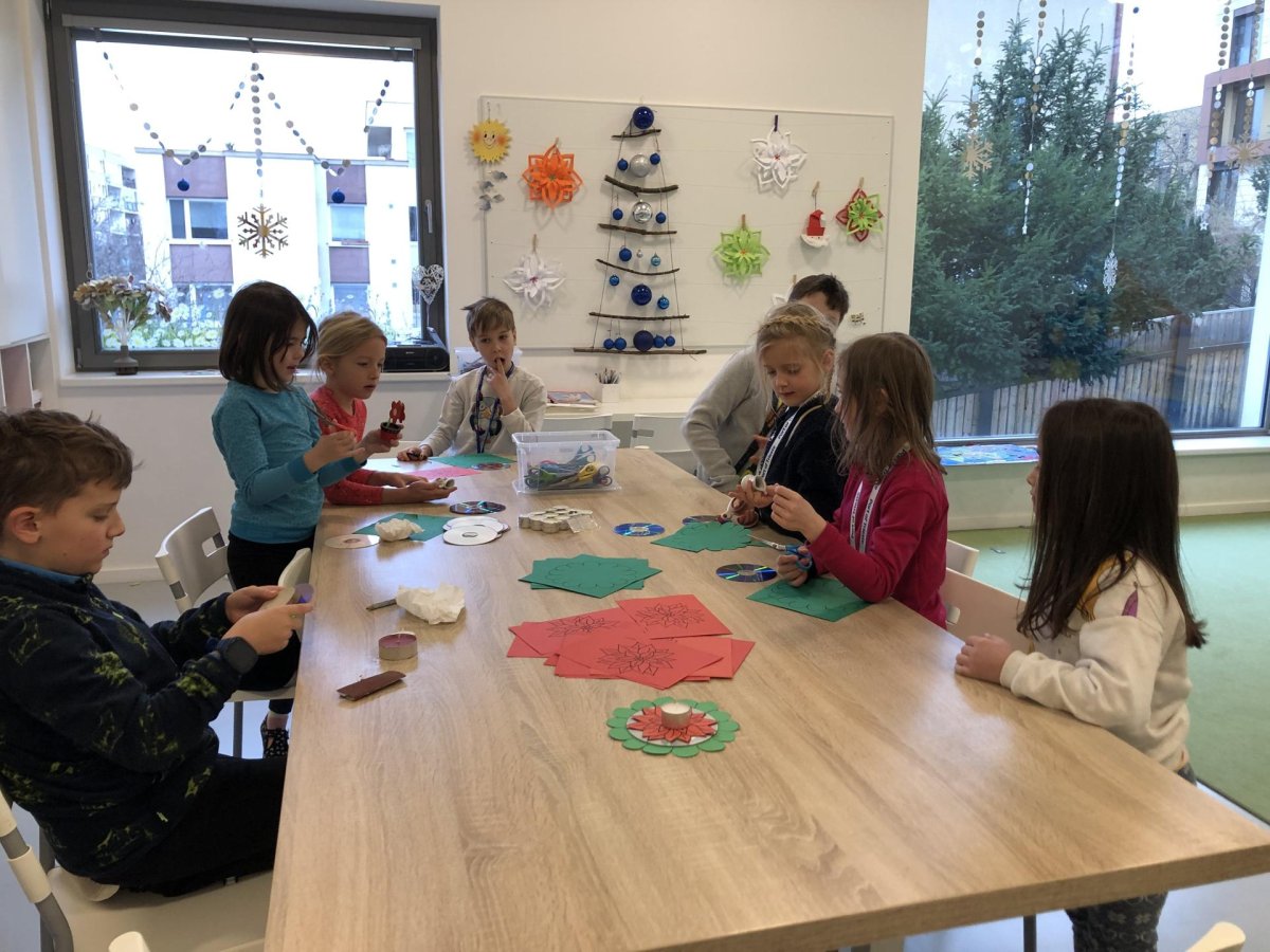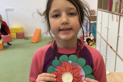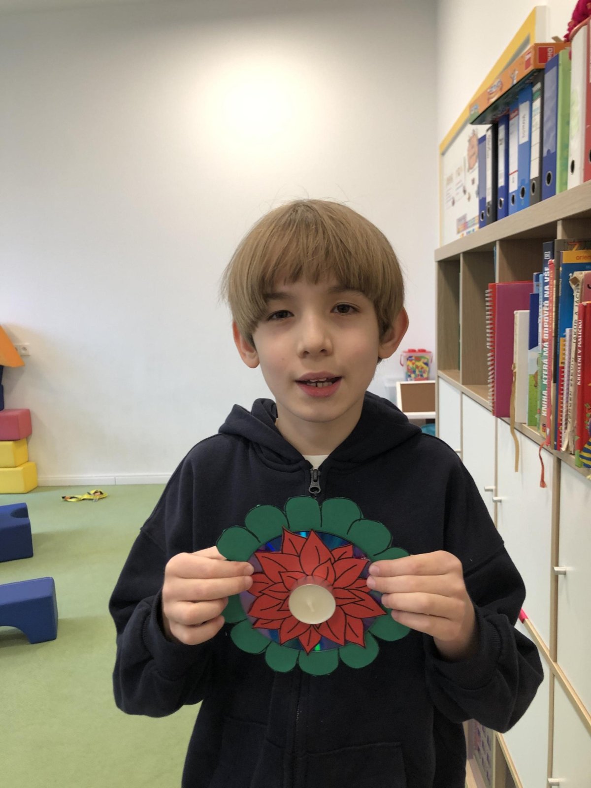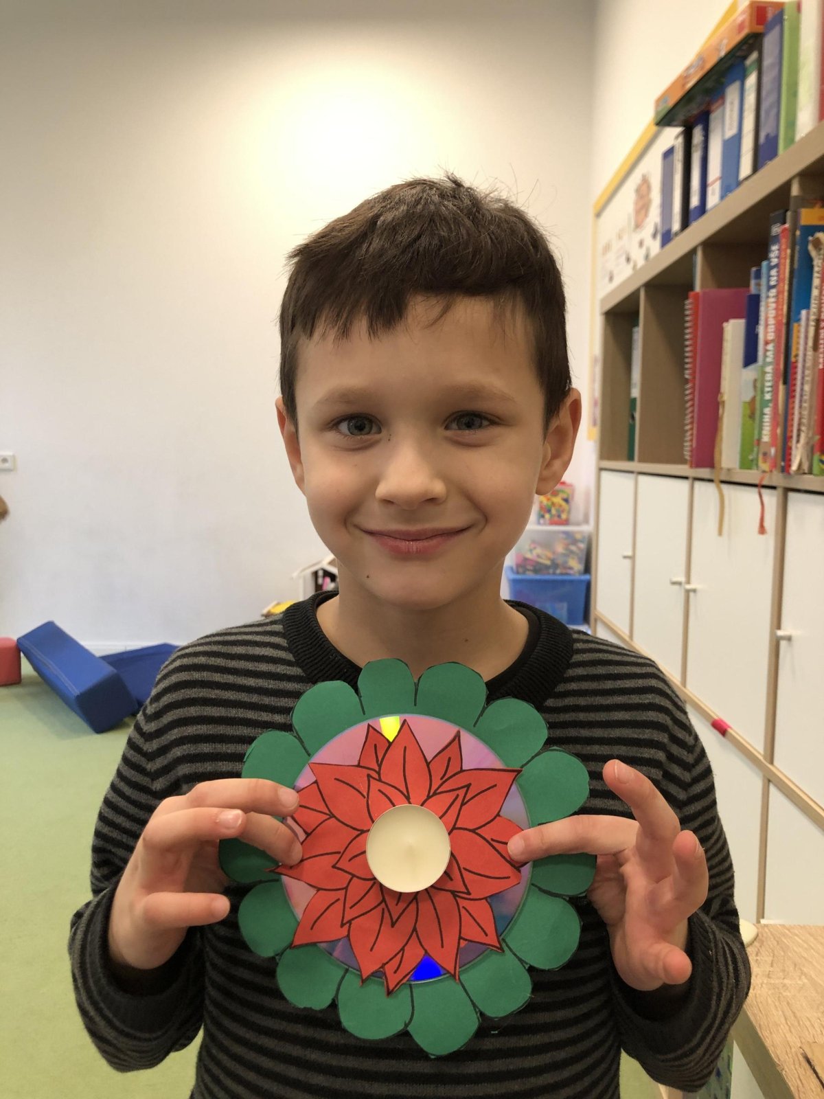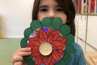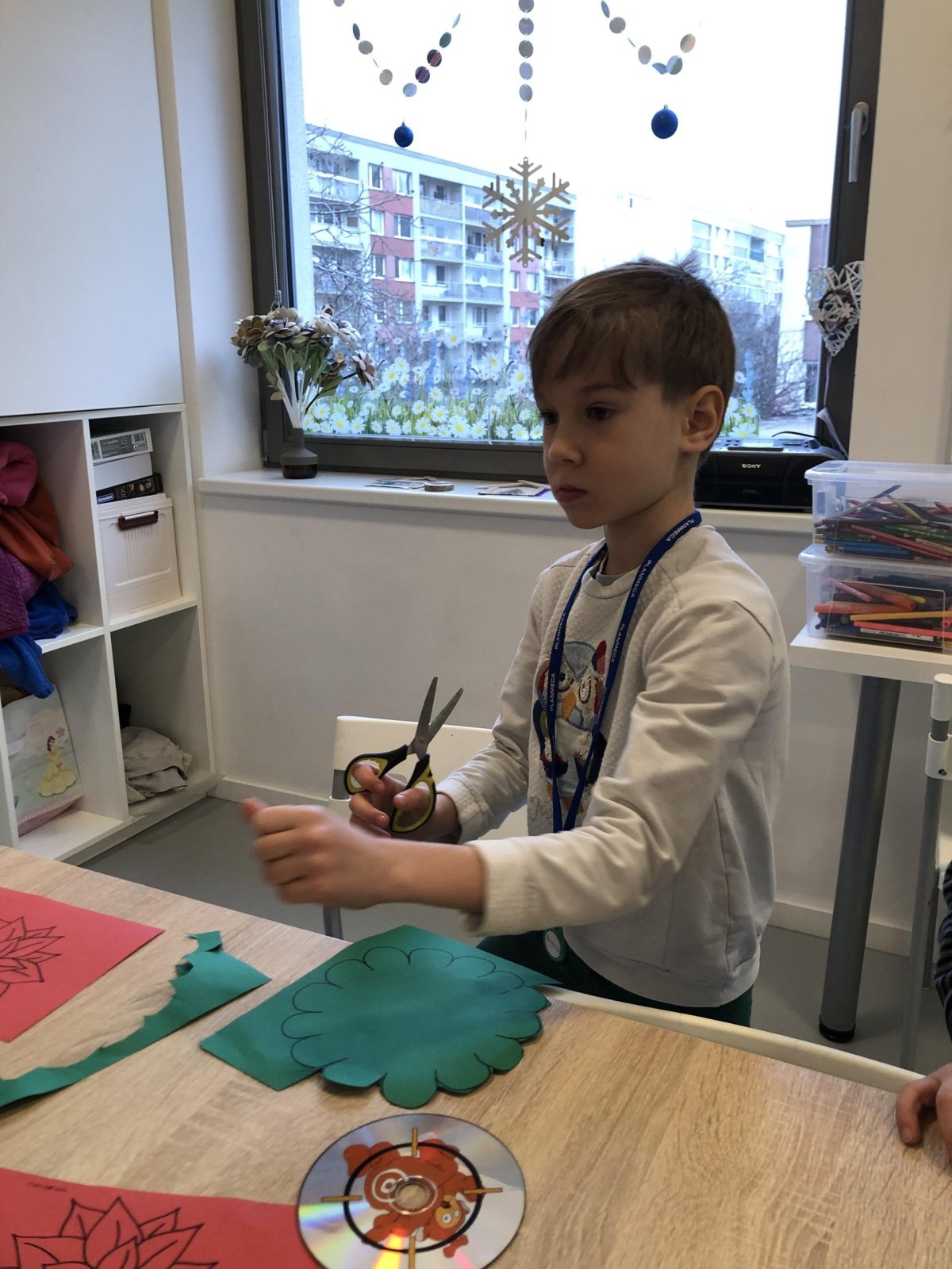 Dnešní den jsme začali výrobou svícnu. Nejprve jsme si nastříhali připravené přílohy a následně je nalepili na CD. Poté jsme doplnili svíčku a svícen byl hotový. Moc se nám líbil a už se těšíme, až si ho rozsvítíme.