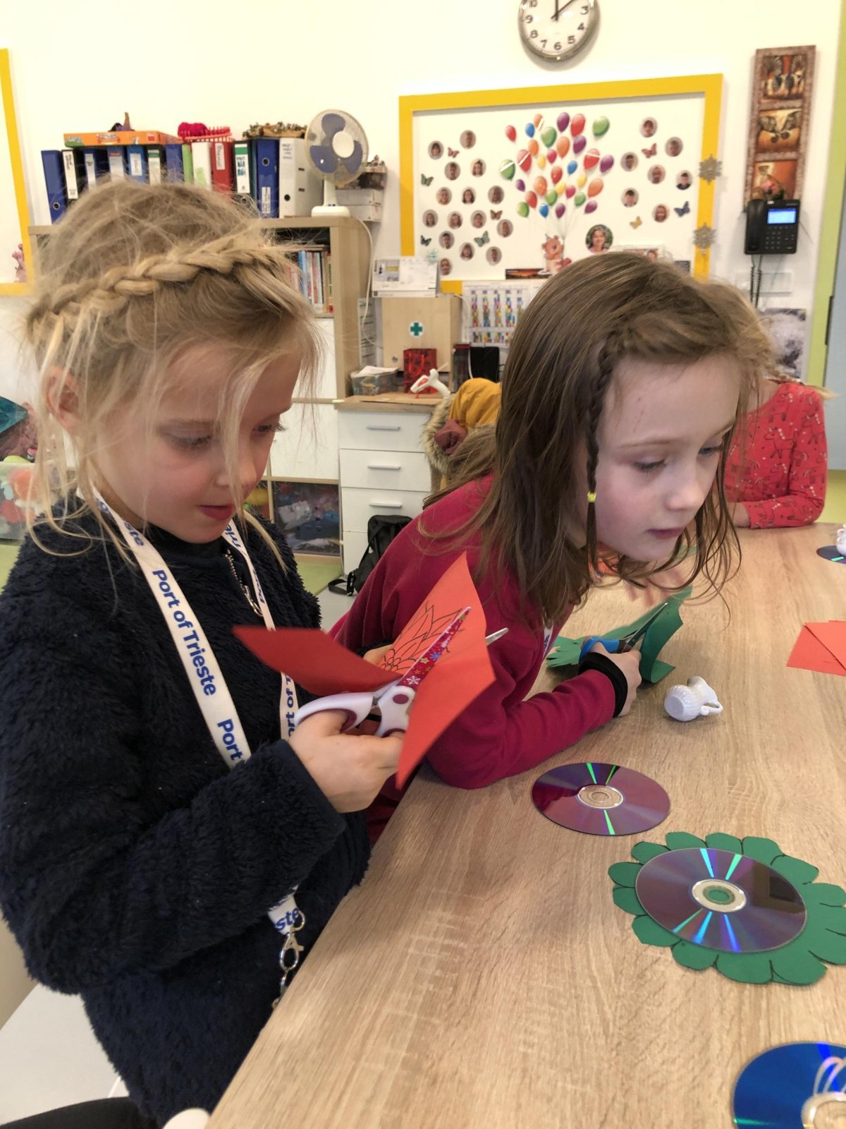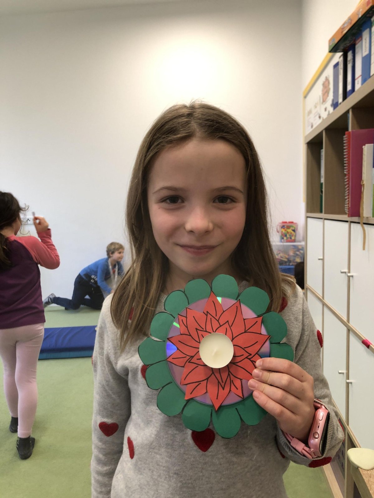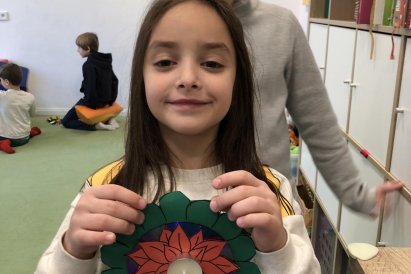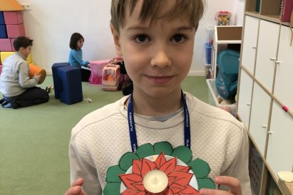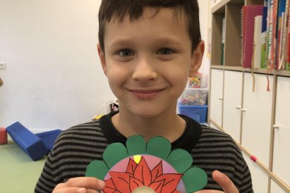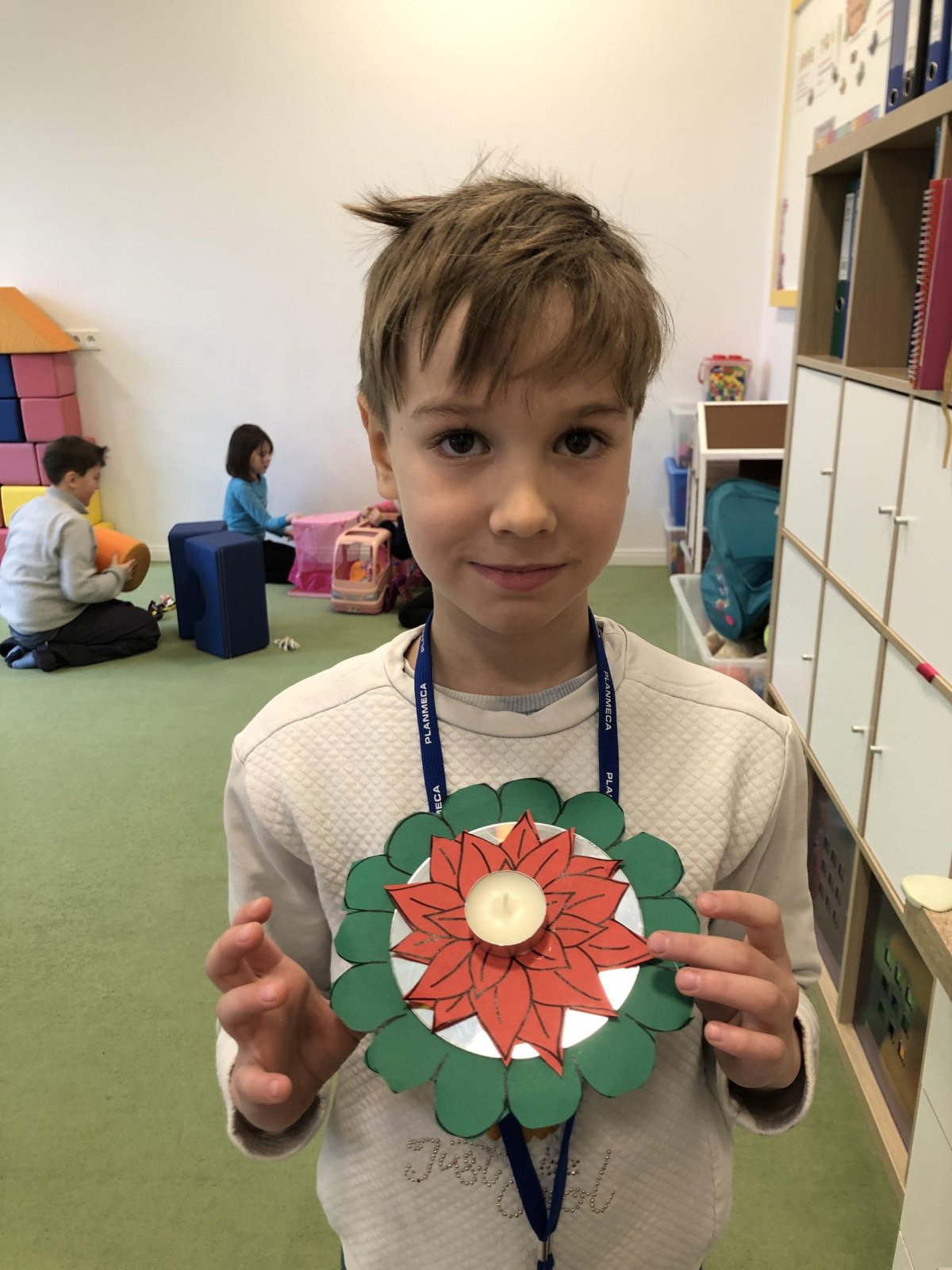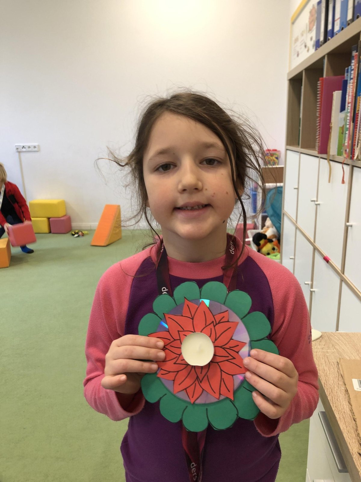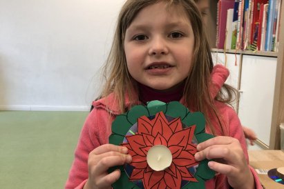 Dnešní den jsme začali výrobou svícnu. Nejprve jsme si nastříhali připravené přílohy a následně je nalepili na CD. Poté jsme doplnili svíčku a svícen byl hotový. Moc se nám líbil a už se těšíme, až si ho rozsvítíme.