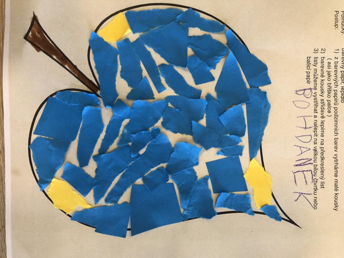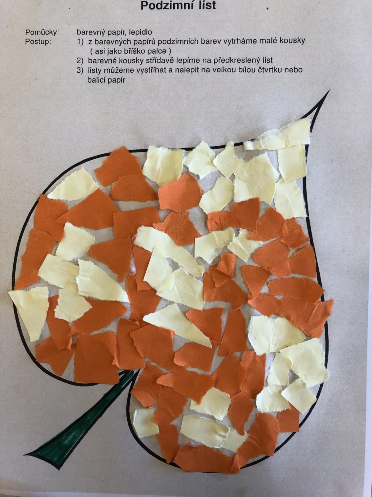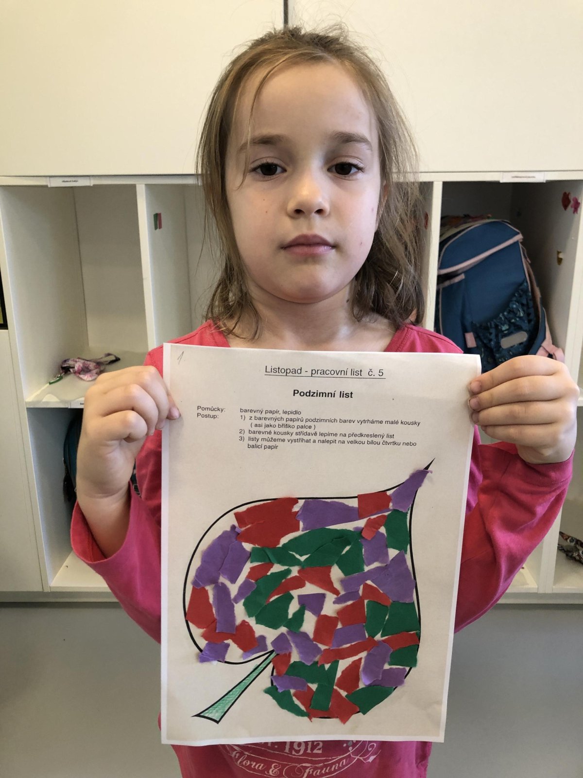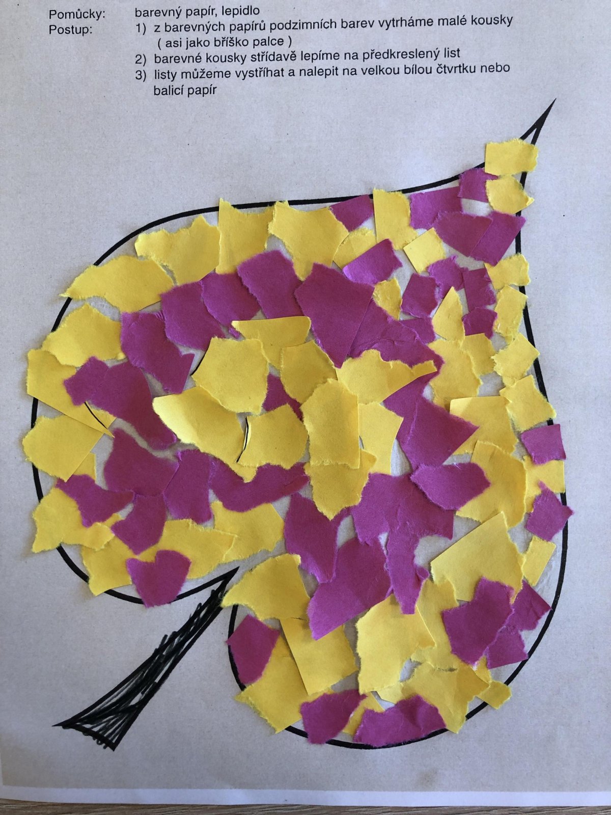 Dnešní den jsme si zpříjemnili krásným příběhem ze života o statečné Katce, která zachránila spoustu lidí. Poté jsme se pustili do trhání papíru, kterým jsme následně lepili listy. Procvičovali jsme tak jemnou motoriku – a moc nás to bavilo!