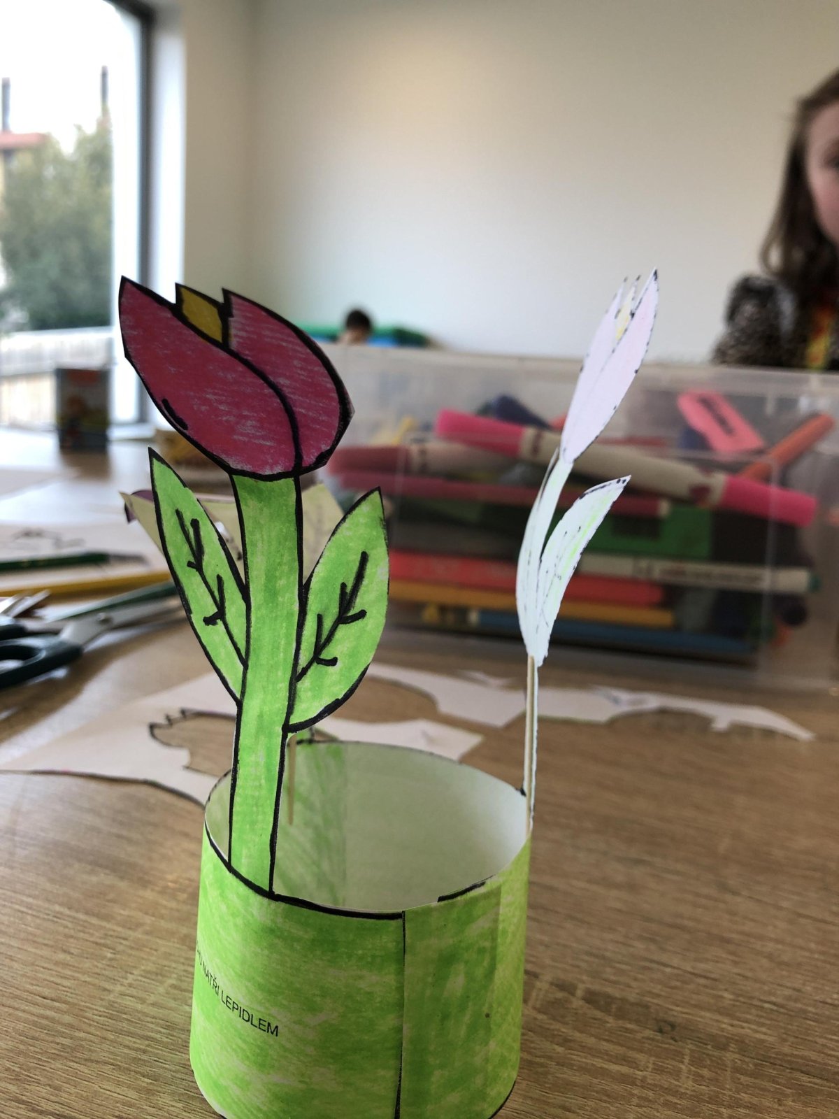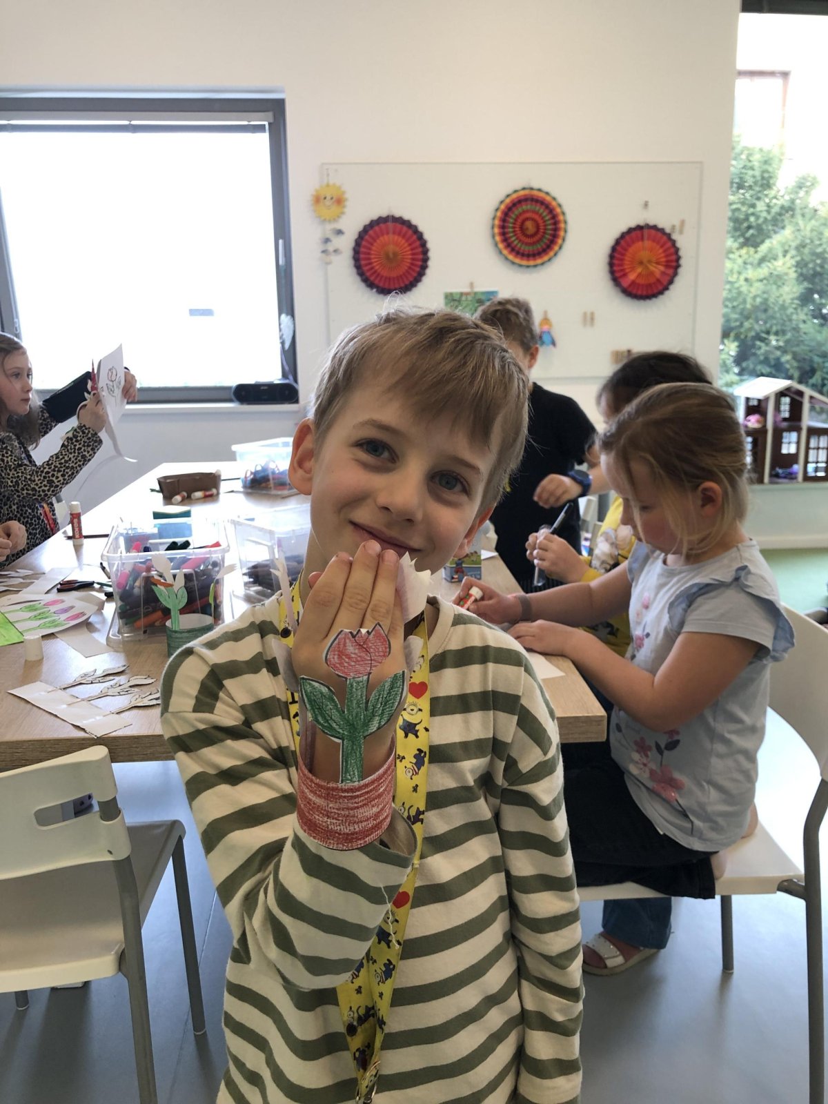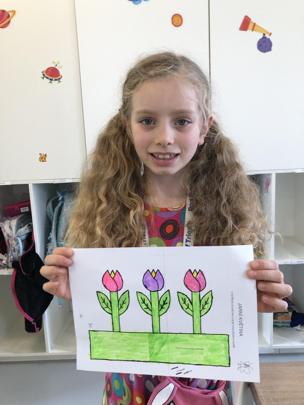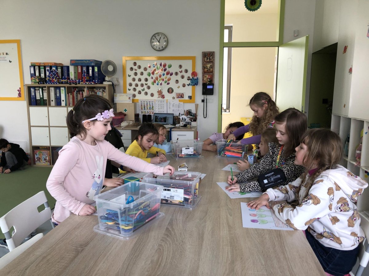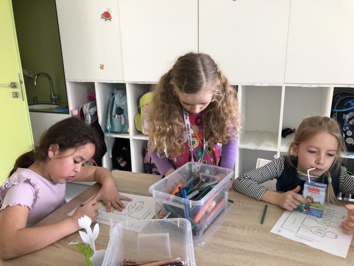 Dnes jsme si vyrobili tulipánový kruh, který může zdobit skleničku nebo okno. Děti dostaly předlohu, podle které vybarvily tulipánky, pak je podlepily a pečlivě stočily do kruhu. Každý kruh byl originální a krásně barevný. Jako včera, i dnes svítilo sluníčko, a tak jsme vyběhli ven, kde jsme si užili spoustu her a zůstali tam až do konce dne. Bylo krásné sledovat, jak děti tvořily a zároveň si užívaly slunečné počasí.