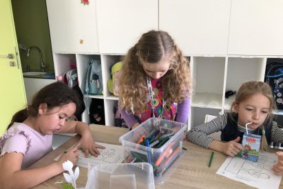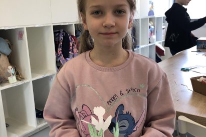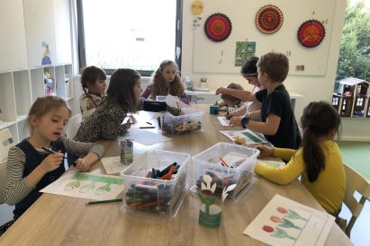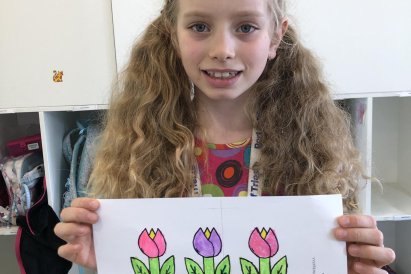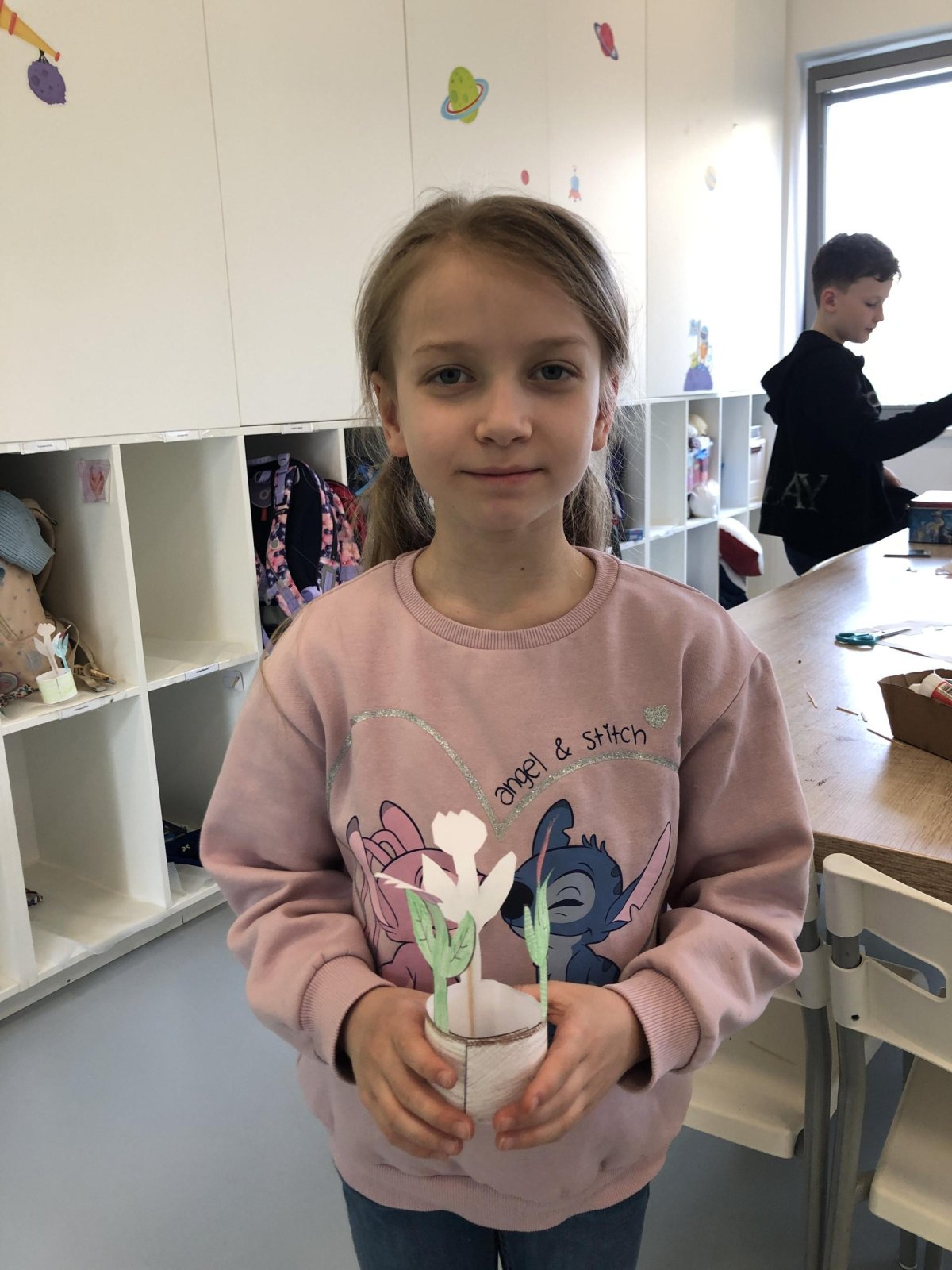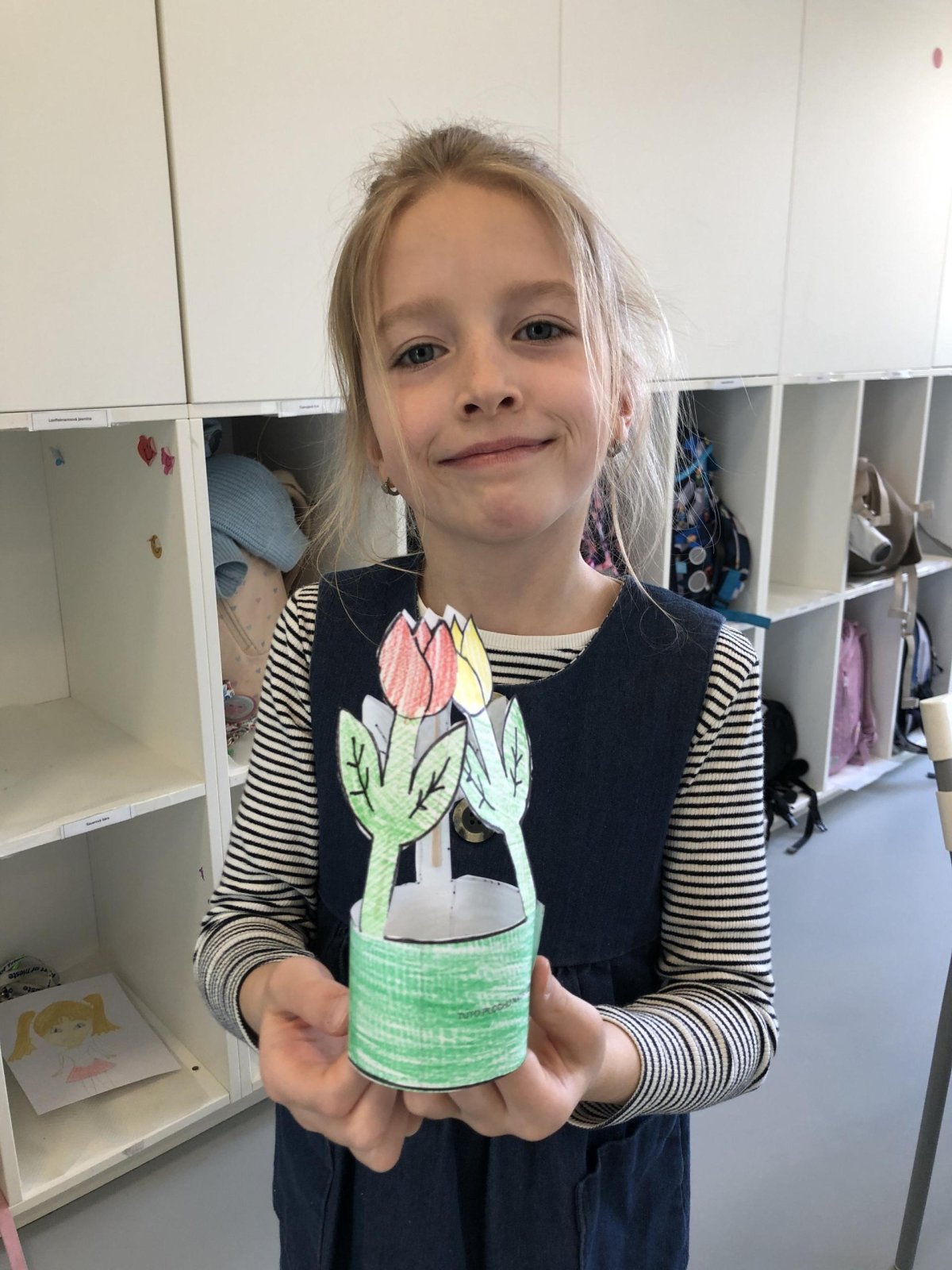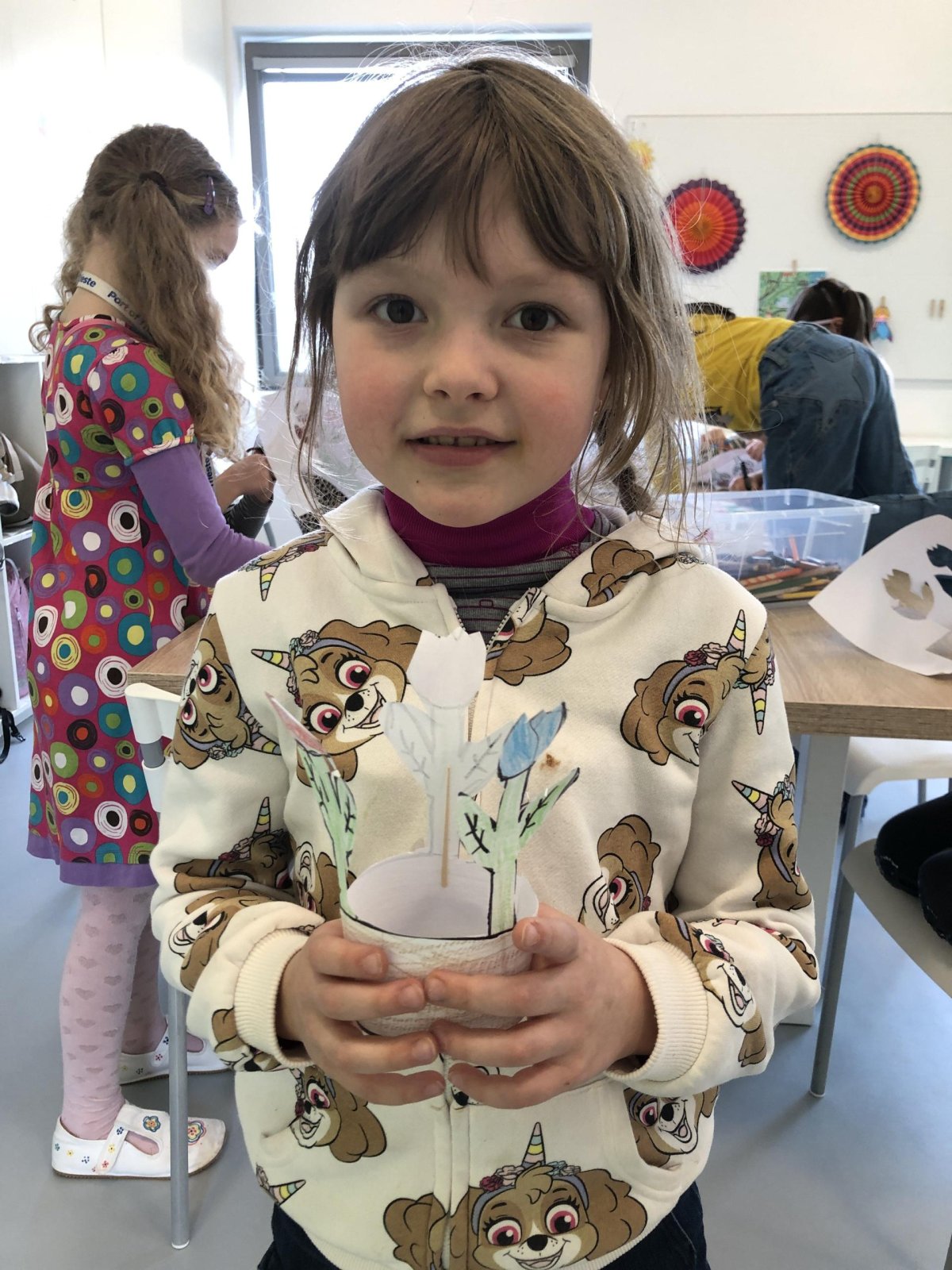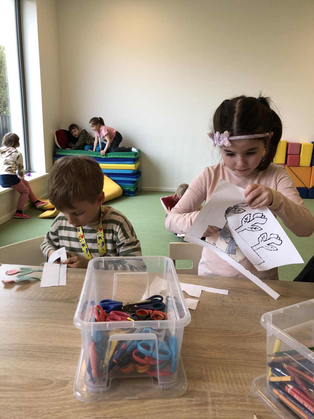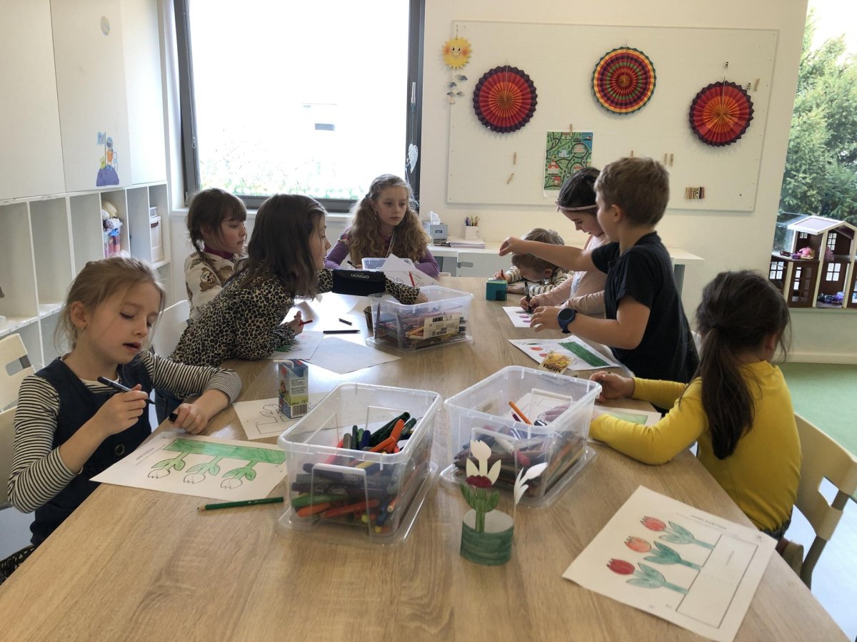 Dnes jsme si vyrobili tulipánový kruh, který může zdobit skleničku nebo okno. Děti dostaly předlohu, podle které vybarvily tulipánky, pak je podlepily a pečlivě stočily do kruhu. Každý kruh byl originální a krásně barevný. Jako včera, i dnes svítilo sluníčko, a tak jsme vyběhli ven, kde jsme si užili spoustu her a zůstali tam až do konce dne. Bylo krásné sledovat, jak děti tvořily a zároveň si užívaly slunečné počasí.