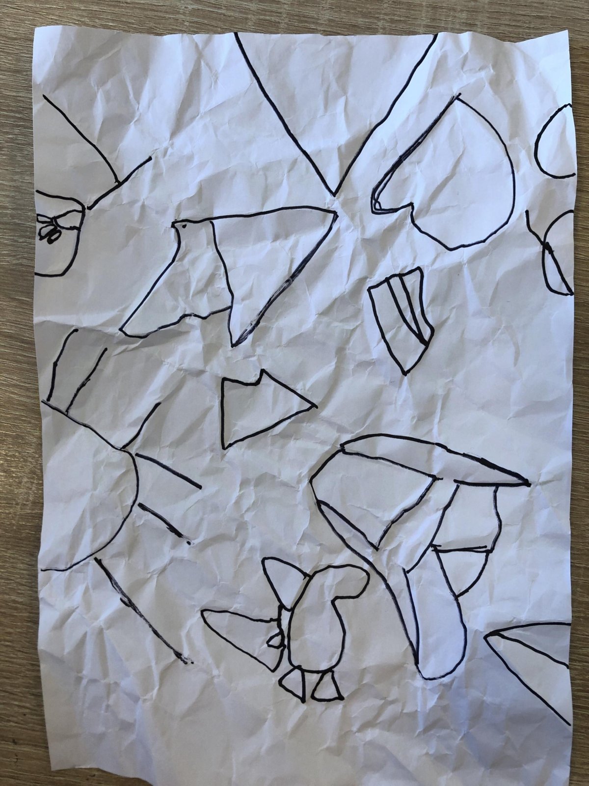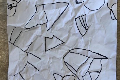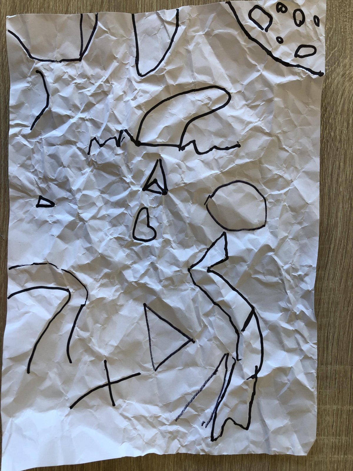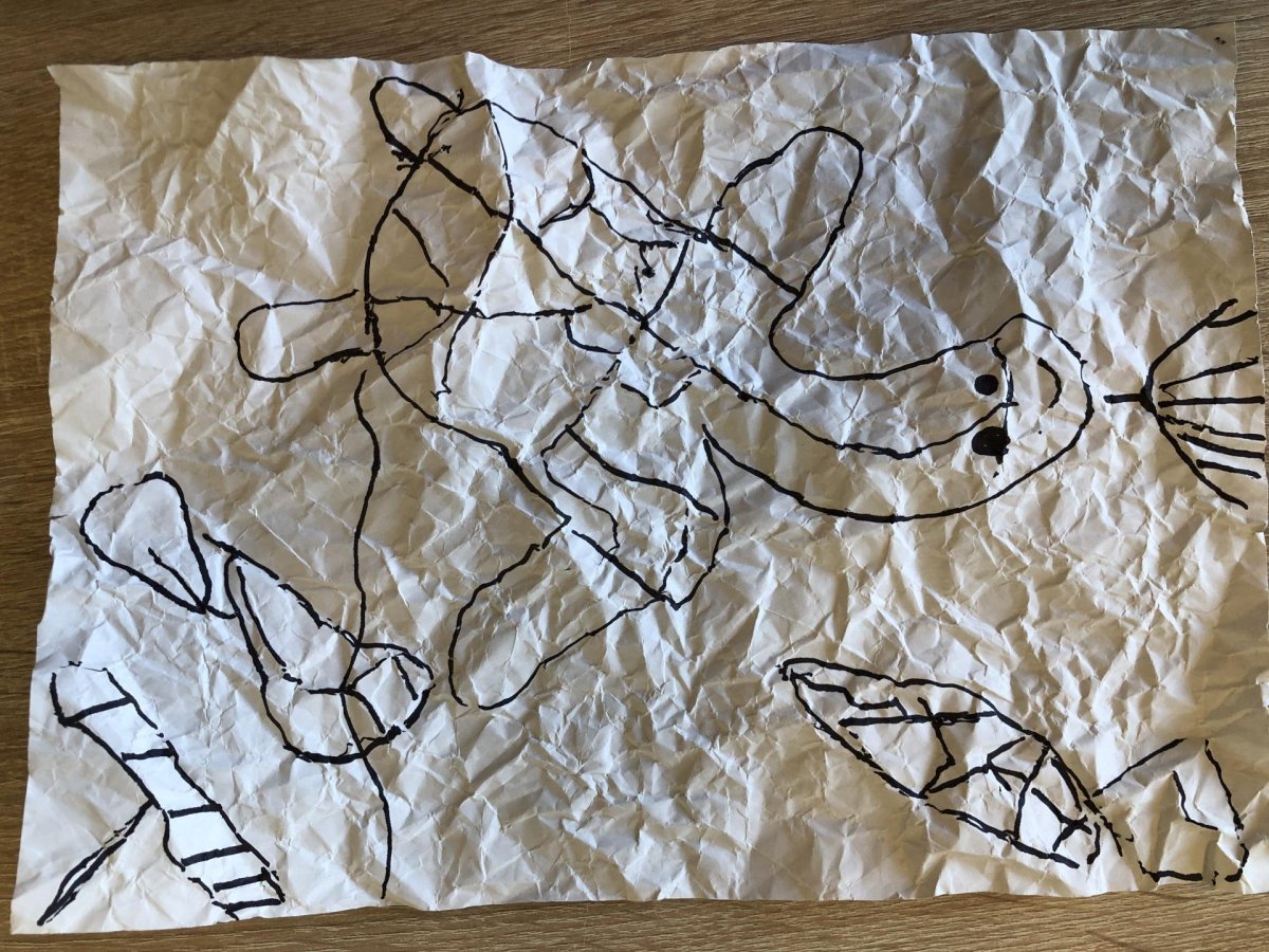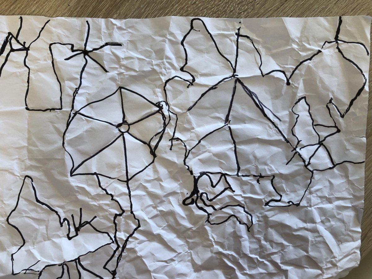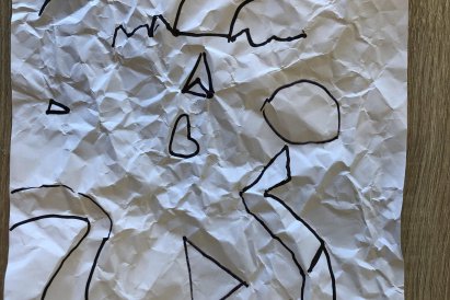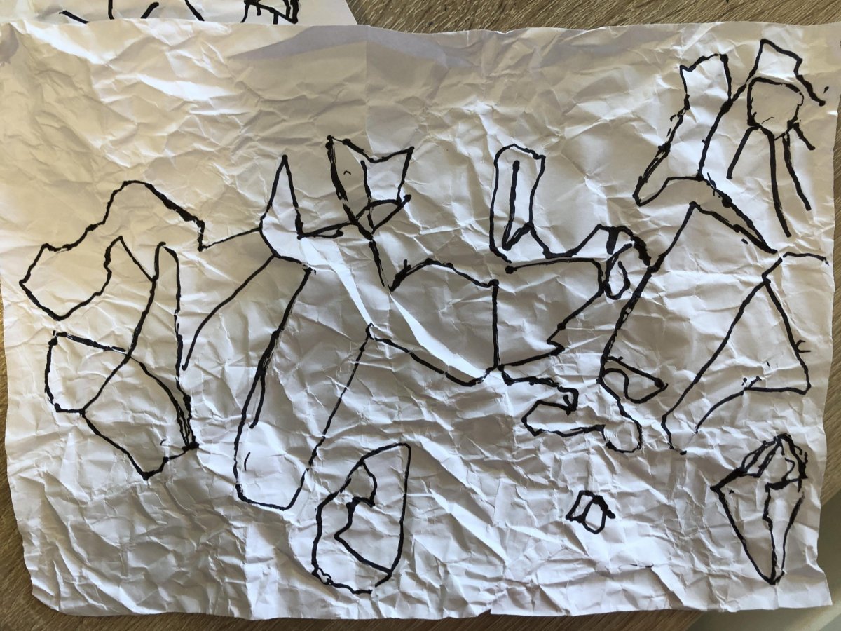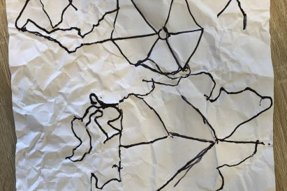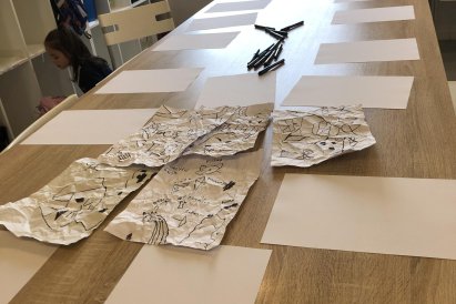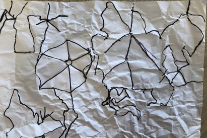 Každé dítě dostalo velký arch papíru, který nejdřív pořádně pomačkalo – a pak ho zase rozložilo. Do ruky dostaly fixu a jejich úkolem bylo pozorně se zadívat na všechny ty záhyby a čáry, které na papíře vznikly.