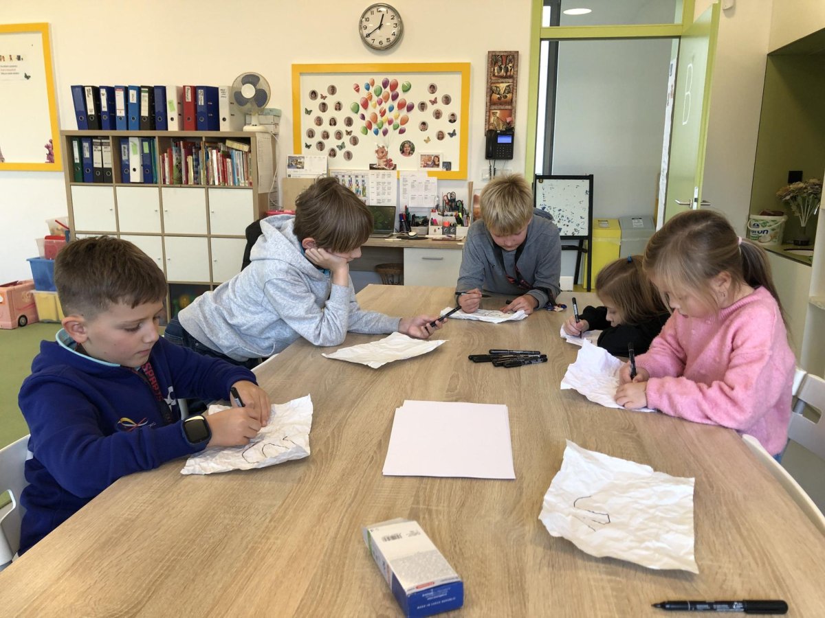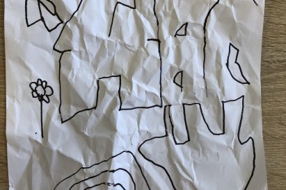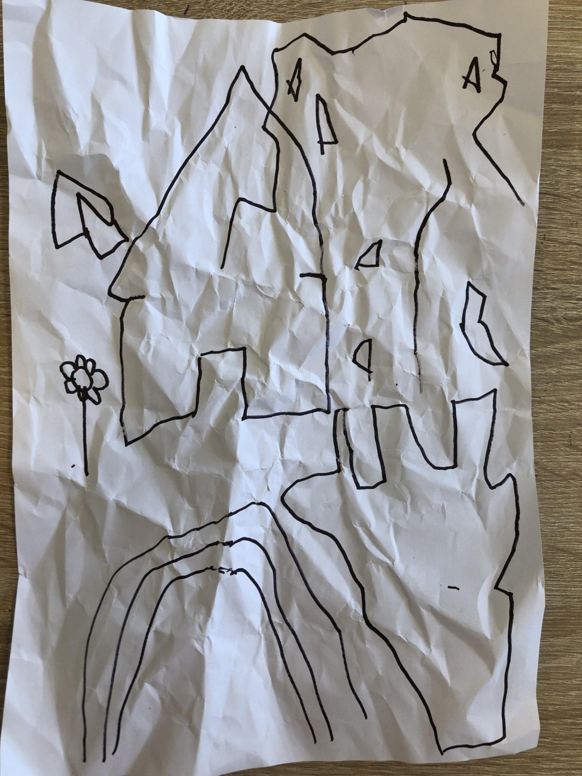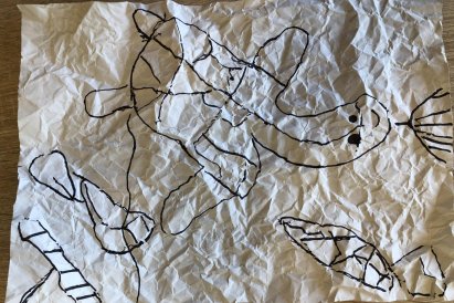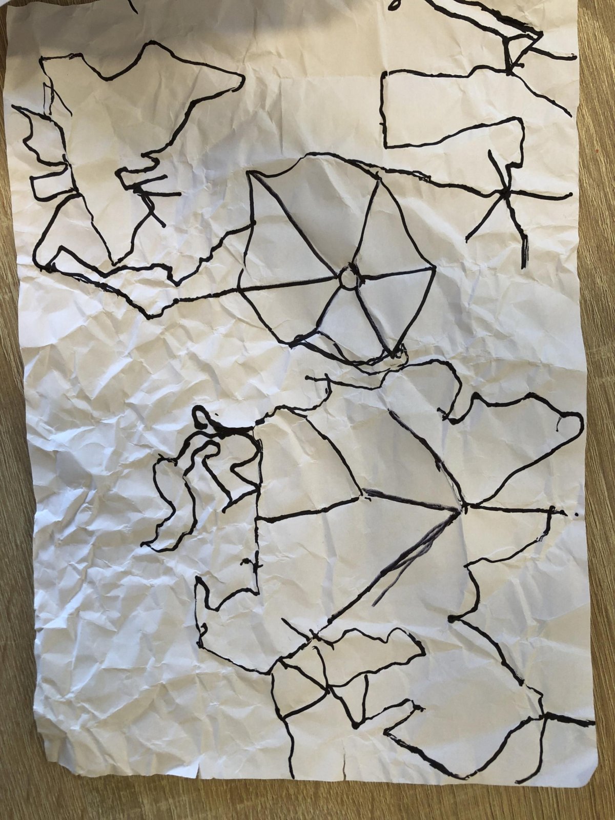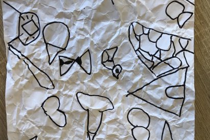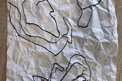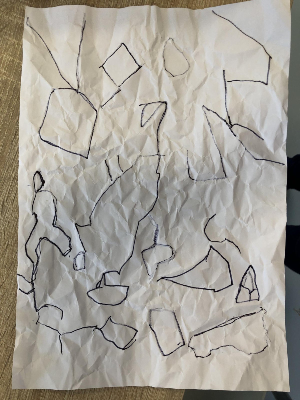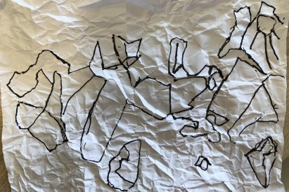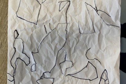 Každé dítě dostalo velký arch papíru, který nejdřív pořádně pomačkalo – a pak ho zase rozložilo. Do ruky dostaly fixu a jejich úkolem bylo pozorně se zadívat na všechny ty záhyby a čáry, které na papíře vznikly.