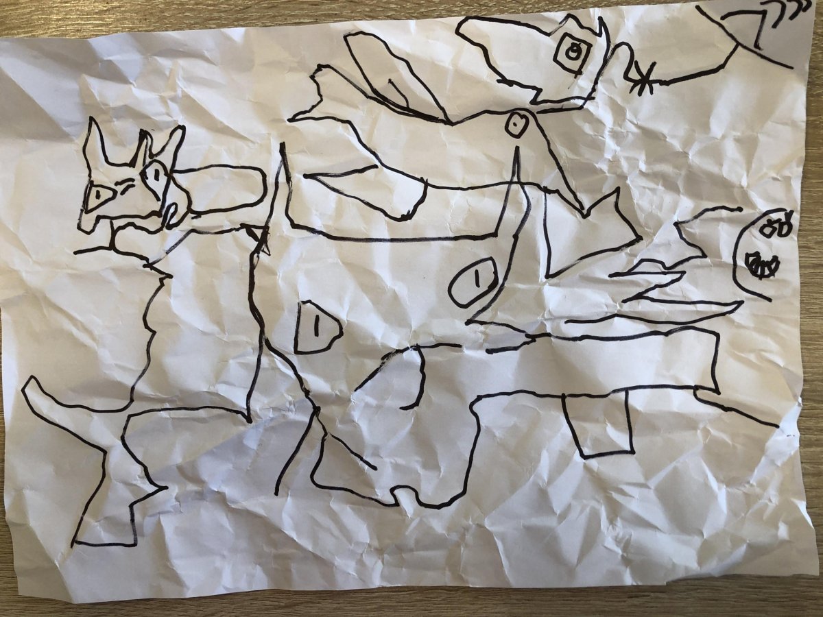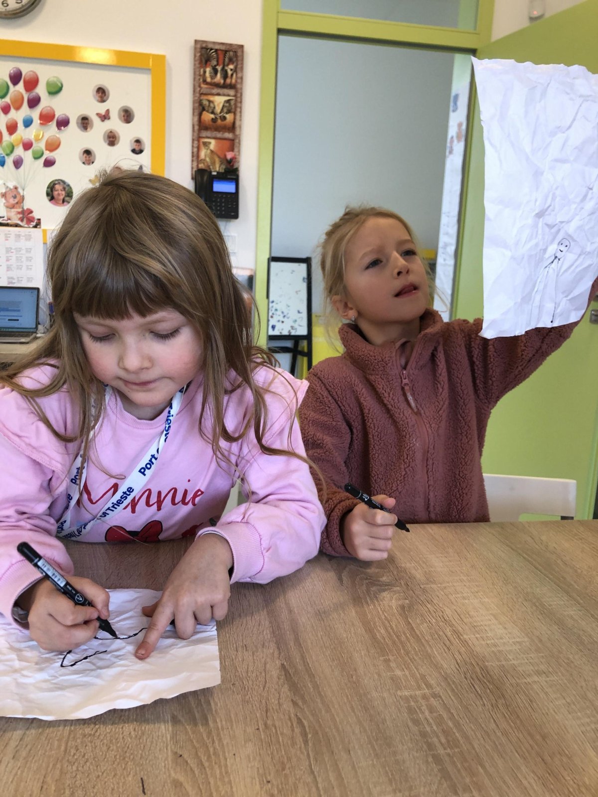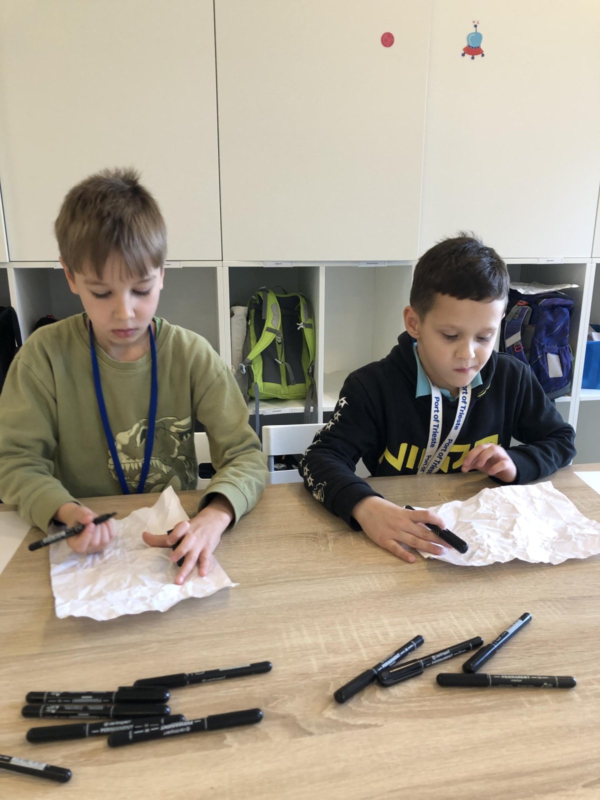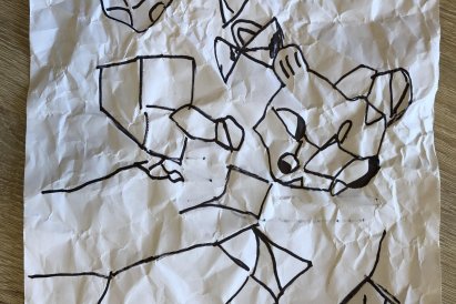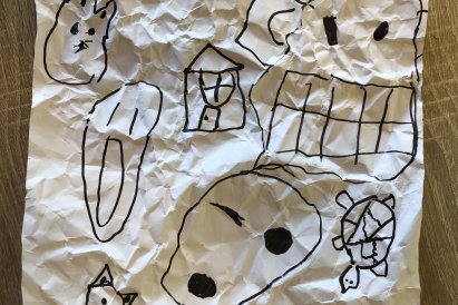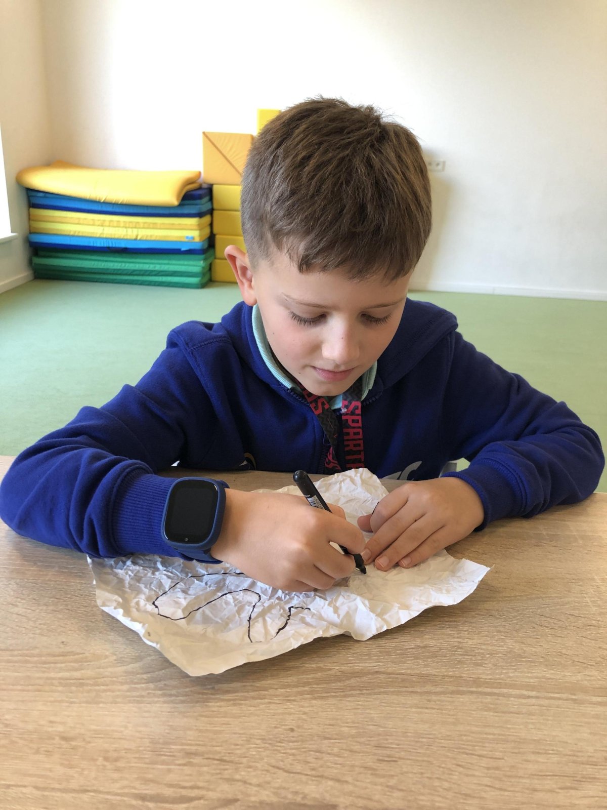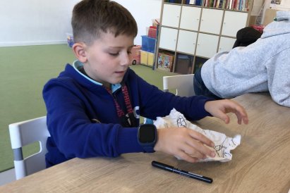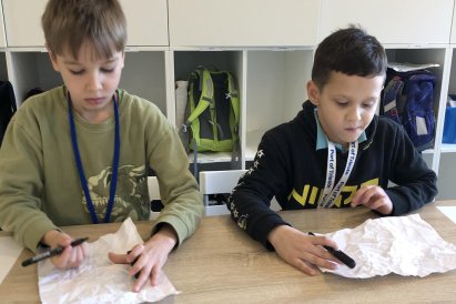 Každé dítě dostalo velký arch papíru, který nejdřív pořádně pomačkalo – a pak ho zase rozložilo. Do ruky dostaly fixu a jejich úkolem bylo pozorně se zadívat na všechny ty záhyby a čáry, které na papíře vznikly.