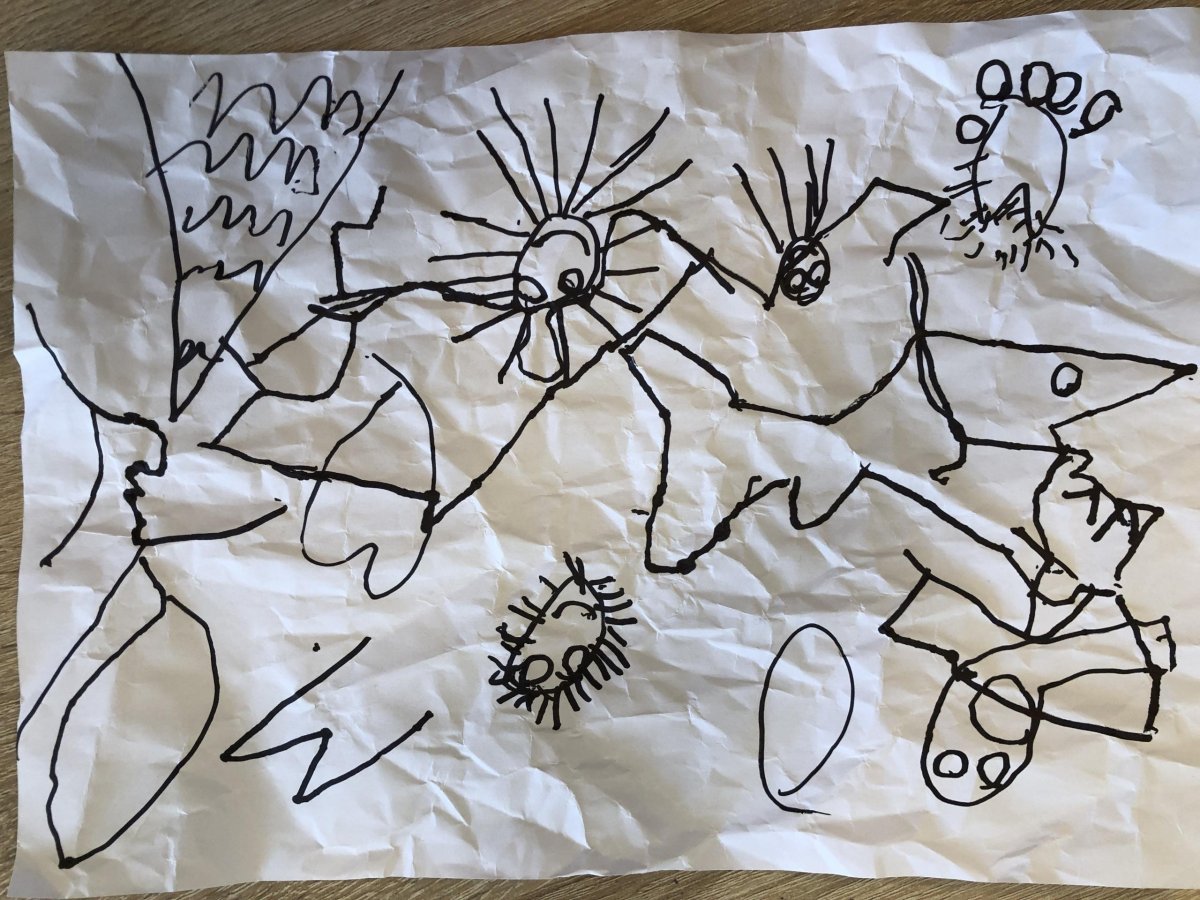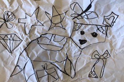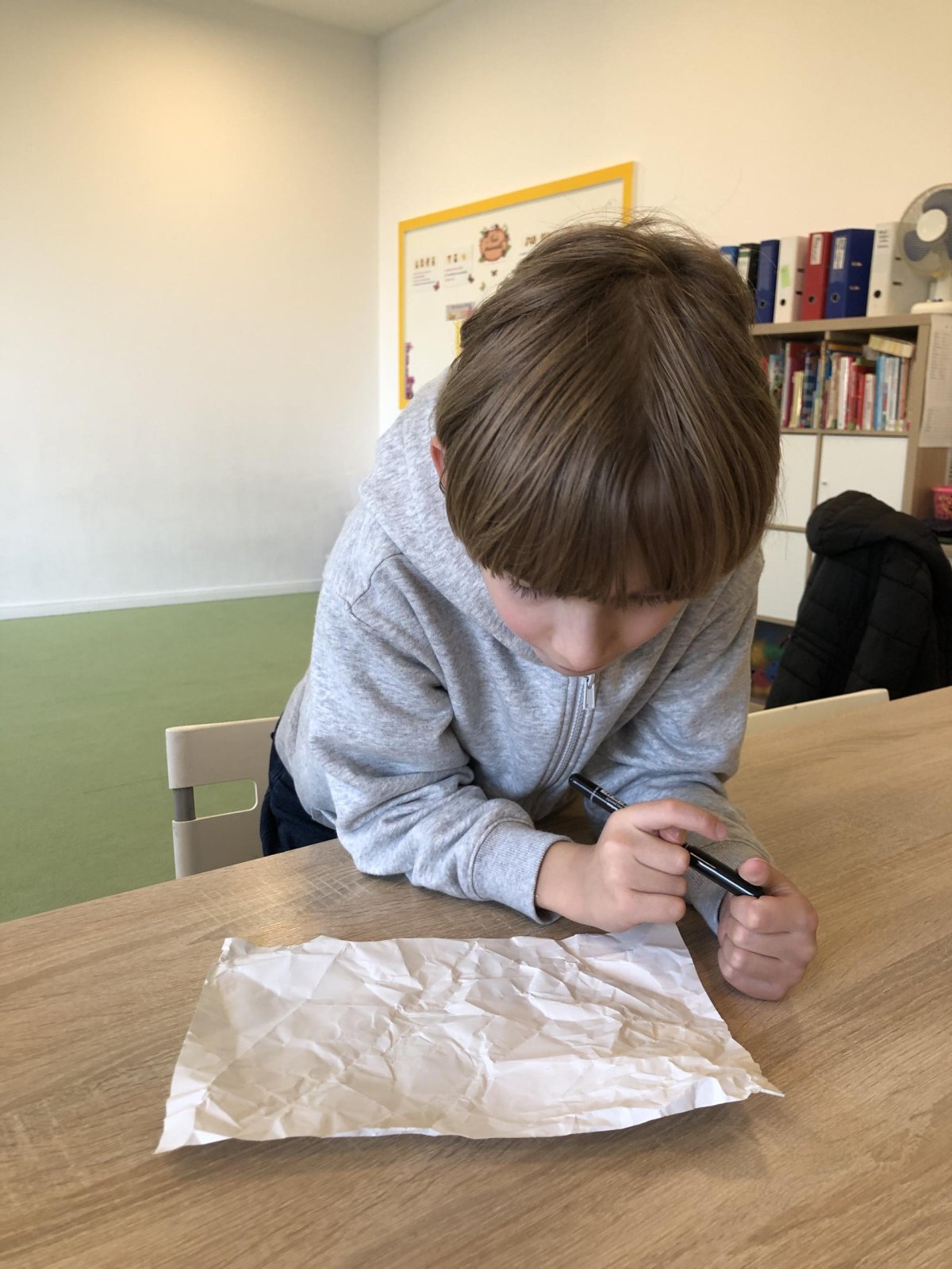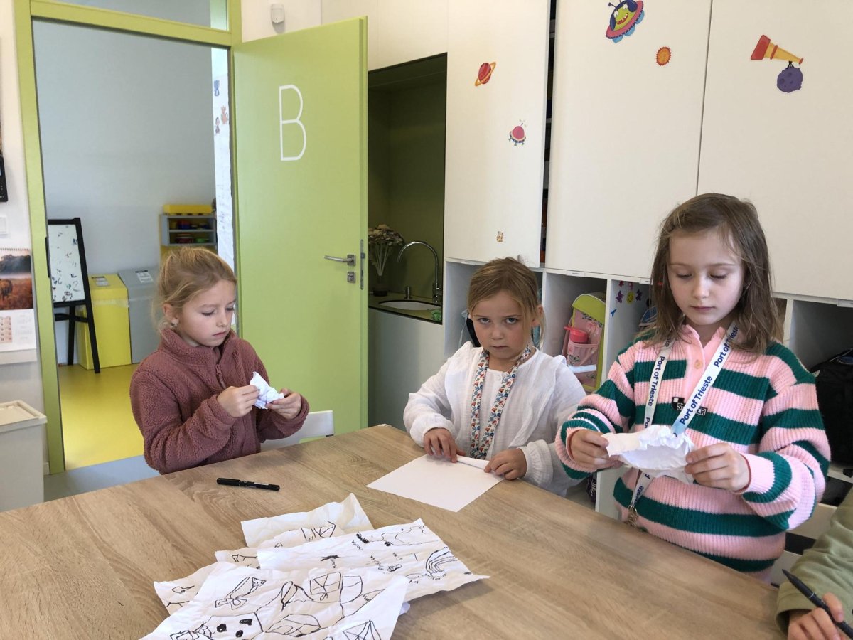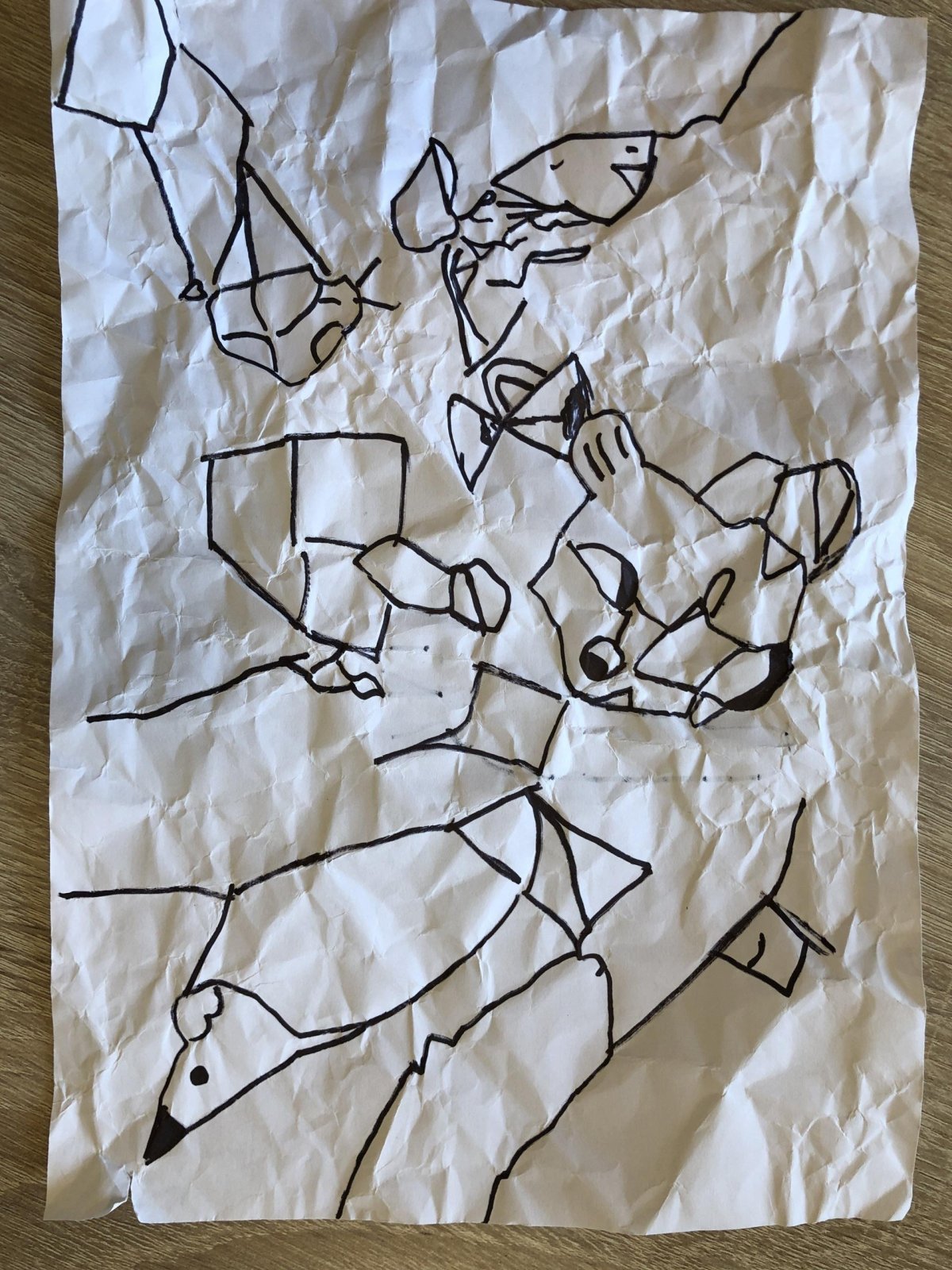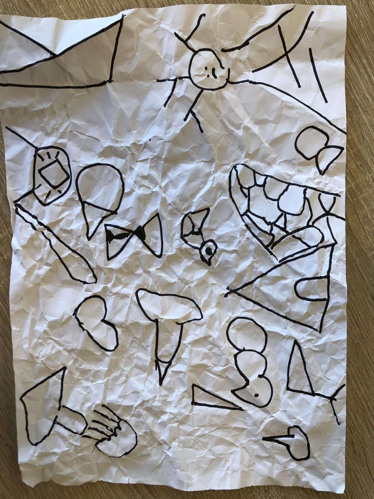 Každé dítě dostalo velký arch papíru, který nejdřív pořádně pomačkalo – a pak ho zase rozložilo. Do ruky dostaly fixu a jejich úkolem bylo pozorně se zadívat na všechny ty záhyby a čáry, které na papíře vznikly.