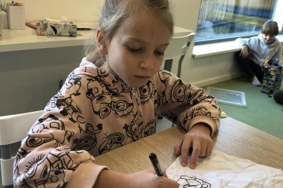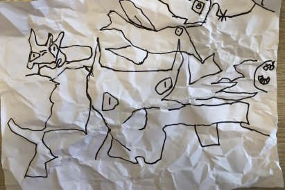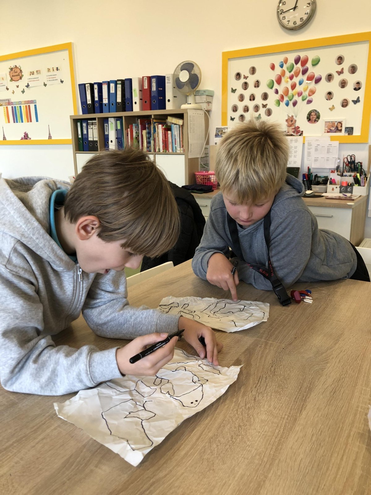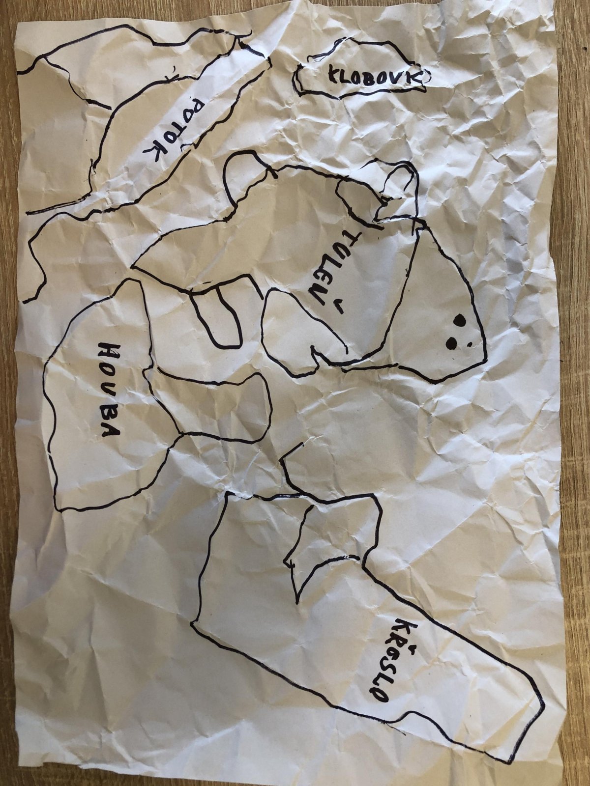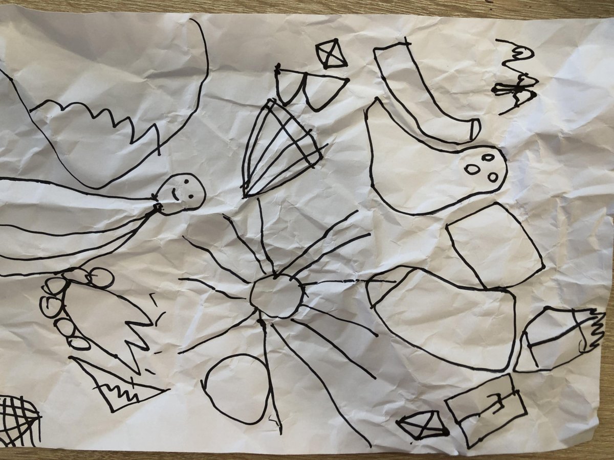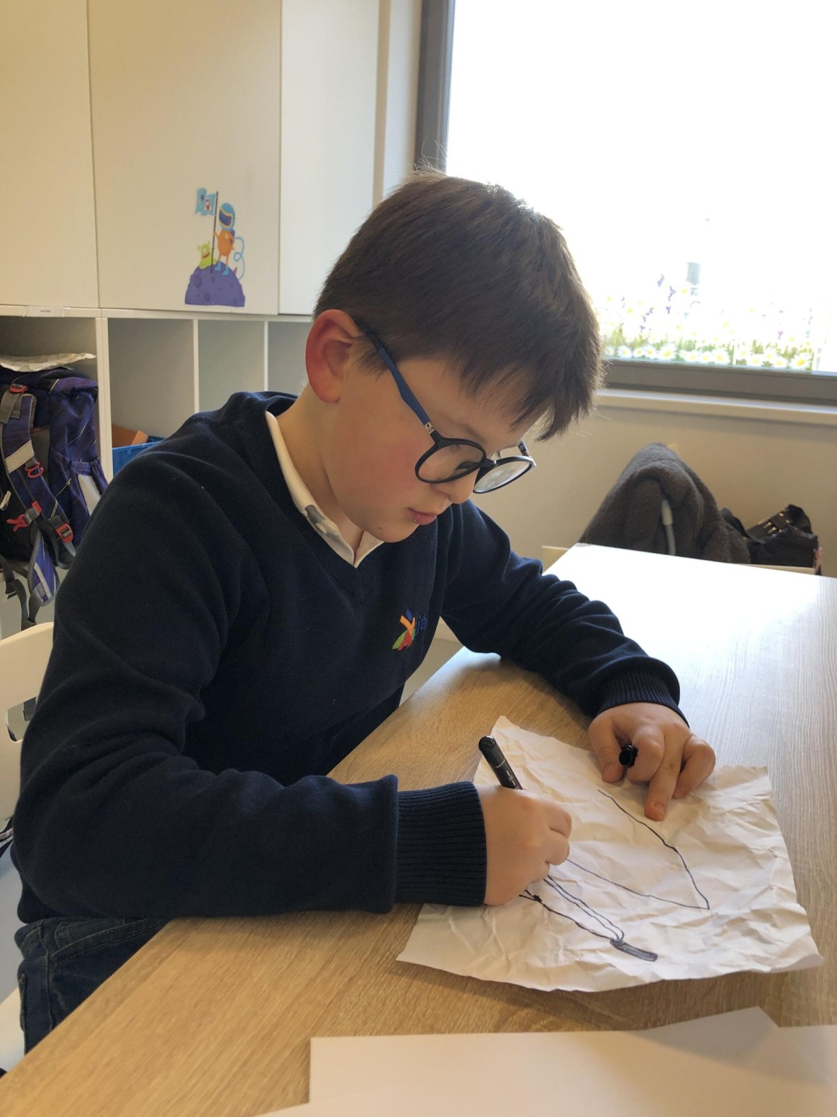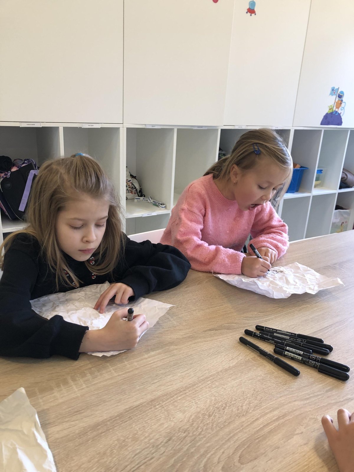 Každé dítě dostalo velký arch papíru, který nejdřív pořádně pomačkalo – a pak ho zase rozložilo. Do ruky dostaly fixu a jejich úkolem bylo pozorně se zadívat na všechny ty záhyby a čáry, které na papíře vznikly.