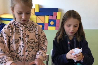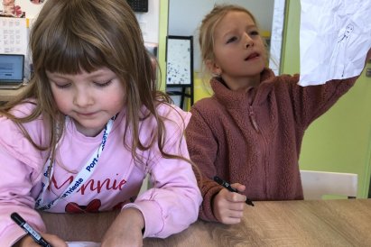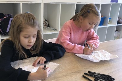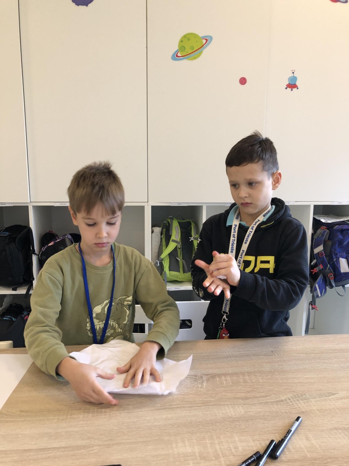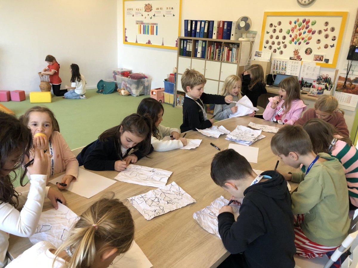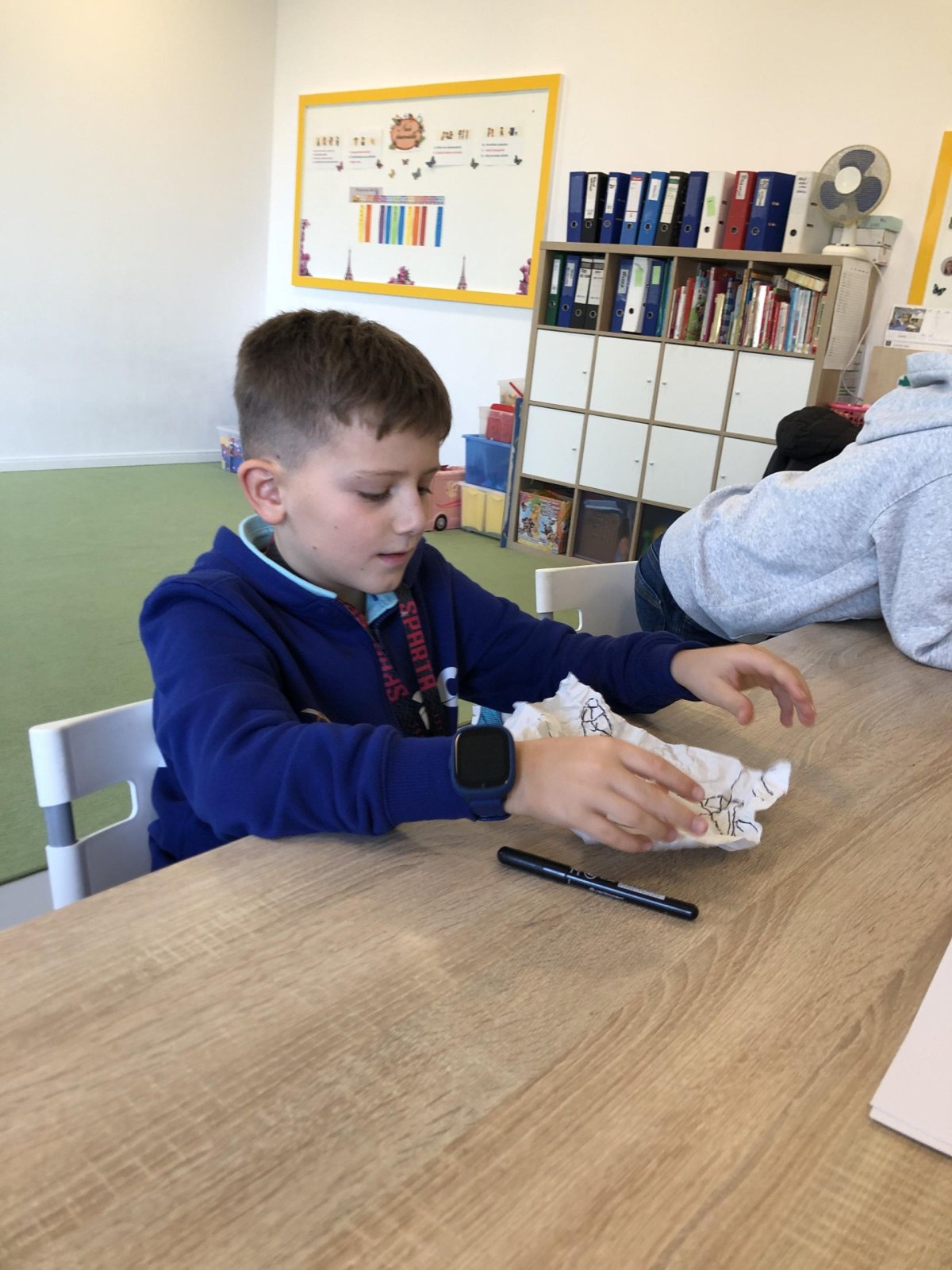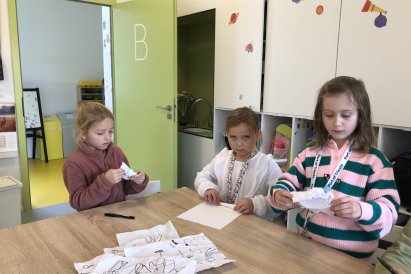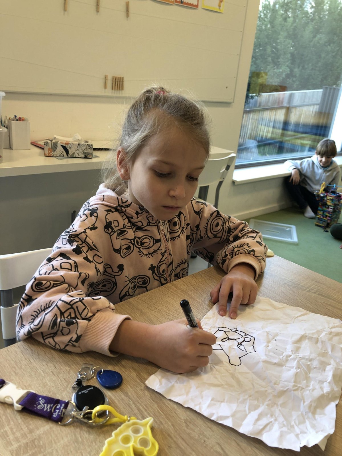 Každé dítě dostalo velký arch papíru, který nejdřív pořádně pomačkalo – a pak ho zase rozložilo. Do ruky dostaly fixu a jejich úkolem bylo pozorně se zadívat na všechny ty záhyby a čáry, které na papíře vznikly.