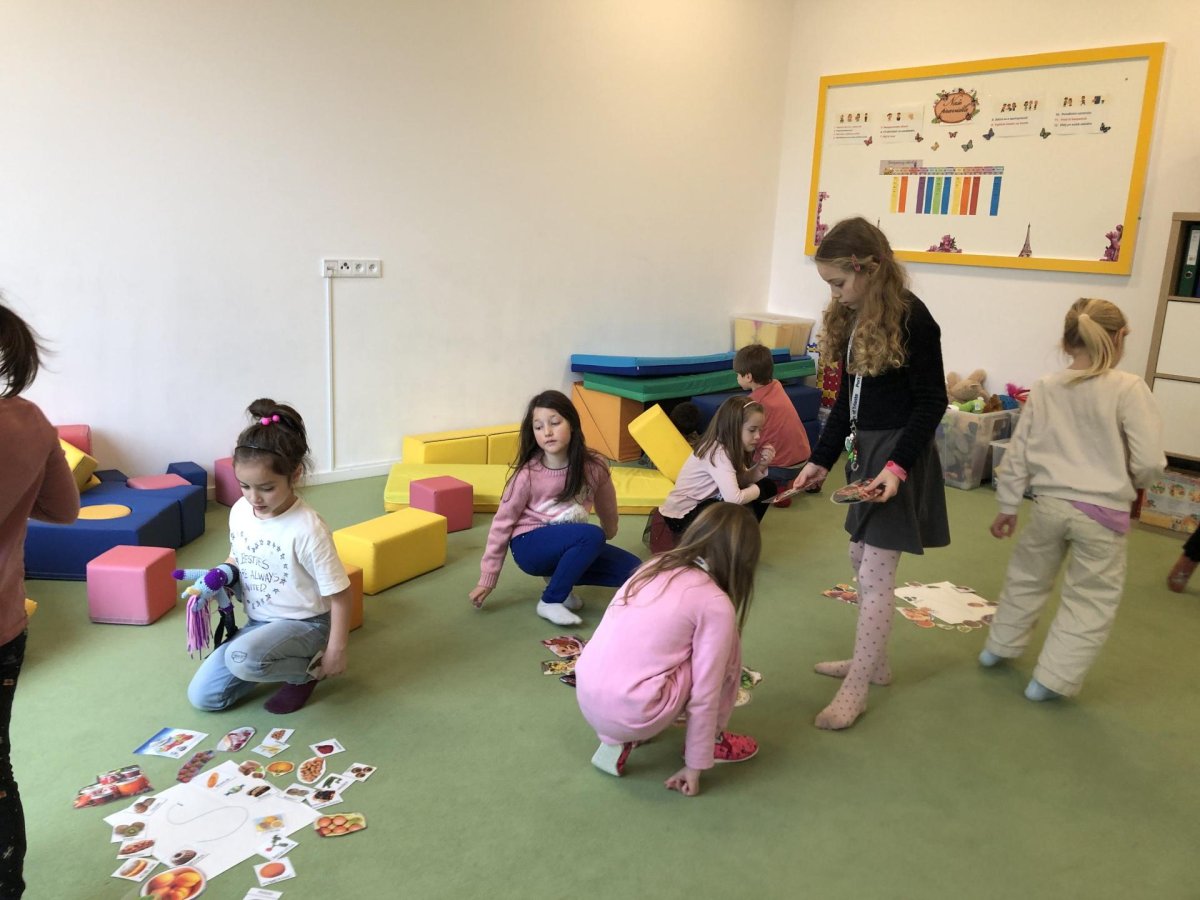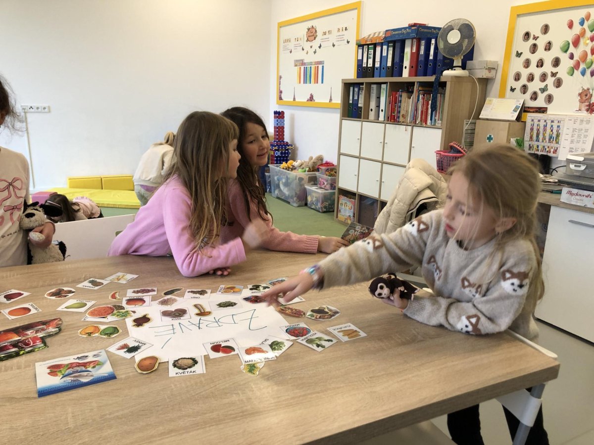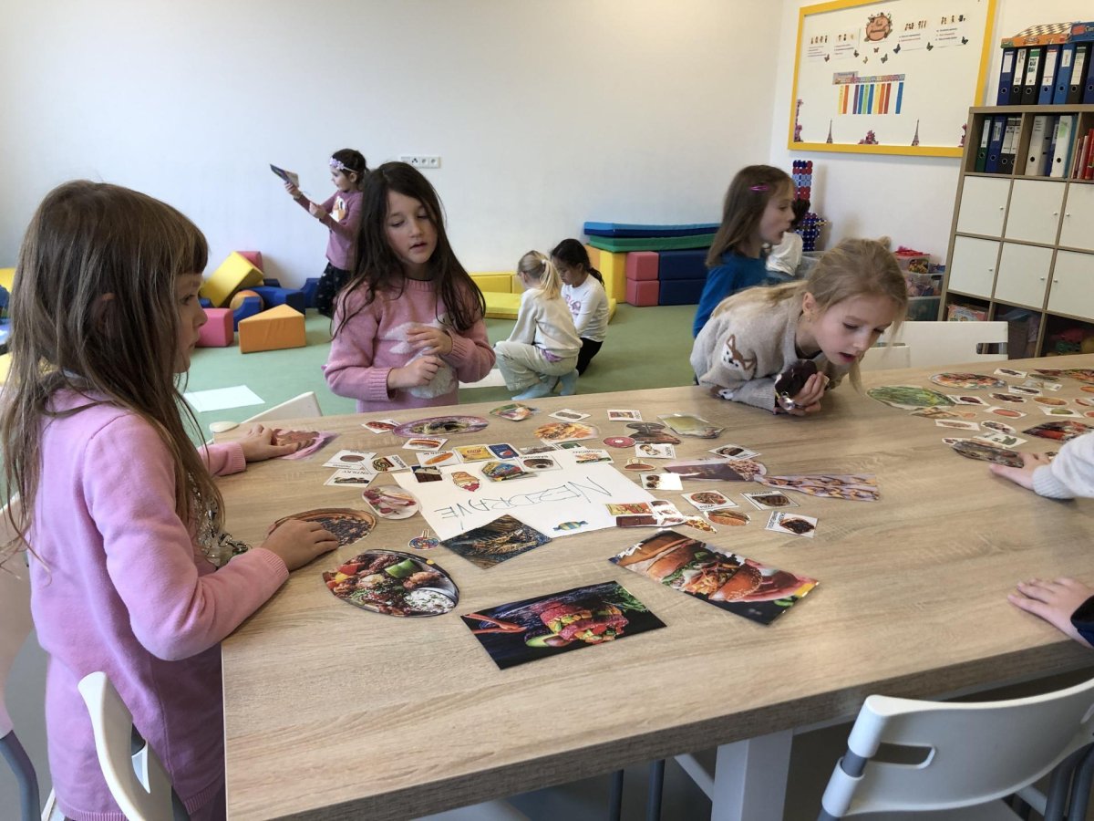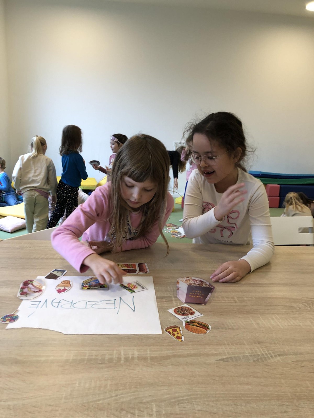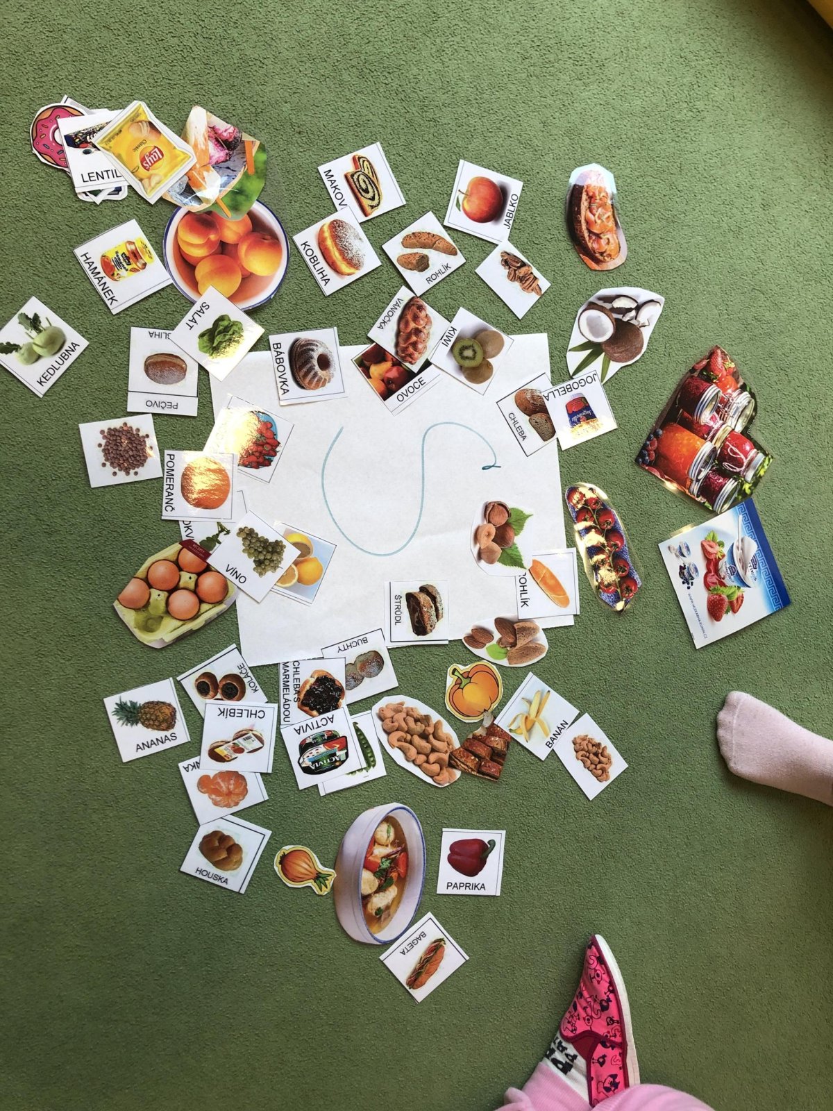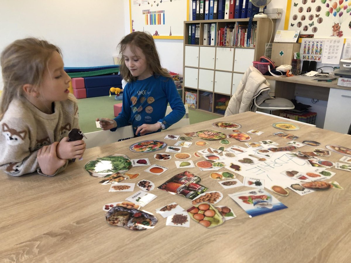Dnes jsme se vydali na malou cestu do světa zdravého jídla a poznávali jsme, co všechno patří do zdravé pyramidy. Na stole jsme měli připravené kartičky s různými potravinami a děti měly za úkol roztřídit je podle toho, co jíme na snídani, oběd a večeři. S velkou chutí se pustily do práce a pečlivě kartičky třídily.