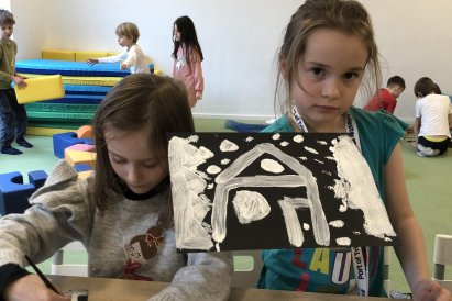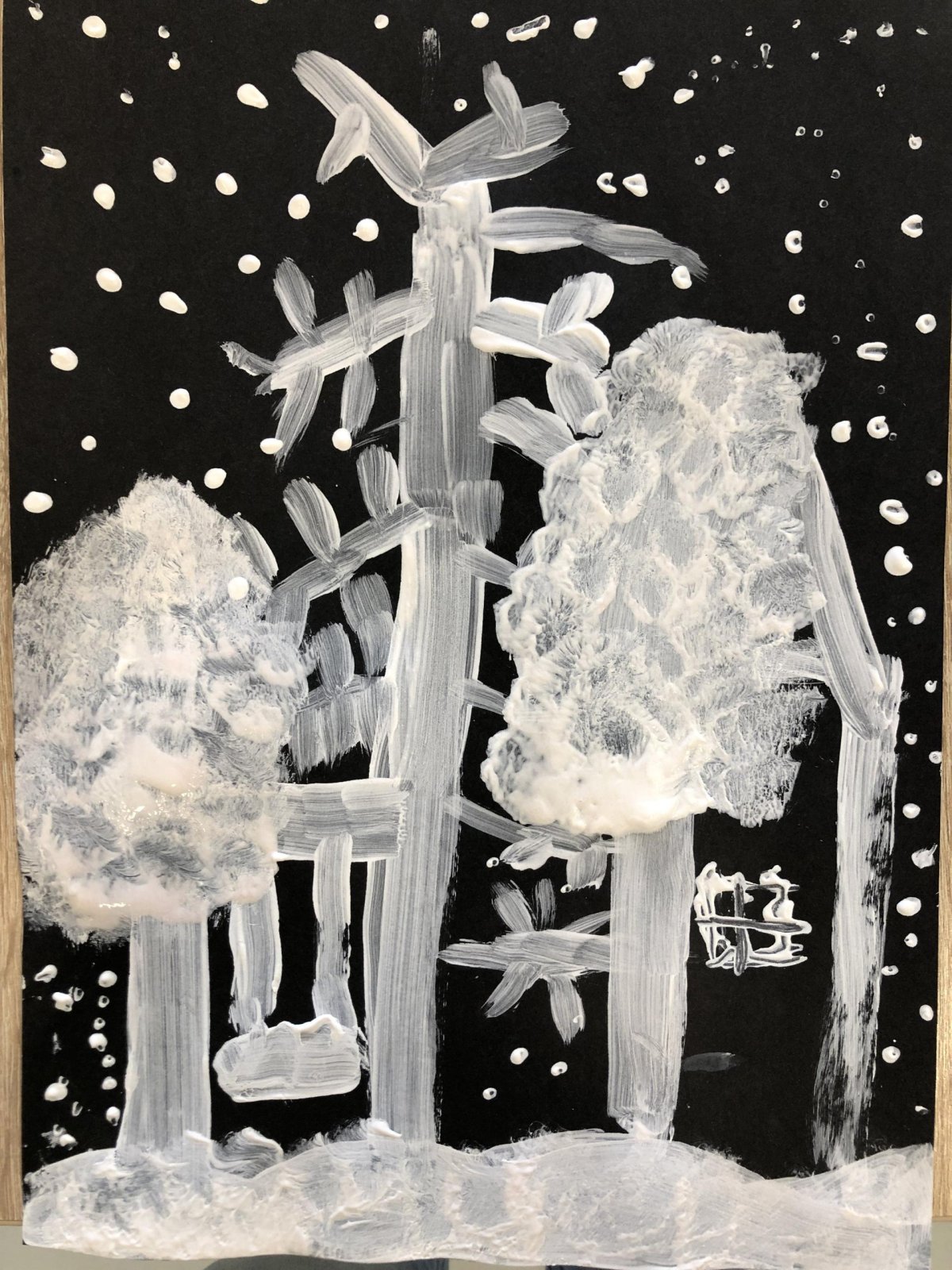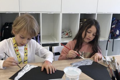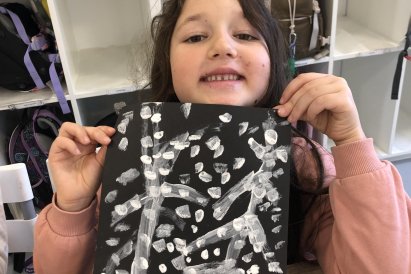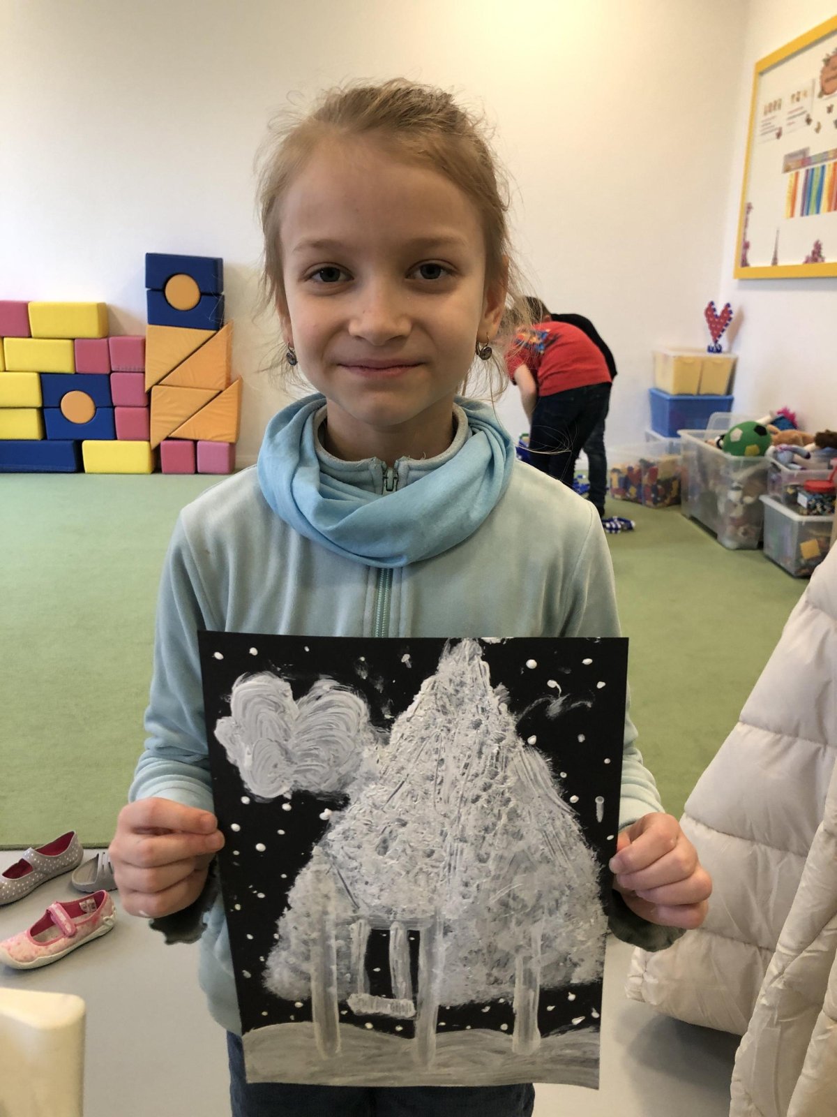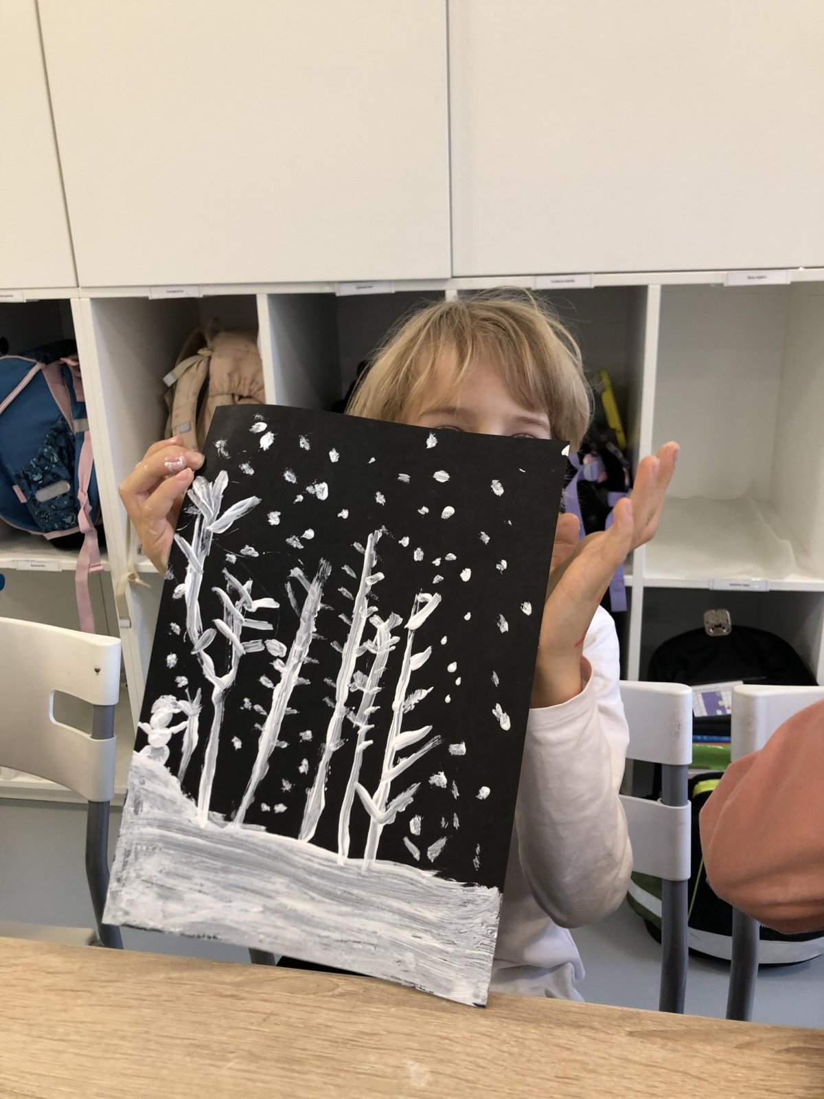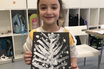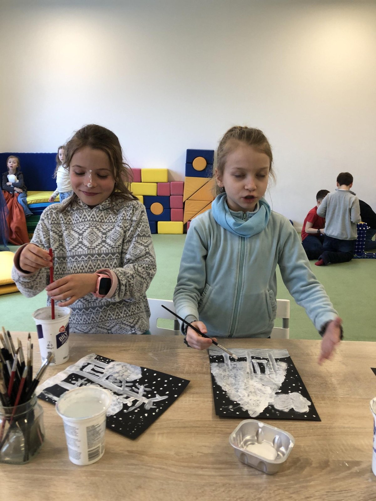 Zimní krajina je tichá a klidná. Sníh pokrývá stromy a pole bílou peřinou. Vzduch je chladný a svěží a obloha má často jemné pastelové barvy. Když jsme dnes malovali štětcem a barvou, snažili jsme se zachytit tu krásu zimního světa a třpytící se sníh, který se třpytí na slunci. Venku se nám už sníh roztopil, tak jsme šli ven a sbírali jsme poslení kousky, které tam zůstali.