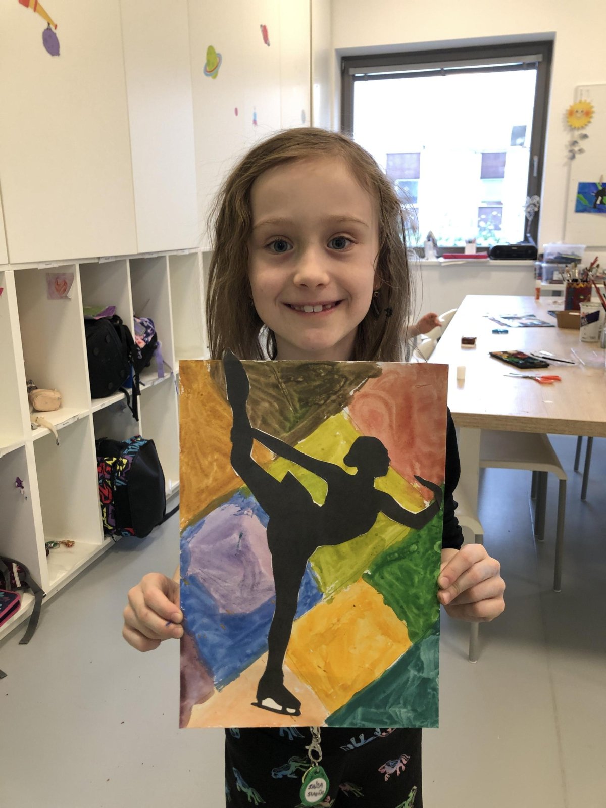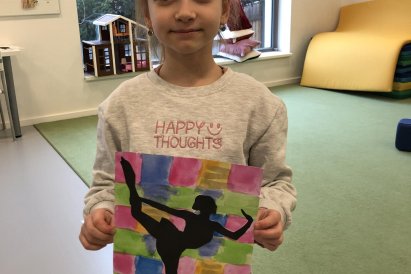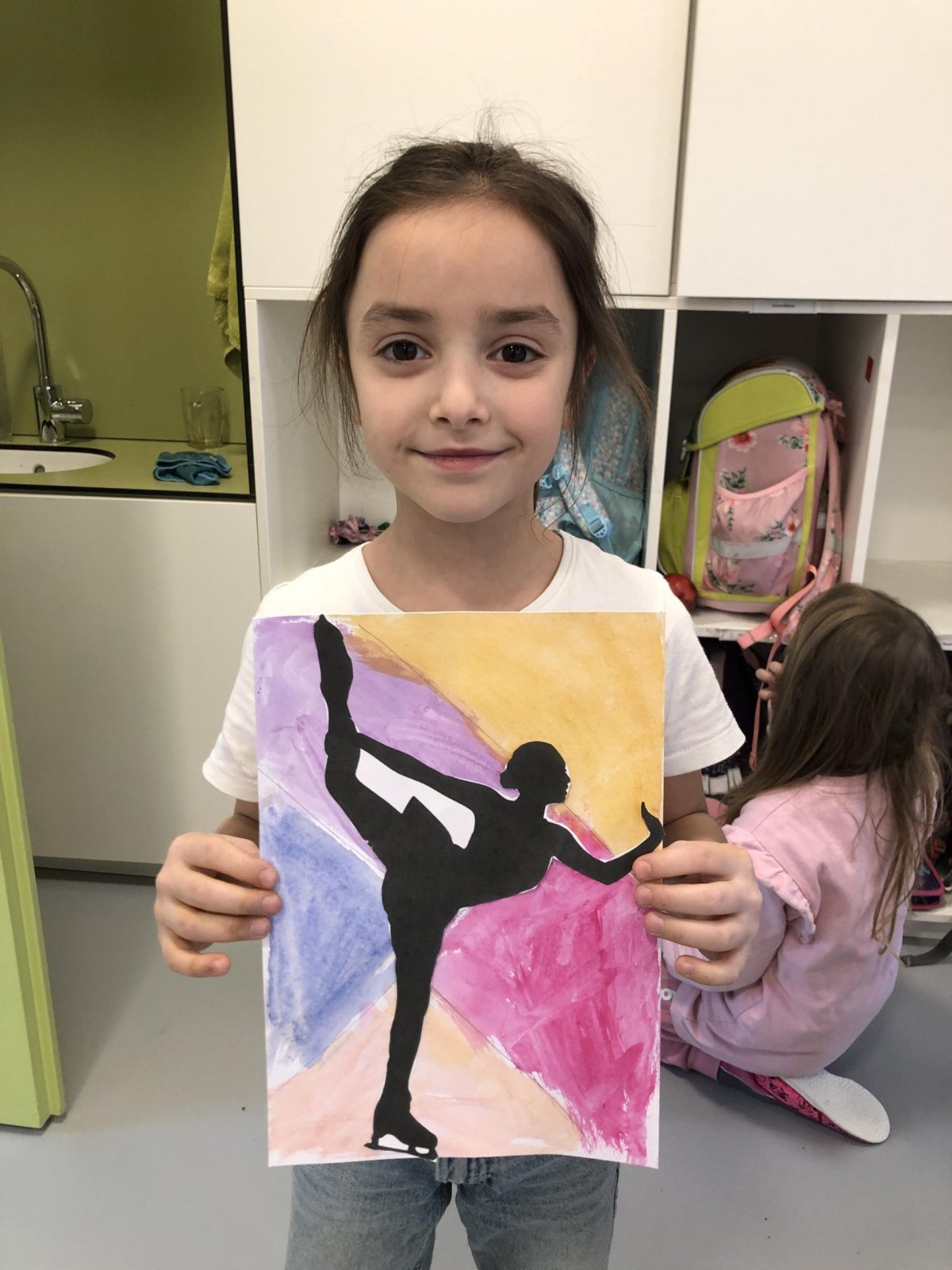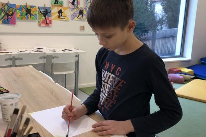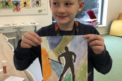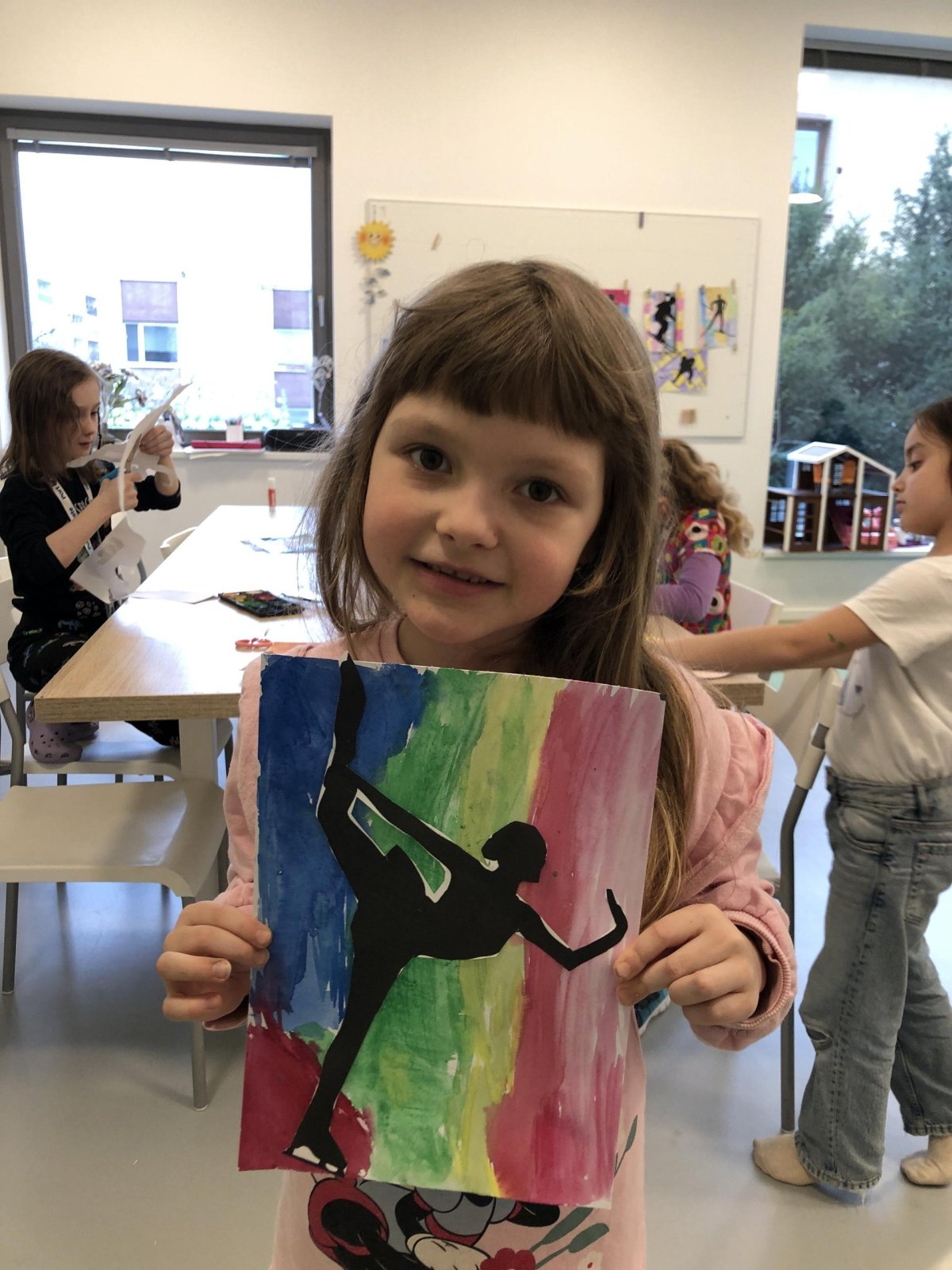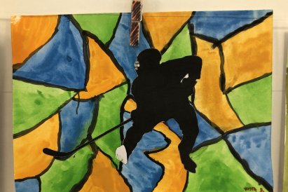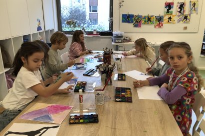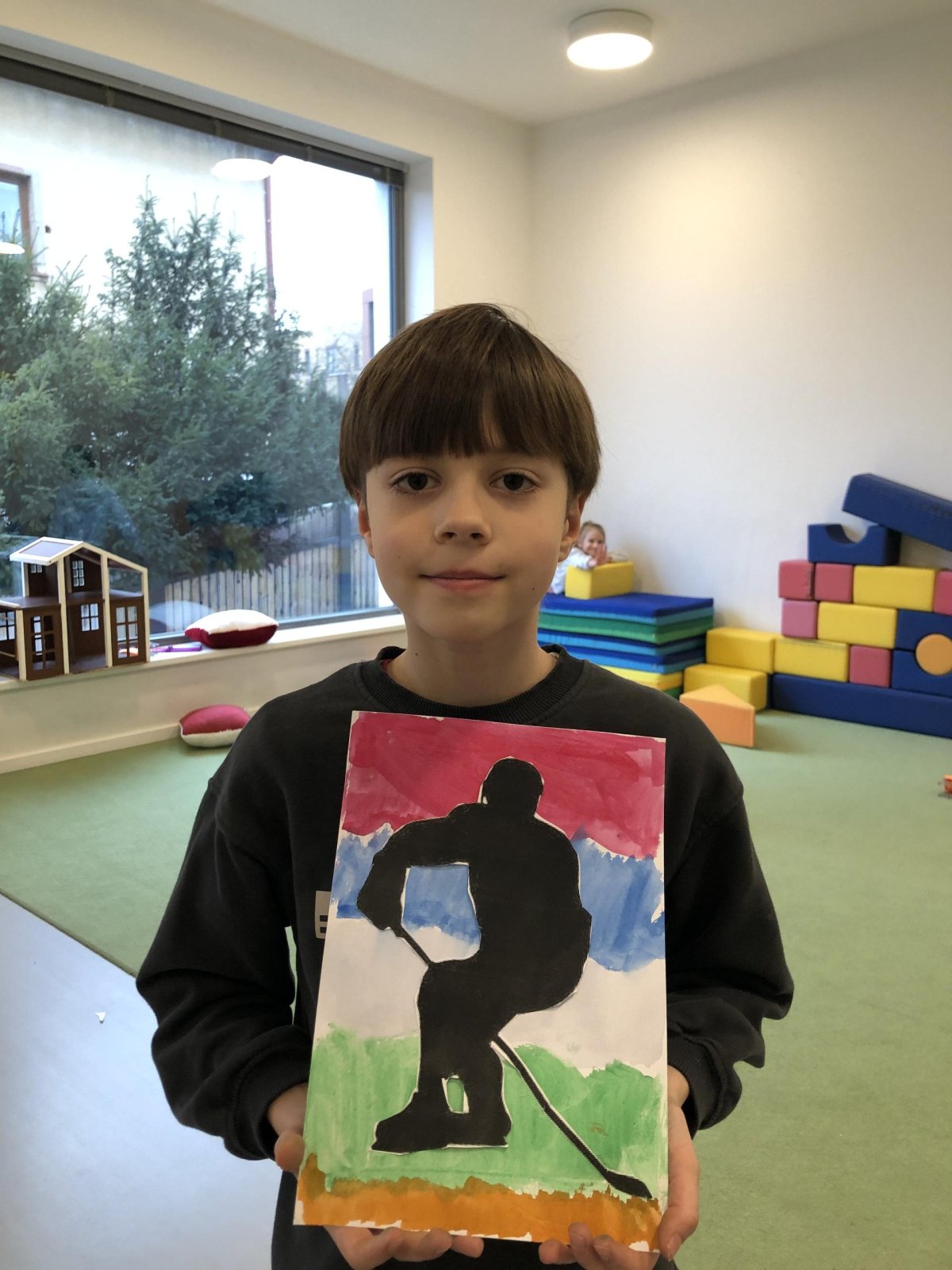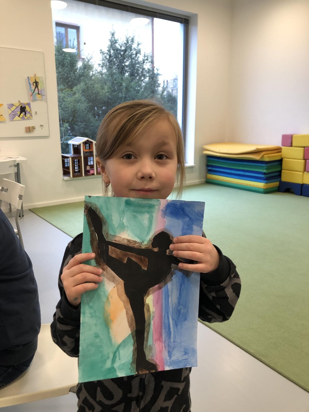 Poté jsme se pustili do výtvarné práce. Děti si nejprve namalovaly barevný podklad a následně na něj nalepily sportovce provozujícího zimní sport. Vznikly tak velmi krásné a nápadité obrázky, které se dětem opravdu povedly. Každý obrázek byl originální a plný barev.