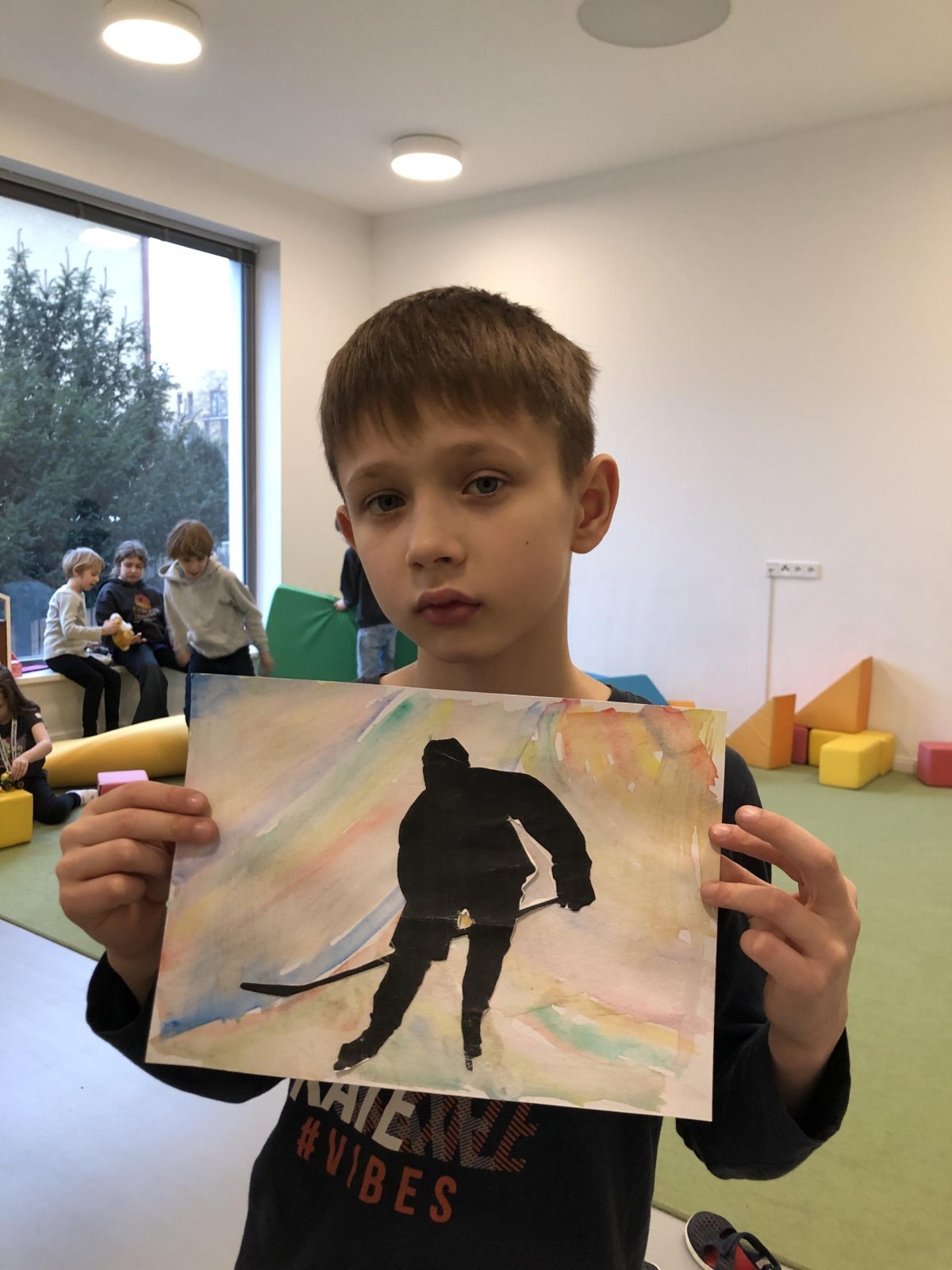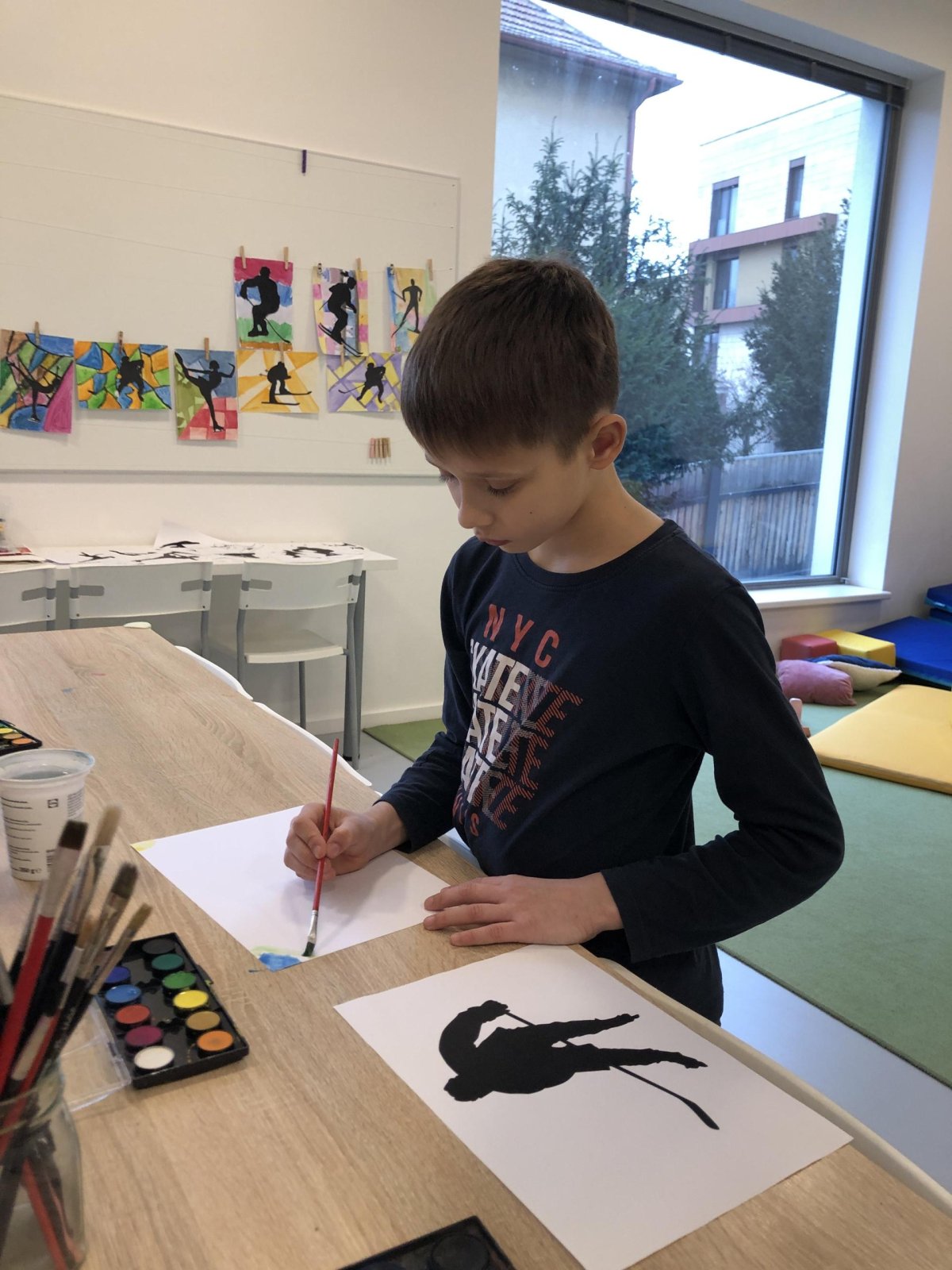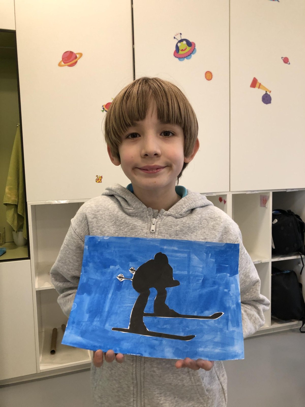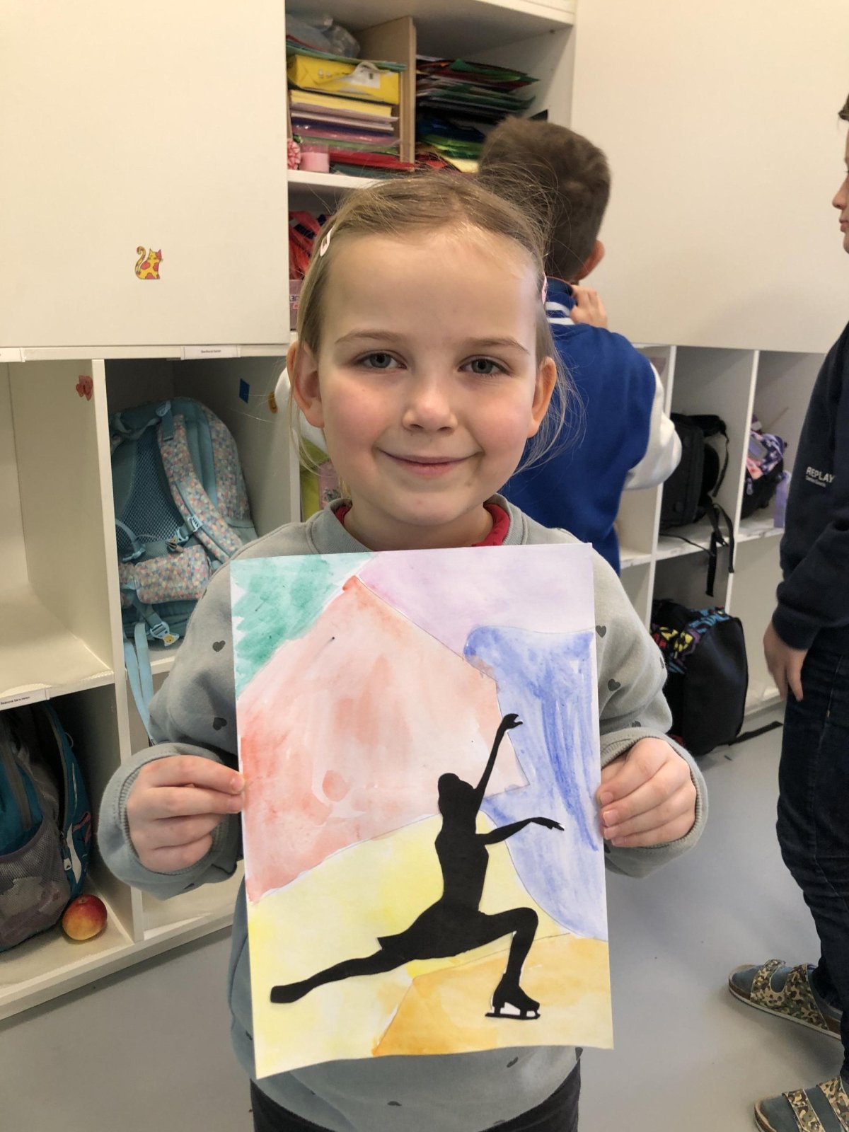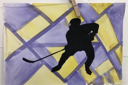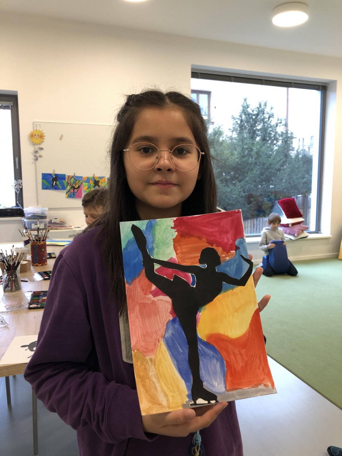 Poté jsme se pustili do výtvarné práce. Děti si nejprve namalovaly barevný podklad a následně na něj nalepily sportovce provozujícího zimní sport. Vznikly tak velmi krásné a nápadité obrázky, které se dětem opravdu povedly. Každý obrázek byl originální a plný barev.