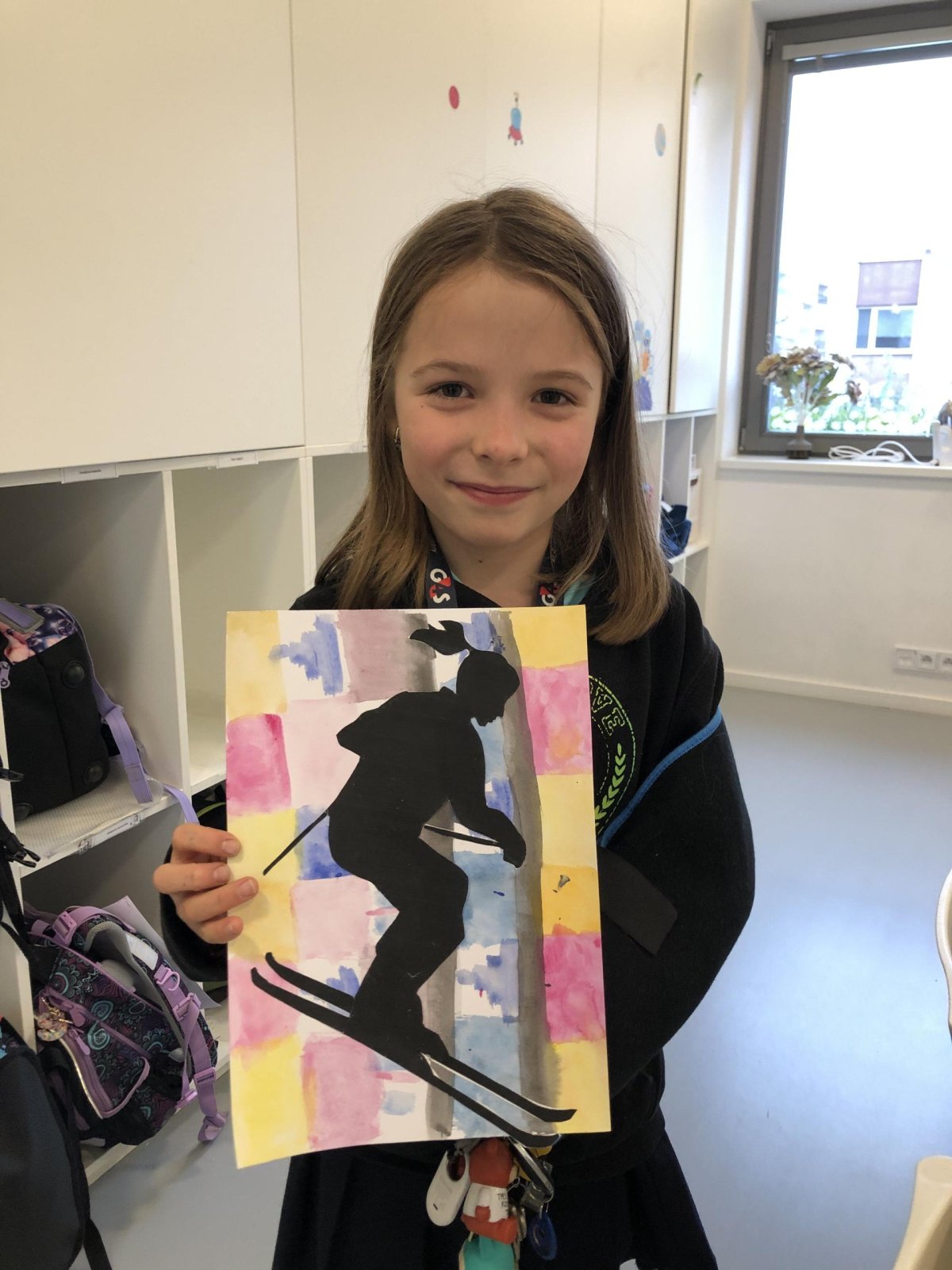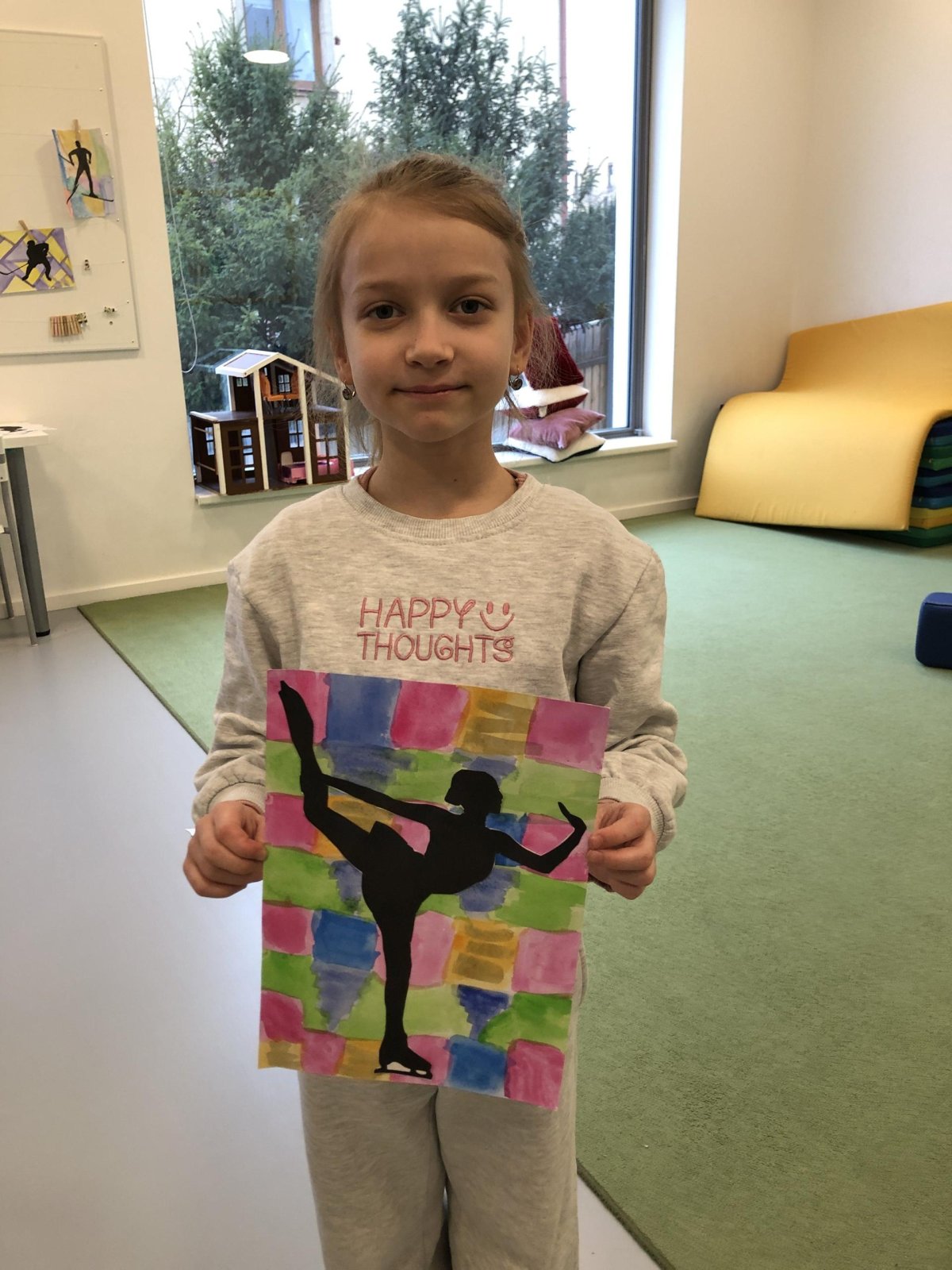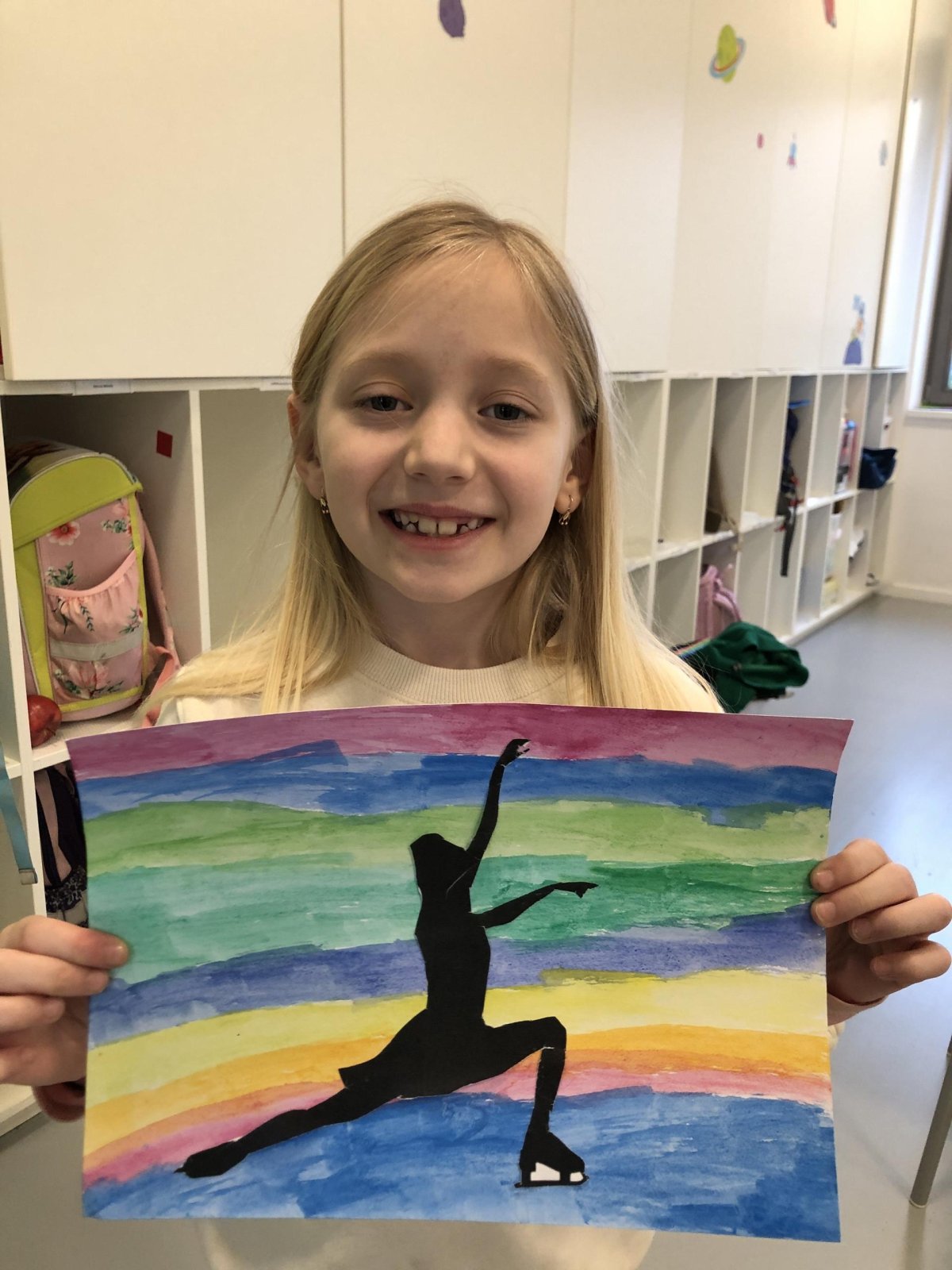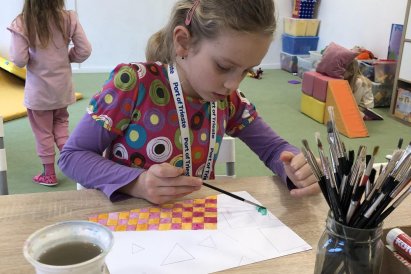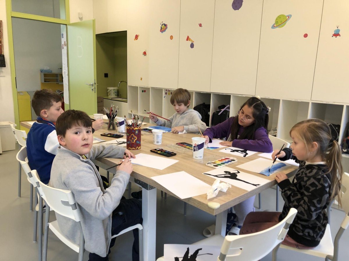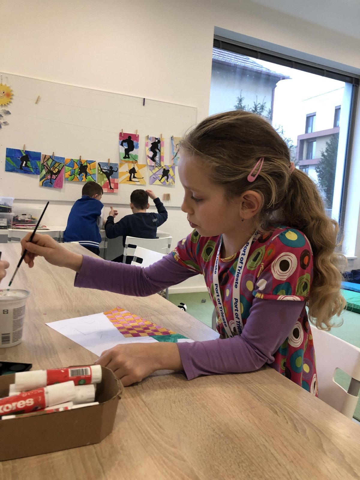 Poté jsme se pustili do výtvarné práce. Děti si nejprve namalovaly barevný podklad a následně na něj nalepily sportovce provozujícího zimní sport. Vznikly tak velmi krásné a nápadité obrázky, které se dětem opravdu povedly. Každý obrázek byl originální a plný barev.