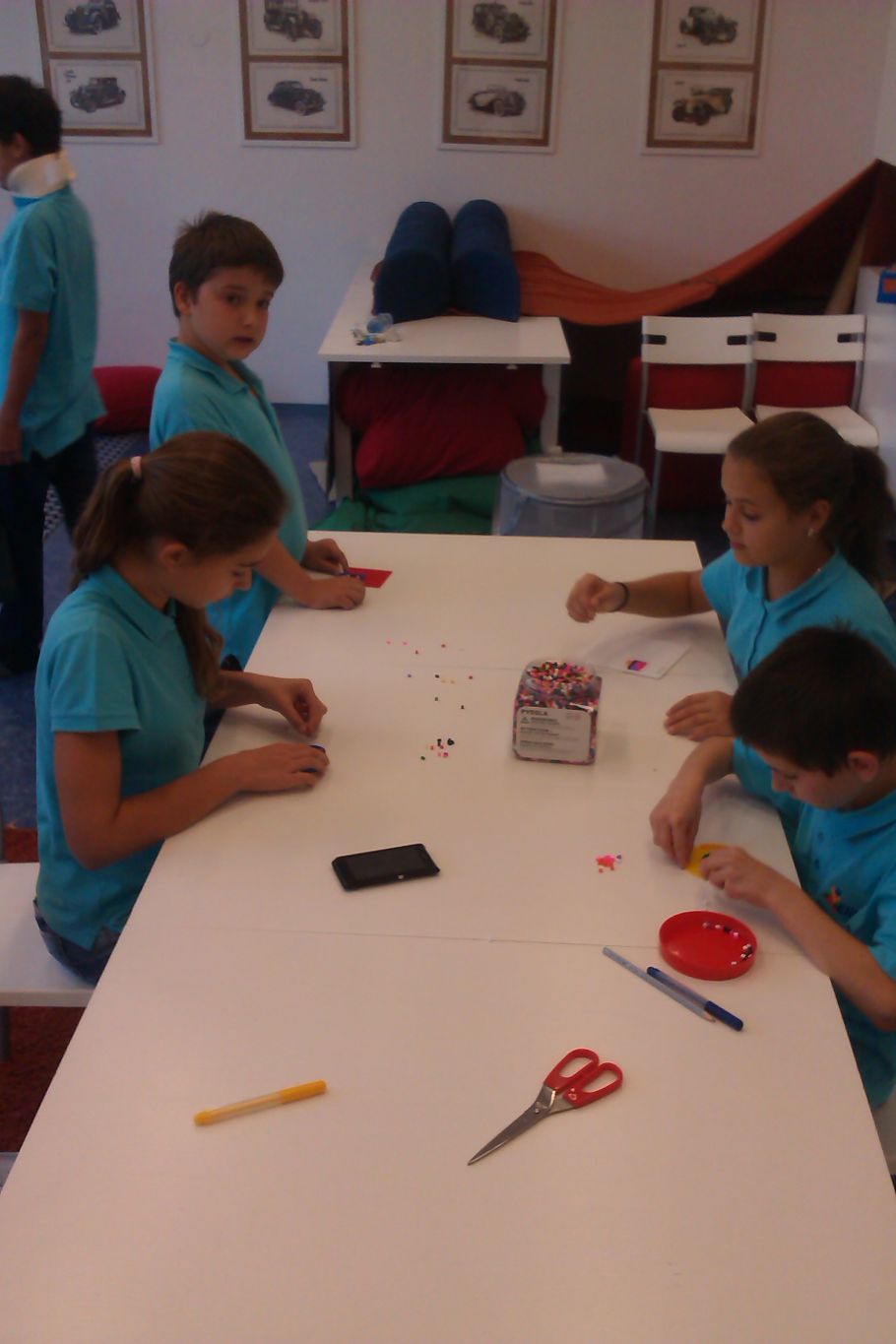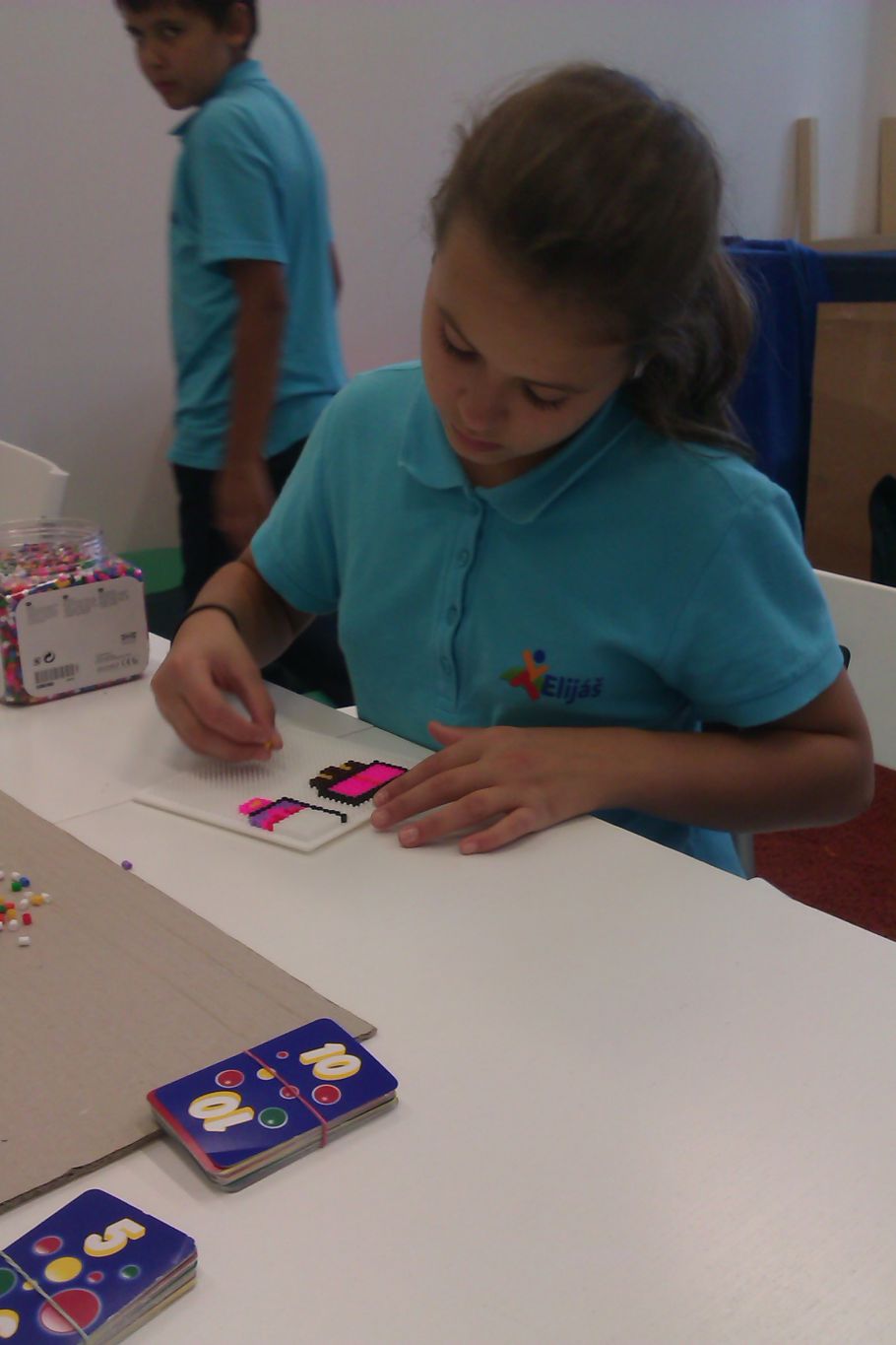Včera jsme zkusili tvořit s paspartou a tavící pistolí. První pokusy nebyly až tak špatné. Dnes jsme odpočívali při žehlení korálkových obrazců. Někteří si zaskočili i na ping-pong anebo si zahráli Ligretto. Ligretto je skvělá postřehová hra. Doporučujeme.