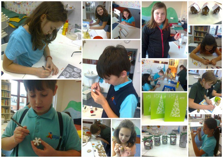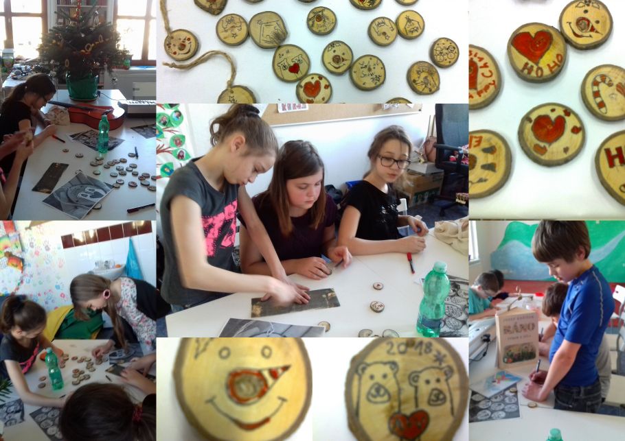 Včera jsme pokreslovali dřevěná kolečka vánočními motivy. Mohou posloužit jako ozdoba, dekorace či knoflík. Dnes jsme je dokončili, dozdobili jsme stromeček a zpívali známé koledy. Někteří skládali korálky. Odpoledne pak zbytek ětí hrál fotbálek ve školním klubu a stolní tenis.