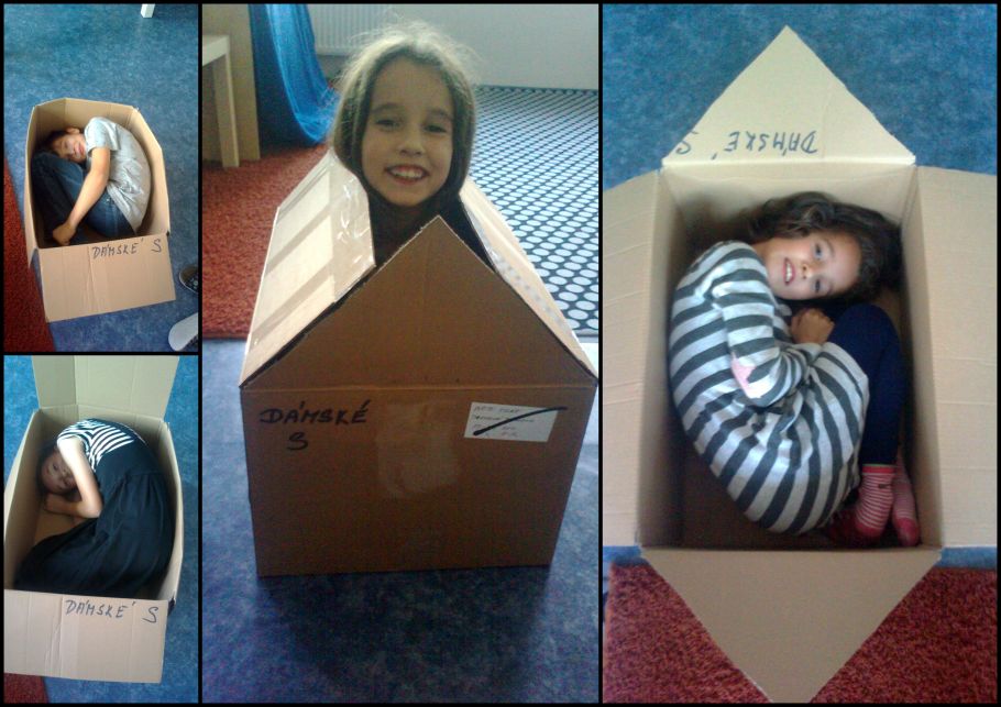 Další koláž prozrazuje opět radost, tentokrát z kartonové krabice. Není to úžasné, že se aspoň na chvíli můžete proměnit na poštovní balík? To je však jenom začátek toho, co se s tou krabicí dá dělat. Sledujte další vydání aktualit.