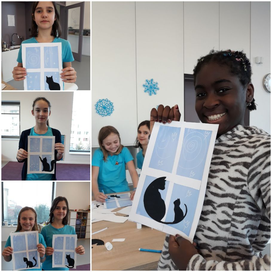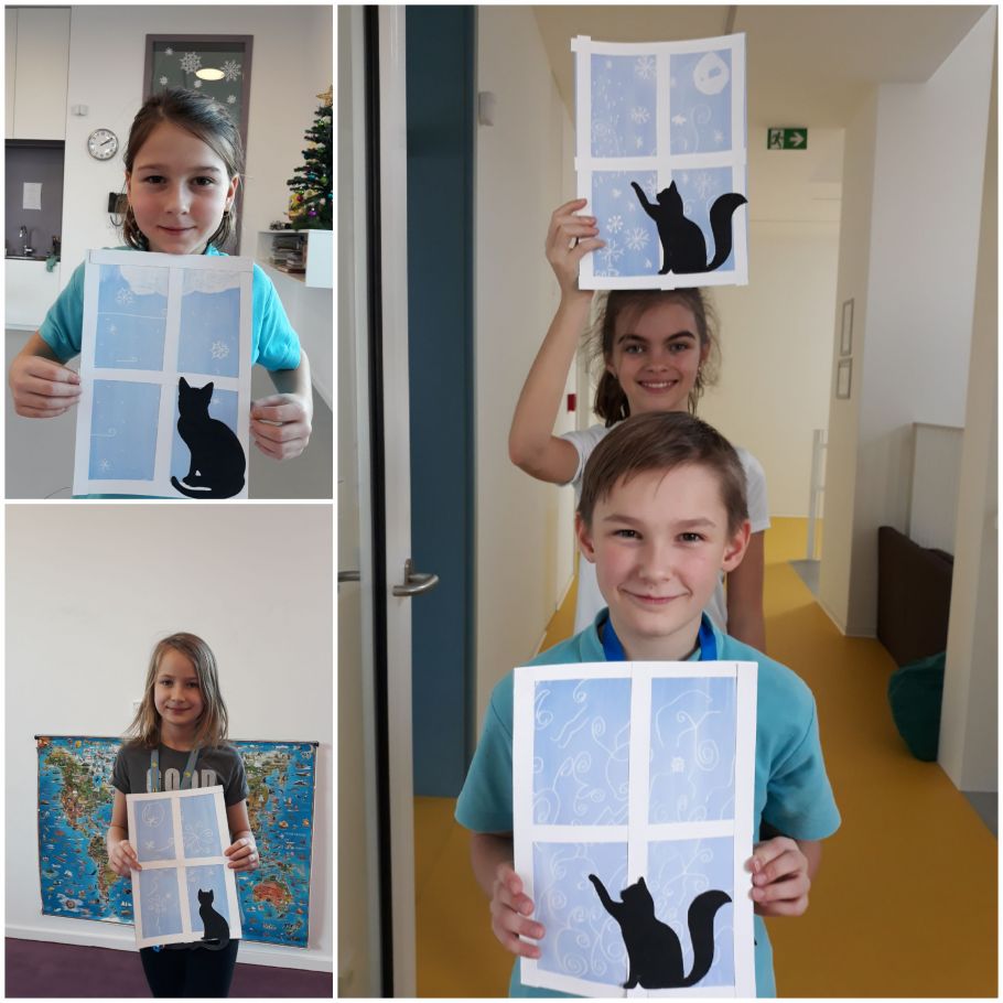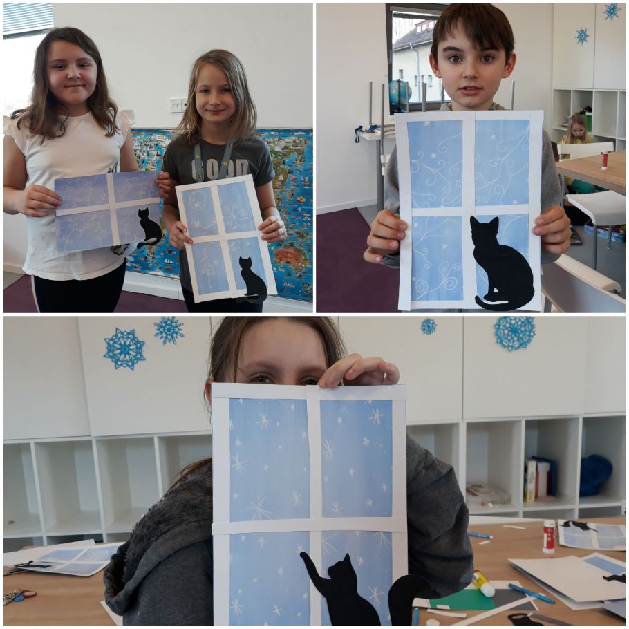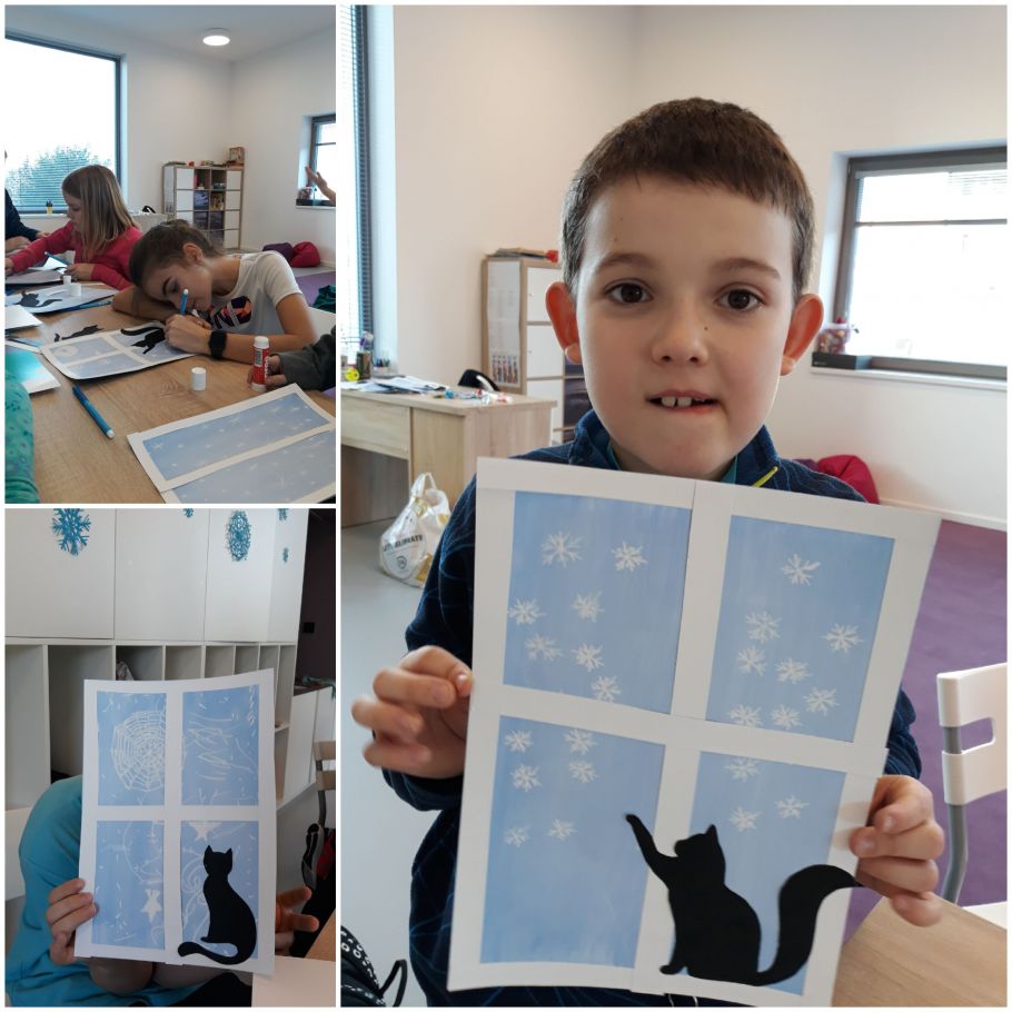 Tím, že nám nepadá sníh, jsme ho nahradili kresbami v družině. Na natřený inkoustem papír děti kreslily vločky, mrazíka, noční oblohu a vítr. Z bílých proužků jsme vytvořily rám okna a z černého papíru tvar kočky. Děti tvořily podle vlastní představy a každému vznikl jiný obrázek.