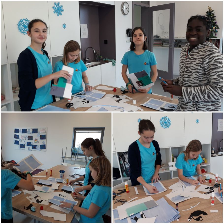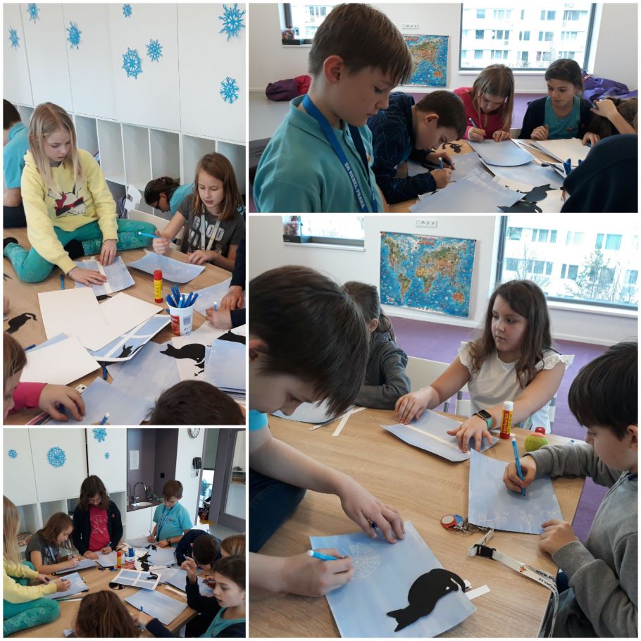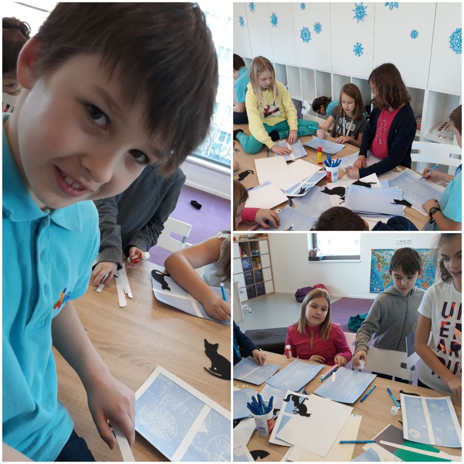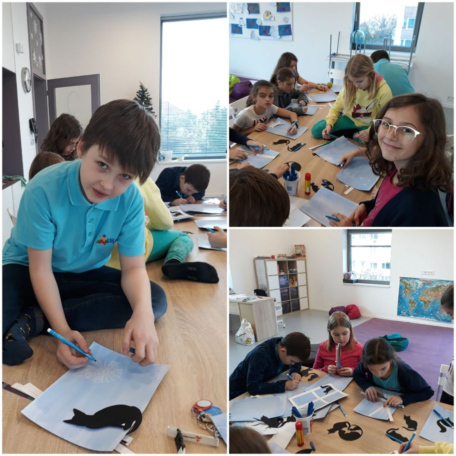 Tím, že nám nepadá sníh, jsme ho nahradili kresbami v družině. Na natřený inkoustem papír děti kreslily vločky, mrazíka, noční oblohu a vítr. Z bílých proužků jsme vytvořily rám okna a z černého papíru tvar kočky. Děti tvořily podle vlastní představy a každému vznikl jiný obrázek.