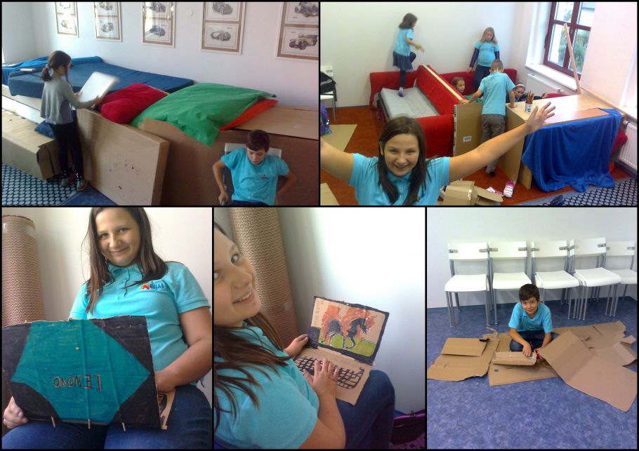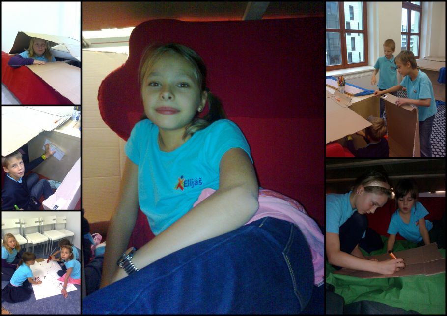 Koláže z družiny představují radost z toho, že konečně si můžeme užívat svou družinu sami. Pro všechny je tady jakoby nutností postavit bunkry pro své party. Tento rok to máme jednoduché. Dvě třídy, dvě party, dva bunkry. Na začátku nás čekala těžká rozepře o rozdělení majetku družiny. Na valné hromadě jsme odhlasovali návrh rozdělení fifty-fifty. Všechno jsme dali na hromadu a pěkně rozdělili madrace, polštáře a deky jedno tomu, jedno tomu. Rozhodli jsme se také, že nebudeme psát inventářní soupisy jednotlivých bunkrů, protože děti se zavázali, že si to nebudou krást. Tím ukončil povyk a svár a nastala nová fáze. Nové bunkry potřebují jména, výzdoby a nevím co ještě, pravidla a platidla atd. No co všechno tuto lidskou společnost napadne, to by jste koukali. Takže máme spoustu práce, baví nás to a je nám spolu fajn.