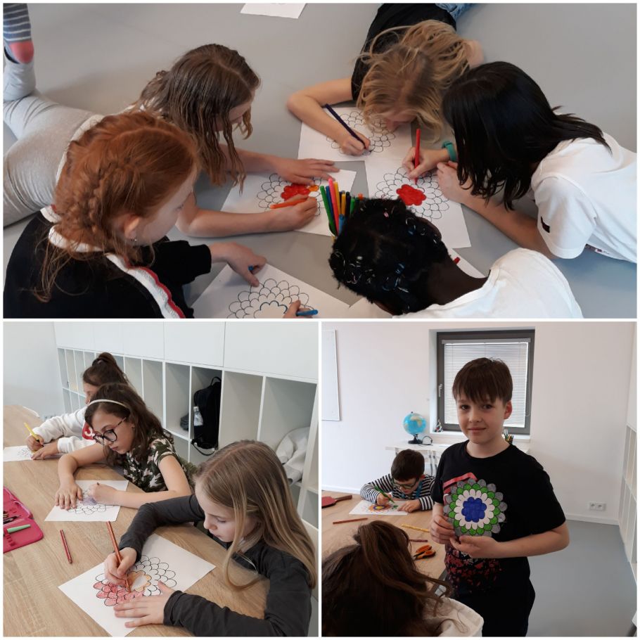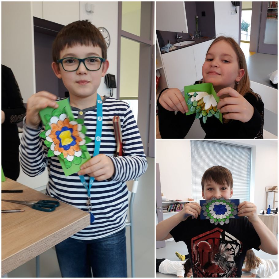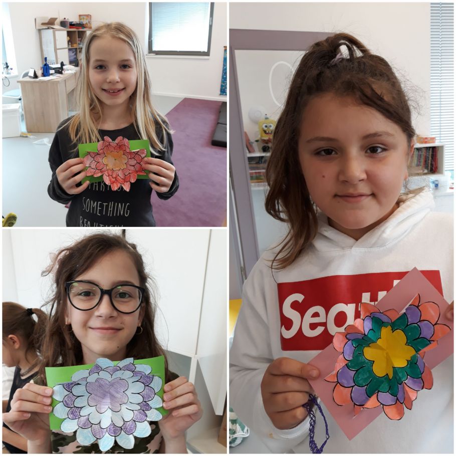 Dnes jsme se pokusili vyrobit květinové origami. Podle toho, jak pečlivě složíme ten obrázek, tak nám vznikne přáníčko s překvapením. Děti s chutí začaly barvit a vystřihovat. S láskou a úsměvem žáci vybarvovali obrovskou kytku pro maminky. Nejen holky mají smysl pro barvy – kluci se také pustili do práce a vymalovali nádherné jiřinky. Skládaní technikou origami potřebuje trpělivost a pečlivost. Komu tyto schopnosti nechyběly, si domů odnesl maličké přáníčko s obrovskou jiřinkou.