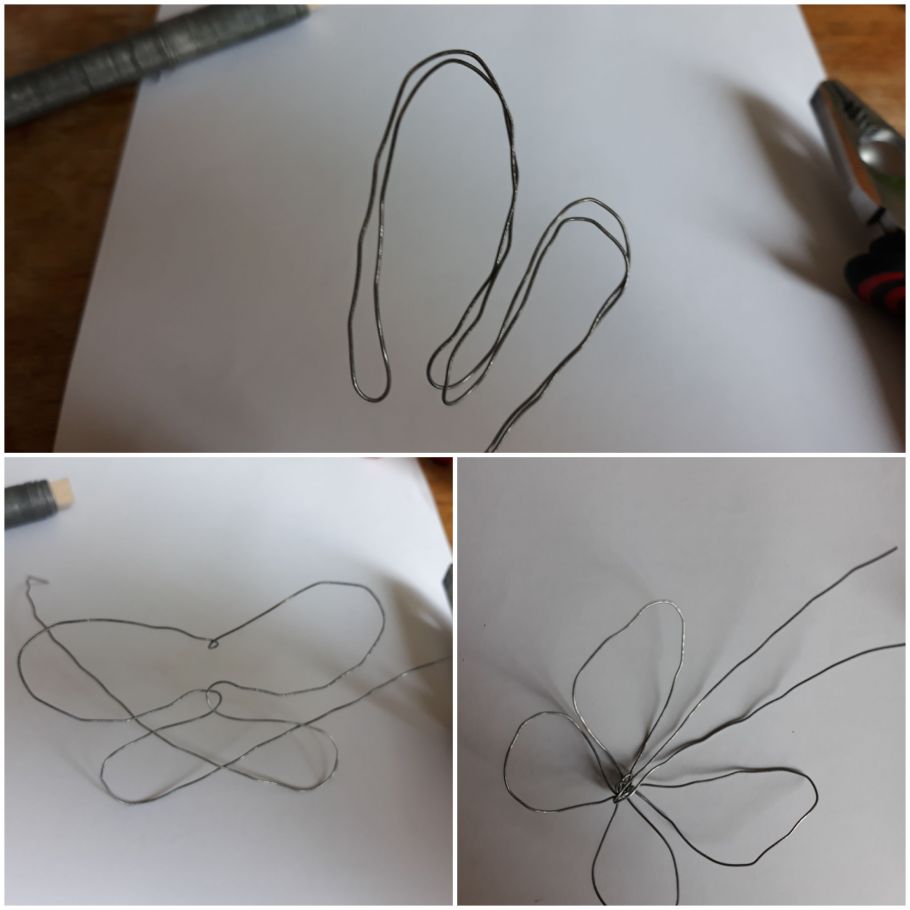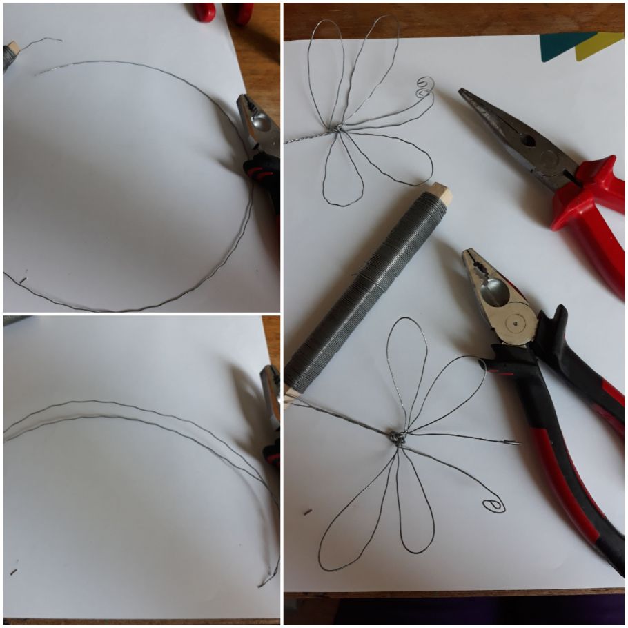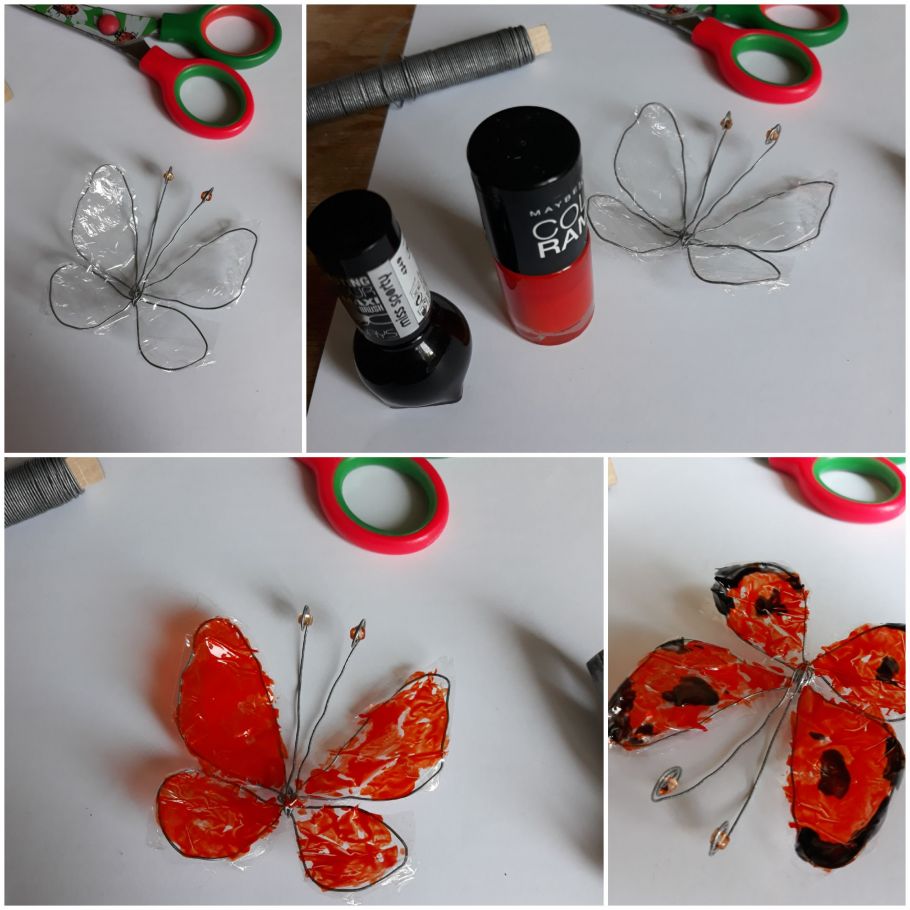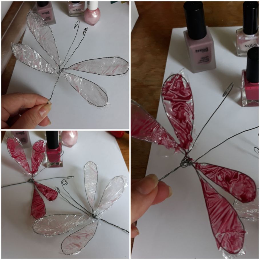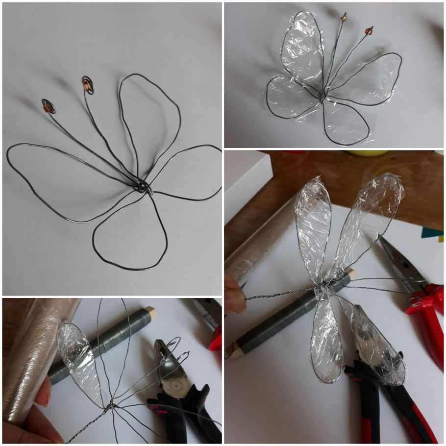 Dnes mě napadlo vytvořit vážku z drátku a křídla udělat z folie na potraviny. Postup je vidět na fotkách. Nejdříve jsem kus drátku asi 30–40 cm složila napůl. Ze složeného drátku jsem ohnula dvě křidýlka. Pak drátek rozložíme a máme čtyři stejné velikosti a formy křídla. Konečkem drátku jsem upletla tělo hmyzu a vytvořila tykadla. Křídla jsem omotala potravinovou folií a zamalovala lakem na nehty. Pokud máte jiné barvy a možná i třpytky, tak klidně ozdobte křídla podle sebe. Já jsem vypletla dvě vážky a jednoho motýlka. Můžete je pověsit u postýlky nebo na okno.