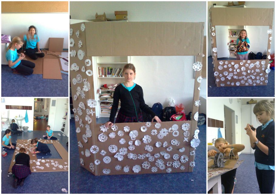 Karton je vynikající materiál pro tvorbu malých modelů domečků, a také velikých stánků na vánoční jarmark, které jsme tento týden vyzdobili. Do tohoto druhu práce se zapojují hlavně děvčata. Učí se tvořivé práci s dlouhodobým cílem. Některé díla budou opravdu unikátní.
