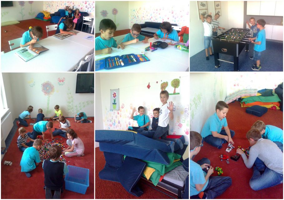Možná takto by se dalo vyjádřit to, co se děje v naší družině. Třicet lidiček ze tří tříd rozprostřených asi na sto metrech čtverečních. Každý hledá svůj koutek, nějaké to místečko, kde by mohl najít svůj klid a soukromí. Děvčata z pětky pravidelně kempují na chodbě. Někdy se utrhne skupinka a jde vedle do klubu. Po koutech, pod stolem, všude, kde to jde sedí děti a svým způsobem odpočívají. Někdo si čte, někdo se vyvaluje a povídá, někdo si hraje s něčím, co si přinesl z domu, nebo se de rovnou na věc tvořit.