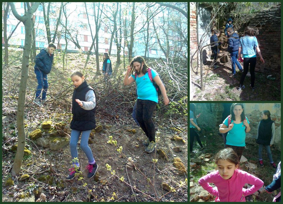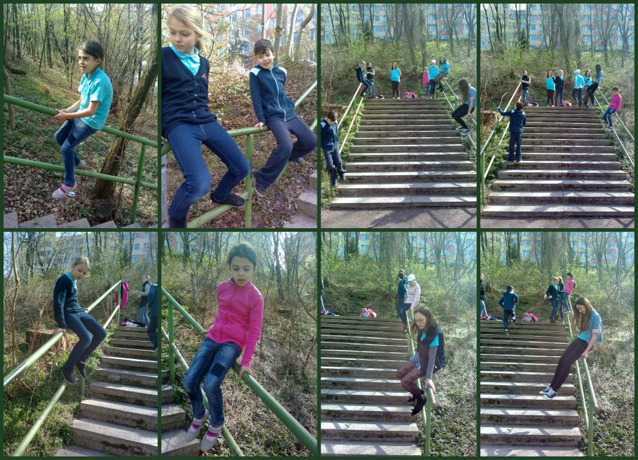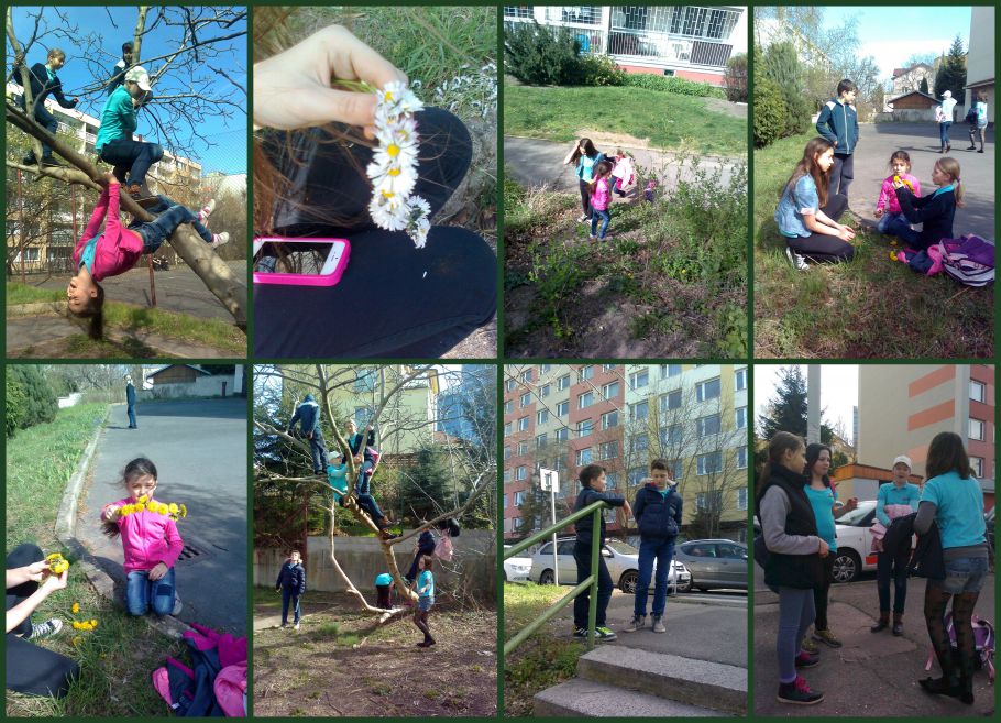 Jaro nás táhne ven. Byli jsme na procházce v blízkém okolí školy. Našli jsme dvůr, který v nás vyvolával pocit z doby Rychlých šípů. Některé děti to zasáhlo do srdce. Sdíleli svá přání po bunkru nebo takové neoficiální klubovně. Je v tom kus touhy po svobodě a dobrodružství. Inspirací pro zábavu je cokoliv: zábradlí na schodech, jarní květiny, uschlé větve, husté porosty křoví a stromů. Vylézt na strom, houpat se ve větvích, a přitom se smát bylo tak příjemné.