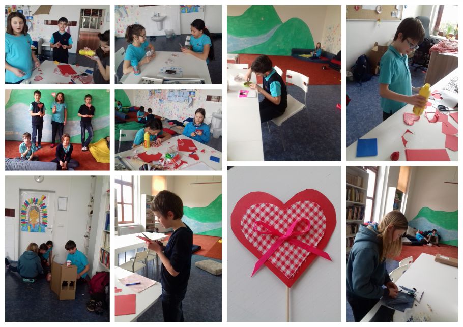Tento týden jsme si po obědě zase četli z naší dobrodružné knížky, bylo to o přátelství i zradě, no bylo o čem povídat. Děvčata stále něco šijí, různé kapsičky, taštičky a kluci už by potřebovali běhat na sluníčku, tak hrají aspoň různé pohybové hry jak ZEMĚ LÁVA, BAŽINA A JINÉ. Ale včera jsme se všichni pustili do vyrábění srdíček pro maminky k MDŽ protože maminky jsou úžasné a chceme je potěšit.