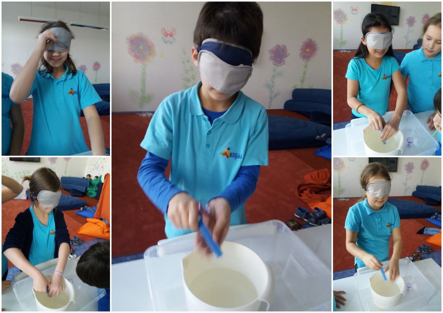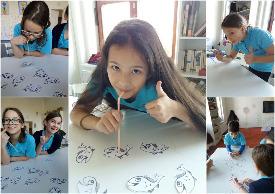A protože k Vánocům patří i ryba, zkoušeli jsme svým dechem přenášet rybky z jednoho rybníčku do druhého a nalévat do malé skleničky přípitek poslepu...