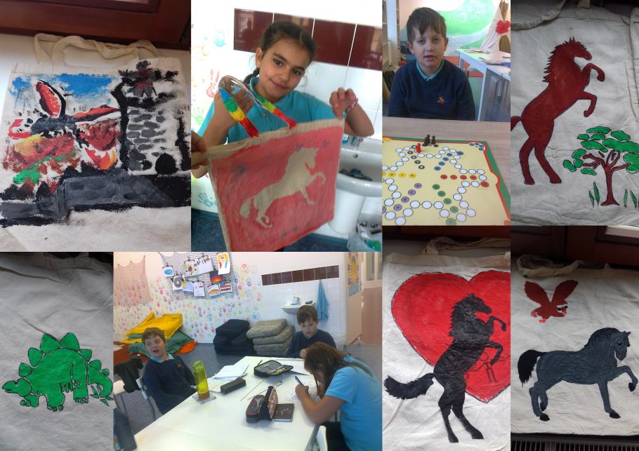V minulém týdnu se ta naše kreativita soustředila hlavně na malování barvami na textil. Namalovali jsme si všichni přítomní plátěnou tašku. Chodili jsme hodně ven, dokud nám počasí přeje, taky jsme už věnovali šas i psaní úkolů. Naučili jsme se novou stolní hru Krycí jména a natrénovali slovní zásobu. Zbyl čas i na člověče nezlob se a na obyčejné povídání a lebedění v Tee-pee nebo na pytlích.