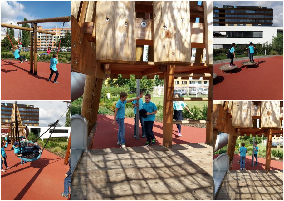 Protože bylo krásné podzimní počasí vyrazili jsme na nedaleké hřiště. Děti si užívaly, nestabilních ploch, kde poznávaly jaký je rozdíl, když je něco pevné a něco na lanech nebo pružinách.