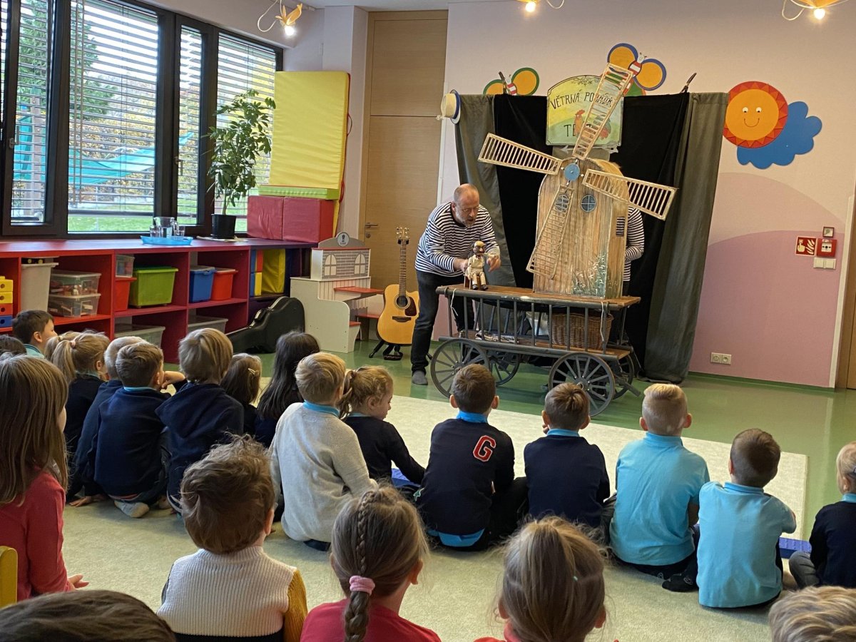 Minulý týden jsme si opět pozvali do školky autorské divadlo Pavla Šmída, který si pro nás tentorkát se svým synem představil humorný (a zároveň poučný) příběh o dětech od větrného mlýna, které se vydaly hledat do světa krále větru. Představení bylo doplněné o veselé písničky a hádanky, na které jsme všichni našli odpověd na konci příběhu :-) Na představení jsme pozvali i prvňáčky a druháčky ze školy, aby se potěšili s námi :-)